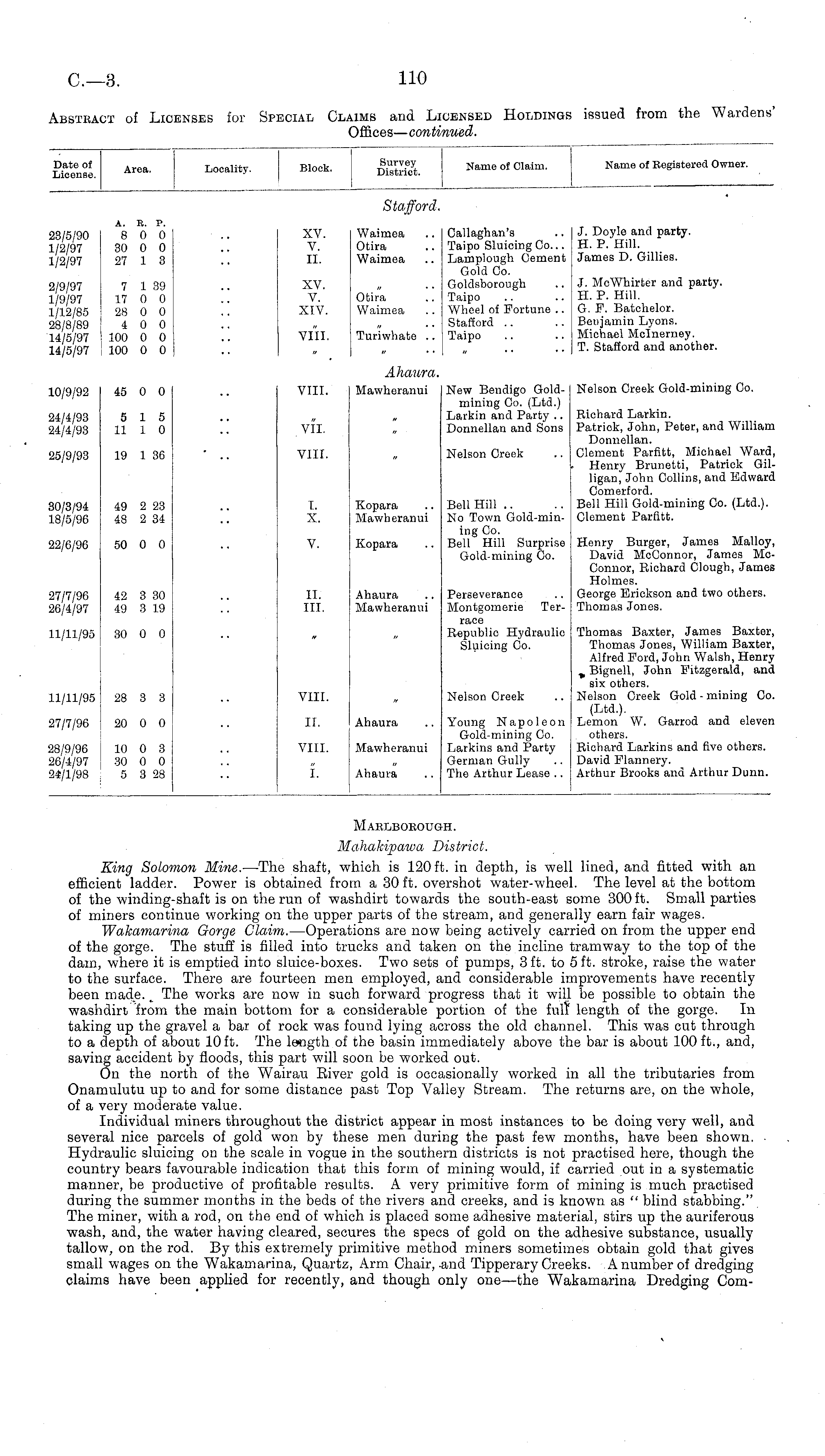 Date of License. Area. Locality. Block. Survey District. Name of Claim. Name of Registered Owner. Stafford. 23/5/90 1/2/97 1/2/97 A. R. P. 8 0 0 30 0 0 27 1 3 XV. V. II. Waimea Otira Waimea Callaghan's Taipo Sluicing Co... Lamplough Cement Gold Co. Goldsborough Taipo Wheel of Fortune .. Stafford Taipo J. Doyle and party. H. P. Hill. James D. Gillies. 2/9/97 1/9/97 1/12/85 28/8/89 14/5/97 14/5/97 7 1 39 17 0 0 28 0 0 4 0 0 100 0 0 100 0 0 XV. V. XIV. Otira Waimea J. McWhirter and party. H. P. Hill. G. F. Batchelor. Benjamin Lyons. Michael Mclnerney. T. Stafford and another. viii. Turiwhate .. Ahaura. New Bendigo Goldmining Co. (Ltd.) Larkin and Party .. Donnellan and Sons Nelson Creek Gold-mining Co. 10/9/92 45 0 0 VIII. Mawheranui 24/4/93 24/4/93 25/9/93 5 15 11 1 0 19 1 36 VII. VIII. Nelson Creek Richard Larkin. Patrick, John, Peter, and William Donnellan. Clement Parfitt, Michael Ward, Henry Brunetti, Patrick Gilligan, John Collins, and Edward Comerford. Bell Hill Gold-mining Co. (Ltd.). Clement Parfitt. 30/3/94 18/5/96 49 2 23 48 2 34 I. X. Kopara Mawheranui Bell Hill No Town Gold-min-ing Co. Bell Hill Surprise Gold-mining Co. 22/6/96 27/7/96 26/4/97 50 0 0 42 3 30 49 3 19 V. II. III. Kopara Ahaura Mawheranui Henry Burger, James Malloy, David McConnor, James McConnor, Richard Clough, James Holmes. George Erickson and two others. Thomas Jones. 11/11/95 30 0 0 Perseverance Montgornerie Terrace Republic Hydraulic Sluicing Co. Thomas Baxter, James Baxter, Thomas Jones, William Baxter, Alfred Ford, John Walsh, Henry > Bignell, John Fitzgerald, and six others. Nelson Creek Gold - mining Co. (Ltd.). Lemon W. Garrod and eleven others. Richard Larkins and five others. David Flannery. Arthur Brooks and Arthur Dunn. 28 3 3 VIII. Nelson Creek 11/11/95 !7/7/96 20 0 0 II. Ahaura Young Napoleon Gold-mining Co. Larkins and Party German Gully The Arthur Lease .. 18/9/96 26/4/97 14/1/98 10 0 3 30 0 0 5 3 28 VIII. i. Mawheranui Ahaura