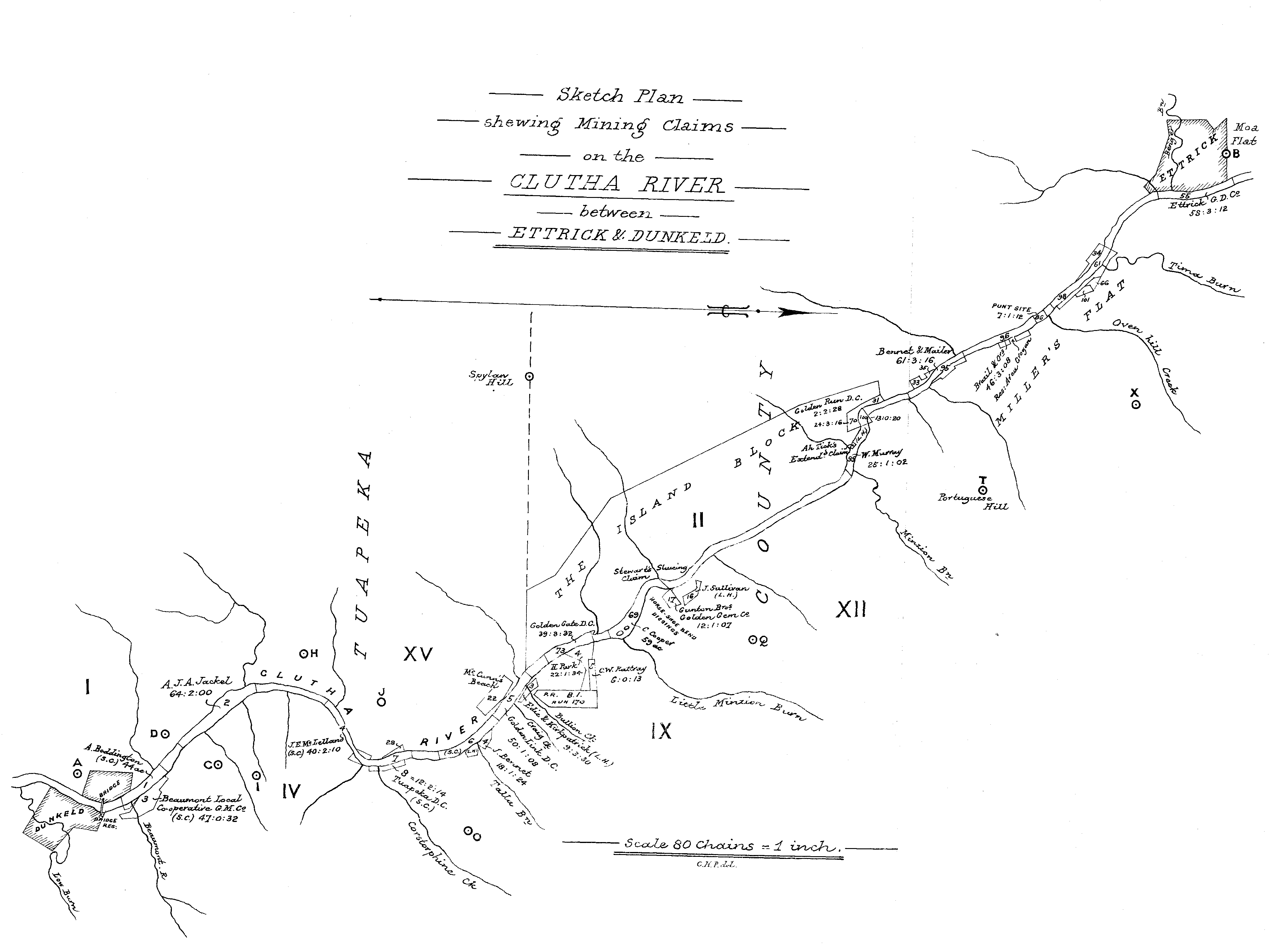 Sketch Plan shewing Mining Claims on the CLUTHA RIVER between ETTRICK & DUNKELD.