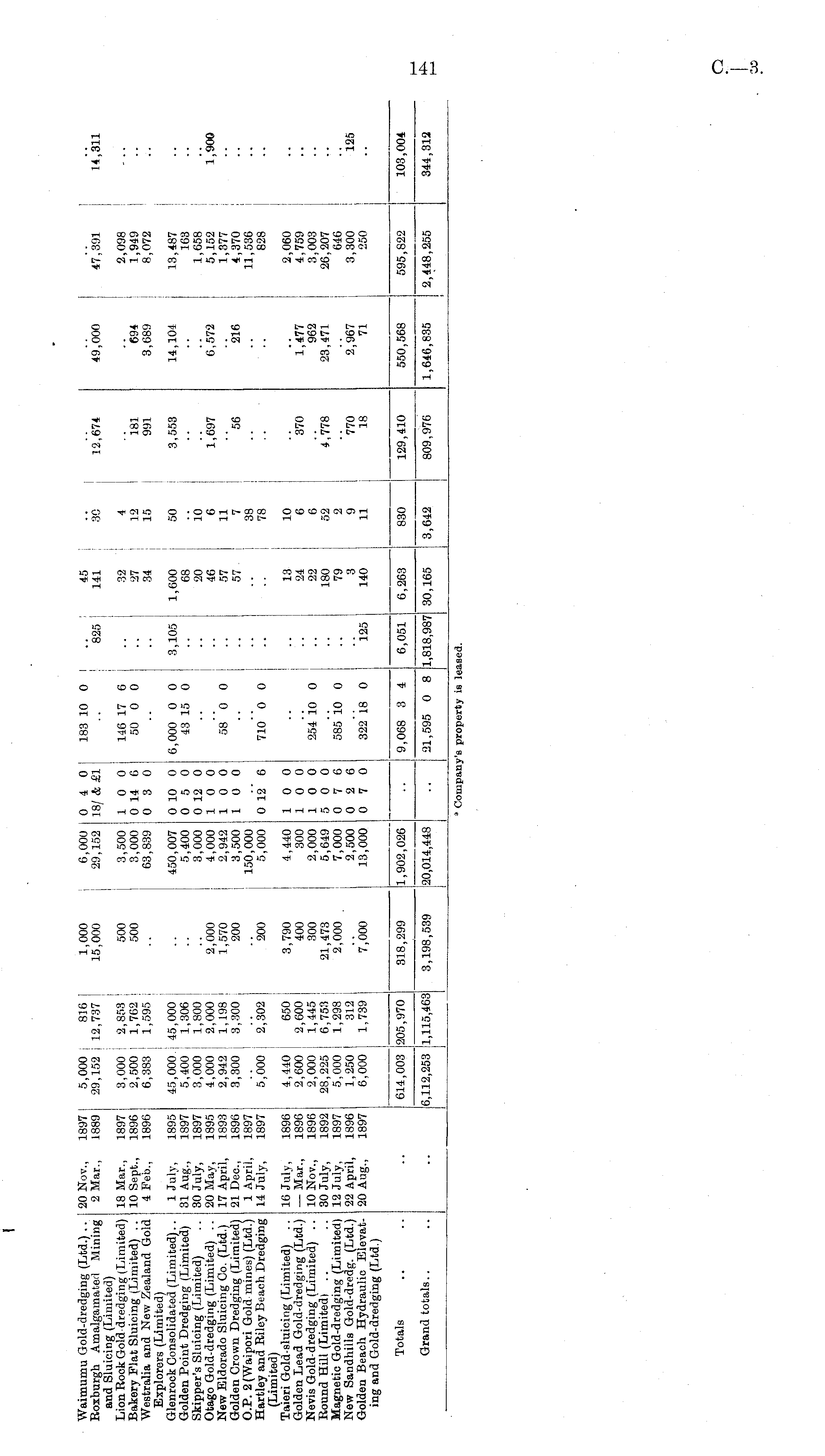 Waimumu Gold-dredging (Ltd.) .. Roxburgh Amalgamated Mining and Sluicing (Limited) Lion Rock Gold dredging (Limited) Bakery Plat Sluicing (Limited) .. Westralia and New Zealand Gold Explorers (Limited) Glenrock Consolidated (Limited).. Golden Point Dredging (Limited) Skipper's Sluicing (Limited) Otago Gold-dredging (Limited) .. New Eldorado Sluicing Co. (Ltd.) Golden Crown Dredging (Limited) O.P. 2 (Waipori Gold mines) (Ltd.) Hartley and Riley Beach Dredging (Limited) Taieri Gold-sluicing (Limited) Golden Lead Gold-dredging (Ltd.) Nevis Gold-dredging (Limited) .. Round Hill (Limited) Magnetic Gold-dredging (Limited) New Sandhills Gold-dredg. (Ltd.) Golden Beach Hydraulic Elevating and Gold-dredging (Ltd.) 20 Nov., 2 Mar., 18 Mar., 10 Sept., 4 Feb.. 1 July, 31 Aug., 30 July, 20 May, 17 April, 21 Dec, 1 April, 14 July, 1897 1889 1897 1896 1896 1895 1897 1897 1895 1893 1896 1897 1897 5,000 I 816 29,152 i 12,737 3,000 ; 2,853 2,500 1,762 6,383 ! 1,595 45,000 . 45,000 5,400 i 1,306 3,000 1,800 4,000 2,000 2,942 1,198 ' 3,300 | 3,300 5*000 i 2*302 1,000 15,000 500 500 2,000 1.570 200 200 6,000 29,152 3,500 3,000 63,839 450,007 5,400 3,000 4,000 2,942 3,500 150,000 5,000 0 4 0 18/ & £1 10 0 0 14 6 0 3 0 0 10 0 0 5 0 0 12 0 10 0 10 0 1 0 0 183 10 0 I 146 17 6 50 0 0 6,000 0 0 43 15 0 58 0 0 *825 3,105 45 141 32 27 34 1,600 68 20 46 57 57 13 24 22 180 79 3 140 30 4 12 15 50 10 6 11 7 38 78 10 6 6 52 2 9 11 12,674 181 991 3,553 1,697 *56 370 4,778 770 18 49,000 694 3,689 14,104 6*572 216 1,477 962 23,471 2,967 71 47,391 2,098 1,949 8,072 13,487 163 1,658 5,152 1,377 4,370 11,536 828 2,060 4,759 3,003 26,207 646 3,300 250 14*311 i 1*900 125 0 12 6 710 0 0 16 July, — Mar., 10 Nov., 30 July, 12 July, 22 April, 20 Aug., 1896 1896 1896 1892 1897 1896 1897 4,440 650 2,600 2,600 2,000 1,445 28,225 6,753 5.000 j 1,298 1,250 312 6,000 ! 1,739 3,790 400 300 21,473 2,000 7,000 4,440 300 2,000 5,649 7,000 2,500 13,000 10 0 10 0 10 0 5 0 0 0 7 6 0 2 6 0 7 0 254 10 0 585 10 0 •• 322* 18 0 125 Totals 614,003 205,970 314,003 205,970 318,299 1,902,026 9,068 3 4 6,051 6,263 30,165 830 3,642 129,410 809,976 550,568 1,646,835 595,822 2,448,255 103,004 344,312 318,299 ■• Grand totals.. 6,112,253 1,115,463 3,198,539 20,014,448 21,595 0 8 1,818,987 30,165 :> Company's property is leased.