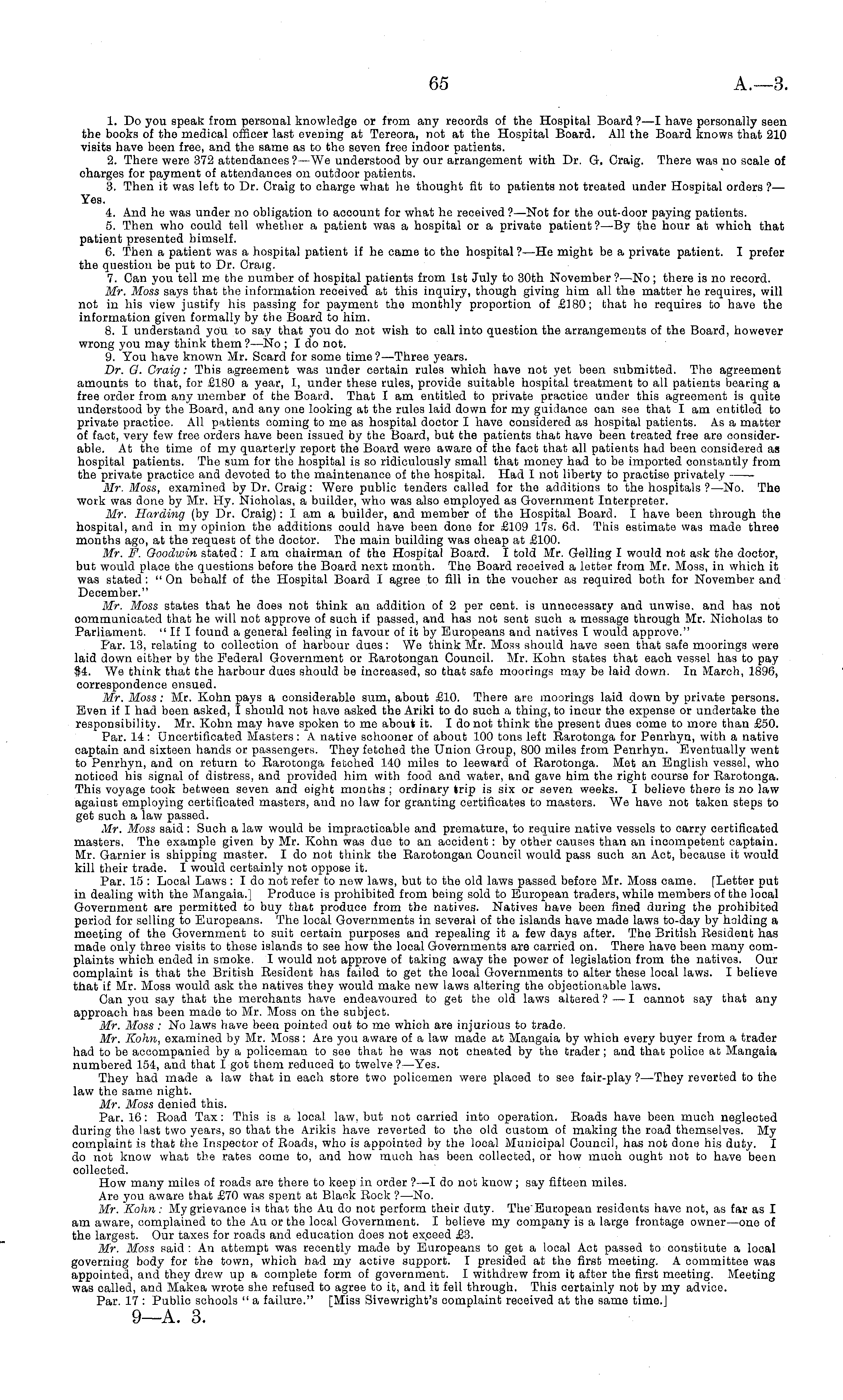 1. Do you speak from personal knowledge or from any records of the Hospital Board ? —I have personally seen the books of the medical officer last evening at Tereora, not at the Hospital Board. All the Board knows that 210 visits have been free, and the same as to the seven free indoor patients. 2. There were 372 attendances ? —We understood by our arrangement with Dr. G. Craig. There was no scale of charges for payment of attendances on outdoor patients. 3. Then it was left to Dr. Craig to charge what he thought fit to patients not treated under Hospital orders ?— Yes. 4. And he was under no obligation to account for what he received ?—Not for the out-door paying patients. 5. Then who could tell whether a patient was a hospital or a private patient?—By the hour at which that patient presented himself. 6. Then a patient was a hospital patient if he came to the hospital ?—He might be a private patient. I prefer the question be put to Dr. Craig. 7. Can you tell me the number of hospital patients from Ist July to 30th November?—No; there is no record. Mr. Moss says that the information received at this inquiry, though giving him all the matter he requires, will not in his view justify his passing for payment the monthly proportion of £180; that he requires to have the information given formally by the Board to him. 8. I understand you to say that you do not wish to call into question the arrangements of the Board, however wrong you may think them ?—No ; I do not. 9. You have known Mr. Scard for some time?— Three years. Dr. G. Craig: This agreement was under certain rules which have not yet been submitted. The agreement amounts to that, for £180 a year, I, under these rules, provide suitable hospital treatment to all patients bearing a free order from any member of the Board. That I am entitled to private practice under this agreement is quite understood by the Board, and any one looking at the rules laid down for my guidance can see that I am entitled to private practice. AH patients coming to me as hospital doctor I have considered as hospital patients. As a matter of fact, very few free orders have been issued by the Board, but the patients that have been treated free are considerable. At the time of my quarterly report the Board were aware of the fact that all patients had been considered as hospital patients. The sum for the hospital is so ridiculously small that money had to be imported constantly from the private practice and devoted to the maintenance of the hospital. Had I not liberty to practise privately Mr. Moss, examined by Dr. Craig: Were public tenders called for the additions to the hospitals ?—No. The work was done by Mr. Hy. Nicholas, a builder, who was also employed as Government Interpreter. Mr. Harding (by Dr. Craig) : I am a builder, and member of the Hospital Board. I have been through the hospital, and in my opinion the additions could have been done for £109 17s. 6d. This estimate was made three months ago, at the request of the doctor. The main building was cheap at £100. Mr. F. Goodwin stated: lam chairman of the Hospital Board. I told Mr. Gelling I would not ask the doctor, but would place the questions before the Board next month. The Board received a letter from Mr. Moss, in which it was stated : " On behalf of the Hospital Board I agree to fill in the voucher as required both for November and December." Mr. Moss states that he does not think an addition of 2 per cent, is unnecessary and unwise, and has not communicated that he will not approve of such if passed, and has not seat such a message through Mr. Nicholas to Parliament. "If I found a general feeling in favour of it by Europeans and natives I would approve." Far. 13, relating to collection of harbour dues: We think Mr. Moss should have seen that safe moorings were laid down either by the Federal Government or Earotongan Council. Mr. Kohn states that each vessel has to pay $4. We think that the harbour dues should be increased, so that safe moorings may be laid down. In March, 1896, correspondence ensued. Mr. Moss: Mr. Kohn pays a considerable sum, about £10. There are moorings laid down by private persons. Even if I had been asked, I should not have asked the Ariki to do such a thing, to incur the expense or undertake the responsibility. Mr, Kohn may have spoken to me about it. Ido not think the present dues come to more than £50. Par. 14: Uncertificated Masters: A native schooner of about 100 tons left Rarotonga for Penrhyn, with a native captain and sixteen hands or passengers. They fetched the Union Group, 800 miles from Penrhyn. Eventually went to Penrhyn, and on return to Rarotonga fetched 140 miles to leeward of Rarotonga. Met an English vessel, who noticed his signal of distress, and provided him with food and water, and gave him the right course for Rarotonga. This voyage took between seven and eight months ; ordinary trip is six or seven weeks. I believe there is no law against employing certificated masters, and no law for granting certificates to masters. We have not taken steps to get such a law passed. Mr. Moss said : Such a law would be impracticable and premature, to require native vessels to carry certificated masters. The example given by Mr. Kohn was due to an accident: by other causes than an incompetent captain. Mr. Gamier is shipping master. I do not think the Rarotongan Council would pass such an Act, because it would kill their trade. I would certainly not oppose it. Par. 15 : Local Laws :I do not refer to new laws, but to the old laws passed before Mr. Moss came. [Letter put in dealing with the Mangaia.] Produce is prohibited from being sold to European traders, while members of the local Government are permitted to buy that produce from the natives. Natives have been fined during the prohibited period for selling to Europeans. The local Governments in several of the islands have made laws to-day by holding a meeting of the Government to suit certain purp