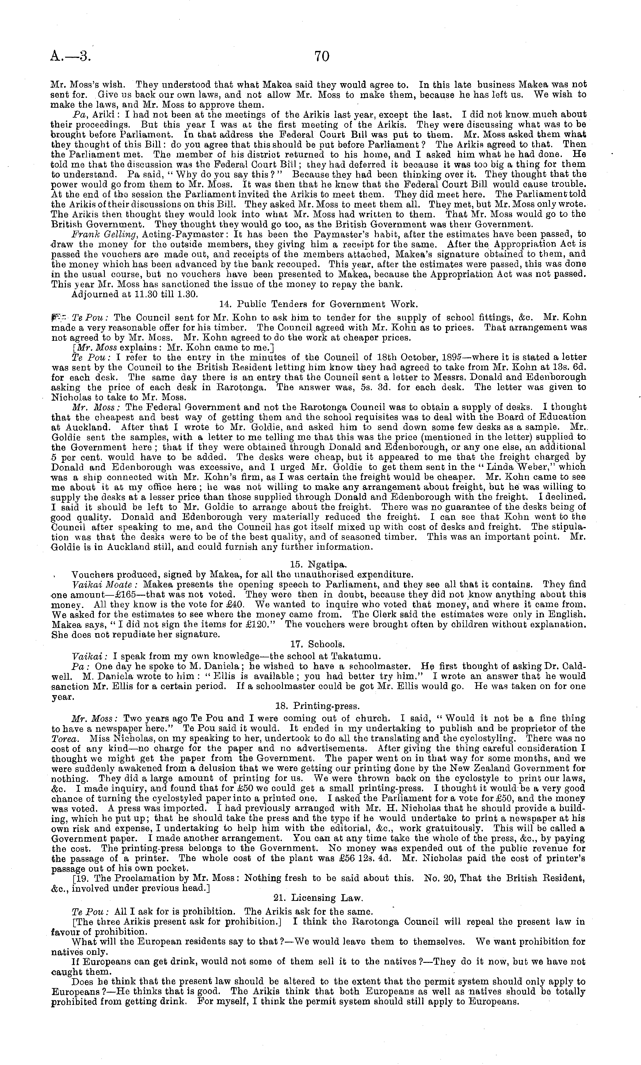 Mr. Moss's wish. They understood that what Makea said they would agree to. In this late business Makea was not sent for. Give us back our own laws, and not allow Mr. Moss to make them, because he has left us. We wish to make the laws, and Mr. Moss to approve them. Pα, Ariki: I had not been at the meetings of the Arikis last year, except the last. I did not know much about their proceedings. But this year I was at the first meeting of the Arikis. They were discussing what was to be brought before Parliament. In that address the Federal Court Bill was put to them. Mr. Moss asked them what they thought of this Bill: do you agree that this should be put before Parliament ? The Arikis agreed to that. Then the Parliament met. The member of his discriot returned to his home, and I asked him what be had done. He told me that the discussion was the Federal Court Bill; they had deferred it because it was too big a thing for them to understand. Pa said, " Why do you say this ? " Because they had been thinking over it. They thought that the power would go from them to Mr. Moss. It was then that he knew that the Federal Court Bill would cause trouble. At the end of the session the Parliament invited the Arikis to meet them. They did meet here. The Parliament told the Arikis of their discussions on this Bill. They asked Mr. Moss to meet them all. They met, but Mr. Moss only wrote. The Arikis then thought they would look into what Mr. Moss had written to them. That Mr. Moss would go to the British Government. They thought they would go too, as the British Government was their Government. Frank Gelling, Acting-Paymaster: It has been the Paymaster's habit, after the estimates have been passed, to draw the money for the outside members, they giving him a receipt for the same. After the Appropriation Act is passed the vouchers are made out, and receipts of the members attached, Makea , s signature obtained to them, and the money which has been advanced by the bank recouped. This year, after the estimates were passed, this was done in the usual course, but no vouchers have been presented to Makea, because the Appropriation Act was not passed. This year Mr. Moss has sanctioned the issue of the money to repay the bank. Adjourned at 11.30 till 1.30. 14. Public Tenders for Government Work. jF-~ TePou: The Council sent for Mr. Kohn to ask him to tender for the supply of school fittings, &c. Mr. Kohn made a very reasonable offer for his timber. The Council agreed witli Mr. Kohn as to prices. That arrangement was not agreed to by Mr. Moss. Mr. Kohn agreed to do the work at cheaper prices. [Mr. Moss explains : Mr. Kohn came to me.] Te Poll: I refer to the entry in the minutes of the Council of 18th October, 1895 —where it is stated a letter was sent by the Council to the British Resident letting him know they had agreed to tako from Mr. Kohn at 13s. 6d. for each desk. The same day there is an entry that the Council sent a letter to Messrs. Donald and Bdenborough asking the price of each desk in Rarotonga. The answer was, ss. 3d. for each desk. The letter was given to Nicholas to take to Mr. Moss. Mr. Moss: The Federal Government and not the Rarotonga Council was to obtain a supply of desks. I thought that the cheapest and best way of getting them and the school requisites was to deal with the Board of Education at Auckland. After that I wrote to Mr. Goldie, and asked him to send down some few desks as a sample. Mr. Goldie sent the samples, with a letter to me telling me that this was the price (mentioned in the letter) supplied to the Government here ; that if they were obtained through Donald and Bdenborough, or any one else, an additional 5 per cent, would have to be added. The desks were cheap, but it appeared to me that the freight charged by Donald and Edenborough was excessive, and I urged Mr. Goldie to get them sent in the " Linda Weber," which was a ship connected with Mr. Kohn's firm, as I was certain the freight would be cheaper. Mr. Kohn came to see me about it at my office here ; he was not willing to make any arrangement about freight, but he was willing to supply the desks at a lesser price than those supplied through Donald and Bdenborough with the freight. I declined. I said it should be left to Mr. Goldie to arrange about the freight. There was no guarantee of the desks being of good quality. Donald and Edenborough very materially reduced the freight. I can see that Kohn went to the Council after speaking to me, and the Council has got itself mixed up with cost of desks and freight. The stipulation was that the desks were to be of the best quality, and of seasoned timber. This was an important point. Mr. Goldie is in Auckland still, and could furnish any further information. 15. Ngatipa. Vouchers produced, signed by Makea, for all the unauthorised expenditure. Vaikai Moate : Makea presents the opening speech to Parliament, and they see all that it contains. They find one amount—£l65 —that was not voted. They were then in doubt, because they did not know anything about this money. All they know is the vote for £40. We wanted to inquire who voted that money, and where it came from. We asked for the estimates to see where the money came from. The Clerk said the estimates were only in English. Makea says, " I did not sign the items for £120." The vouchers were brought often by children without explanation. She does not repudiate her signature. 17. Schools. Vaikai: I speak from my own knowledge—the school at Takatumu. Pα: One day he spoke to M. Daniela; he wished to have a schoolmaster. He first thought of asking Dr. Caldwell. M. Daniela wrote to him : " Ellis is available ; you had better try him." I wrote an answer that he would sanction Mr. Ellis for a certain period. If a schoolmaster could be got Mr. Ellis would go. He was taken on for one year. 18. Printing-press. Mr. Moss: Two years ago Te Pou and I were coming out of church. I said, " Would it not be a fine thing to have a newspaper