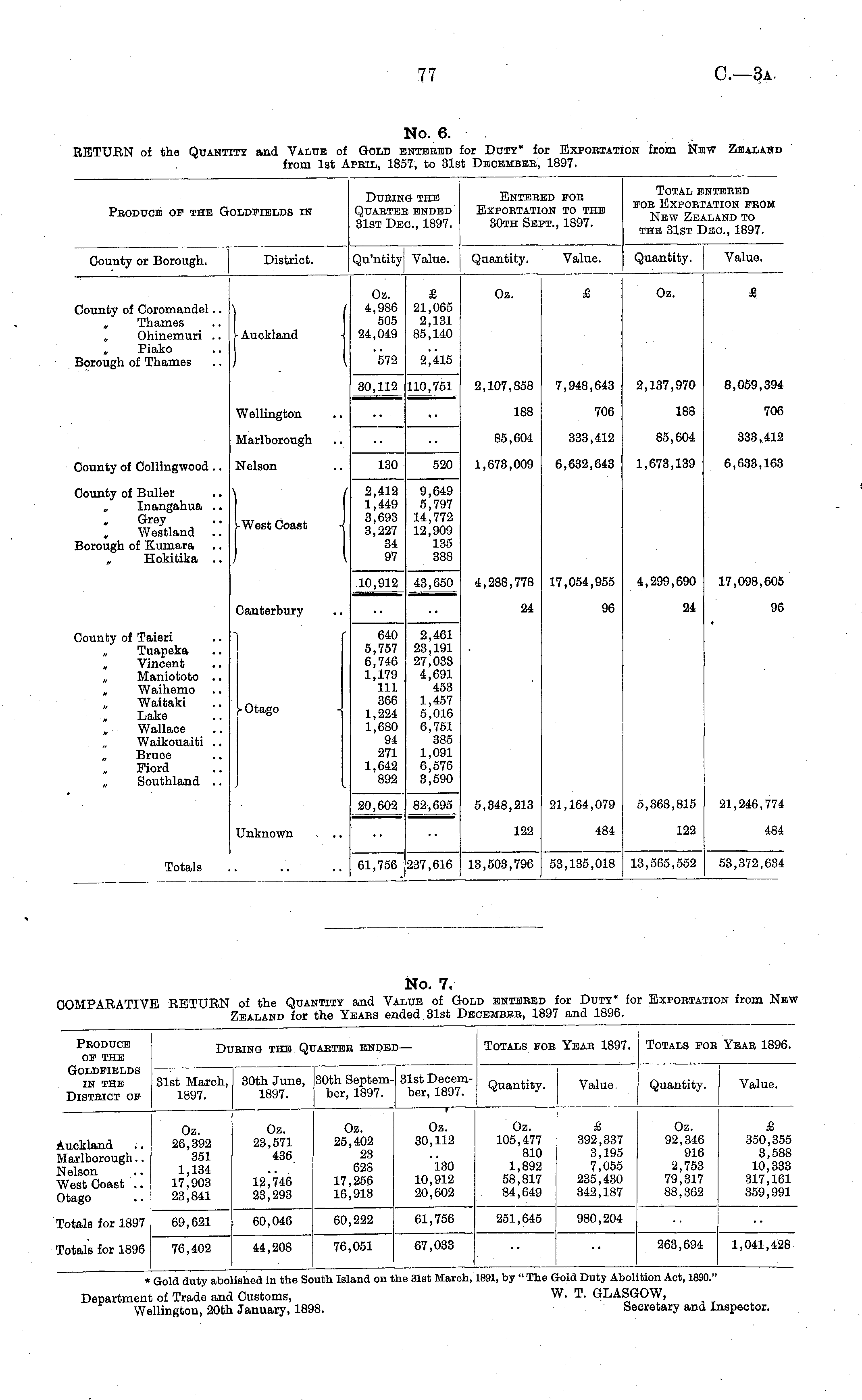 No. 7. COMPARATIVE RETURN of the Quantity and Value of Gold entered for Duty for Exportation from New Zealand for the Years ended 31st December, 1897 and 1896.
