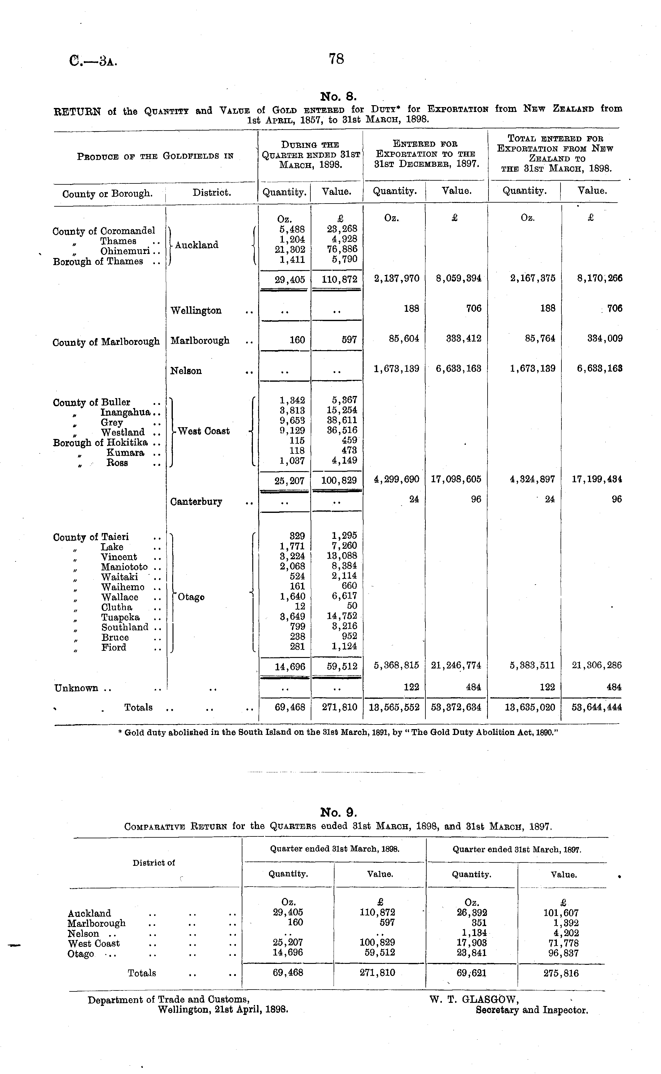 No. 8. RETURN of the Quantity and Value of Gold entered for Duty for Exportation from New Zealand from 1st April, 1857, to 31st March, 1898.