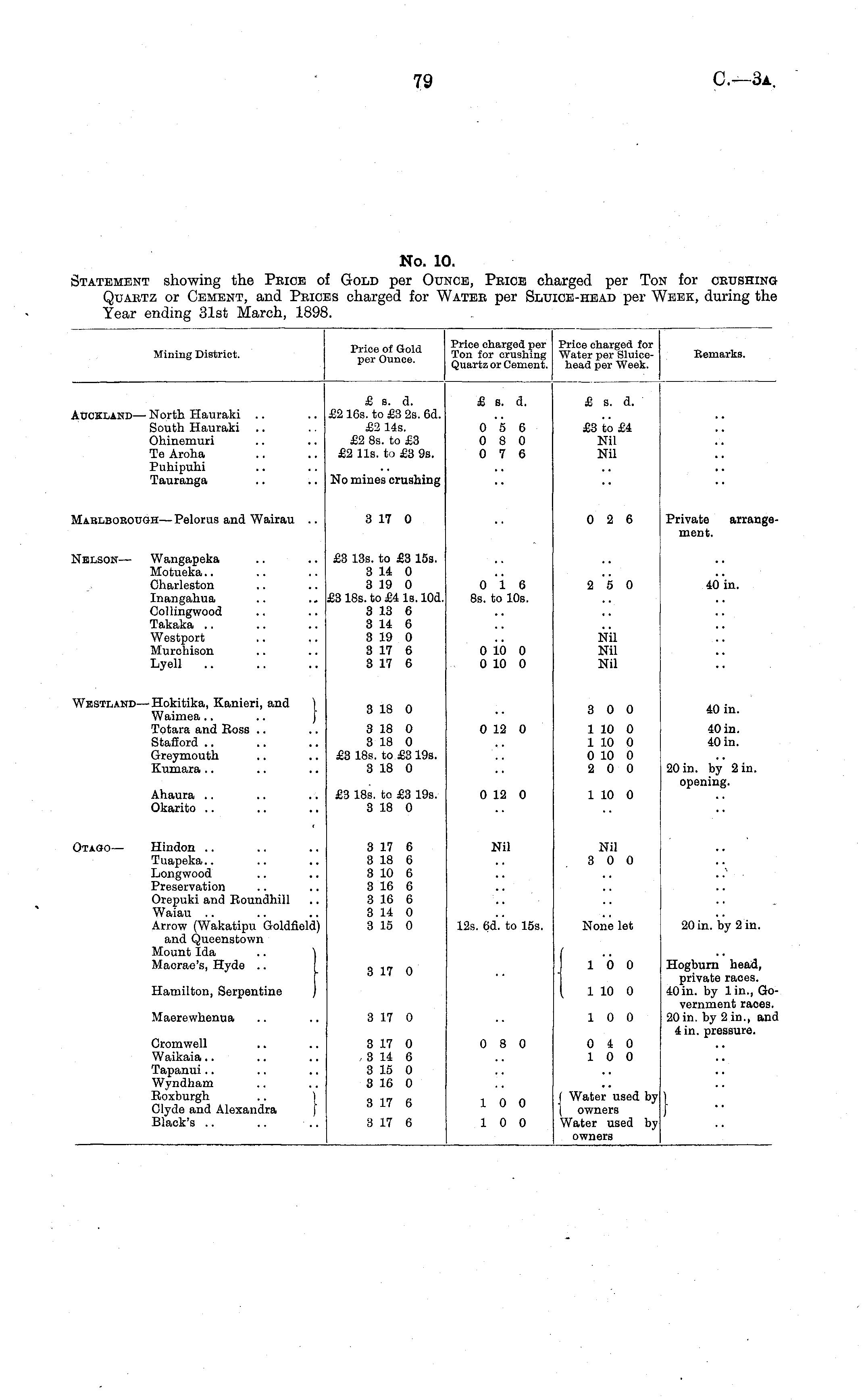 No. 10. Statement showing the Price of Gold per Ounce, Price charged per Ton for crushing Quartz or Cement, and Prices charged for Water per Sluice-head per Week, during the Year ending 31st March, 1898.