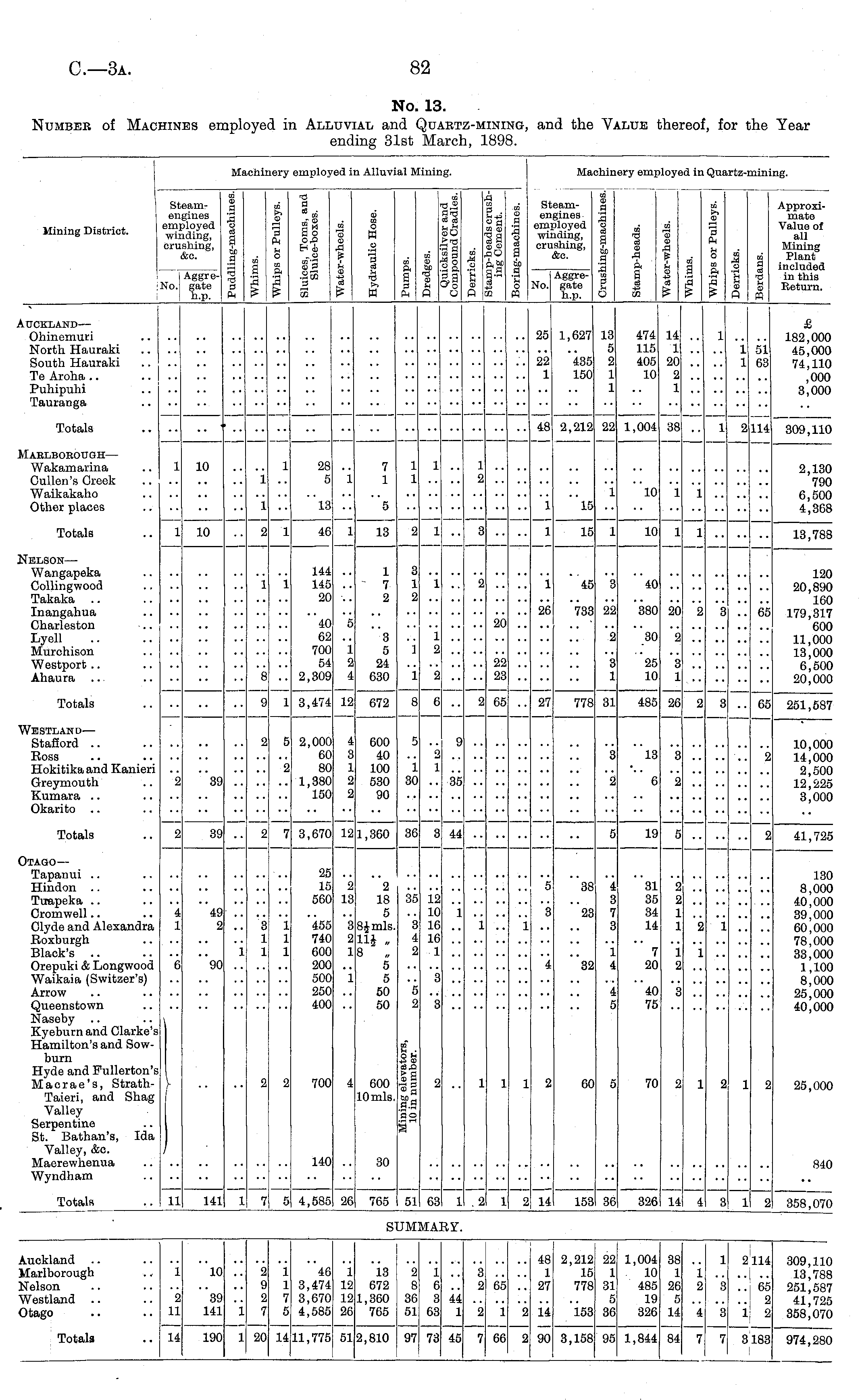 No. 13. Number of Machines employed in Alluvial and Quartz-mining, and the Value thereof, for the Year ending 31st March, 1898.