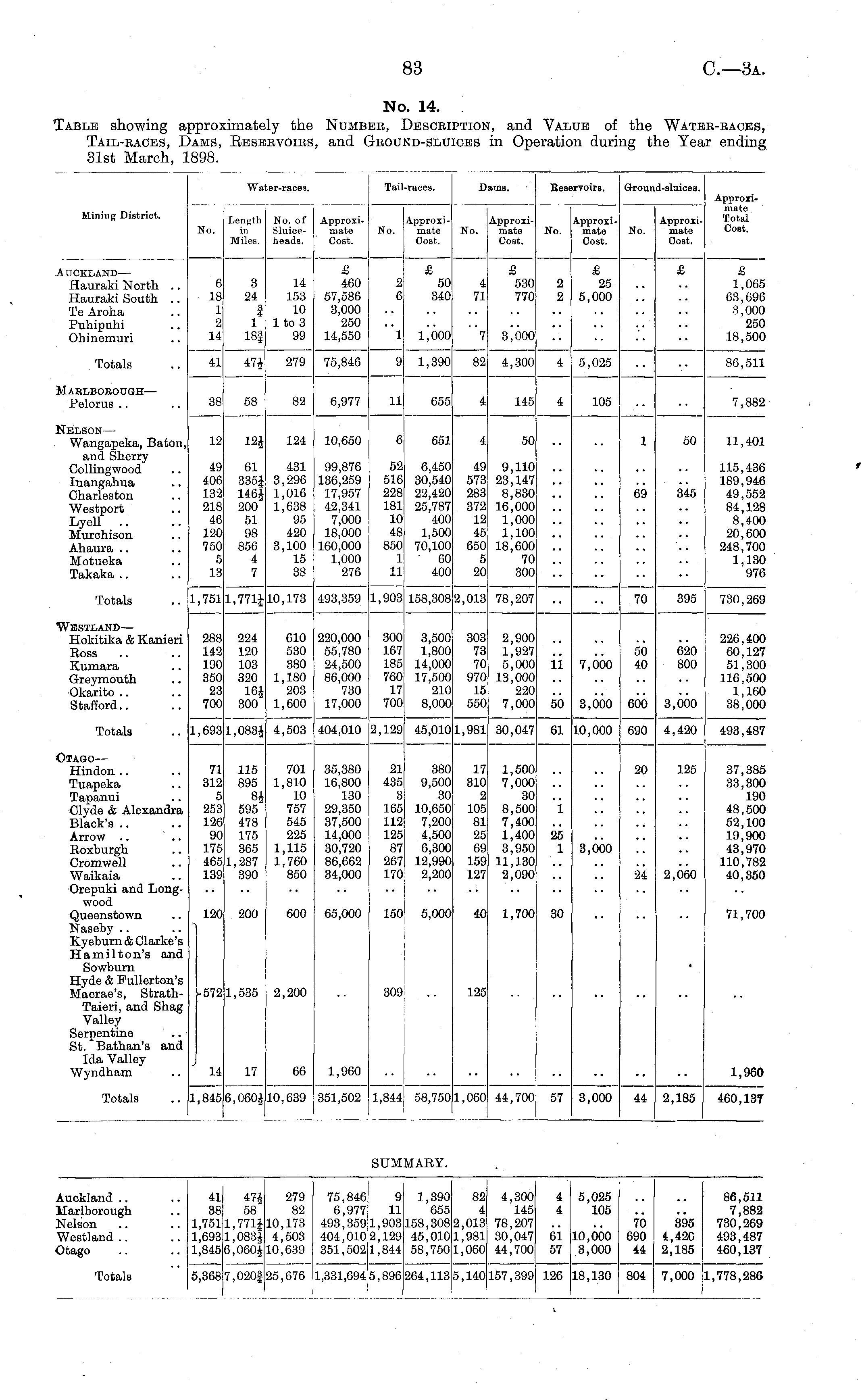 No. 14. Table showing approximately the Number, Description, and Value of the Water-races, Tail-races, Dams, Reservoirs, and Ground-sluices in Operation during the Year ending 31st March, 1898.