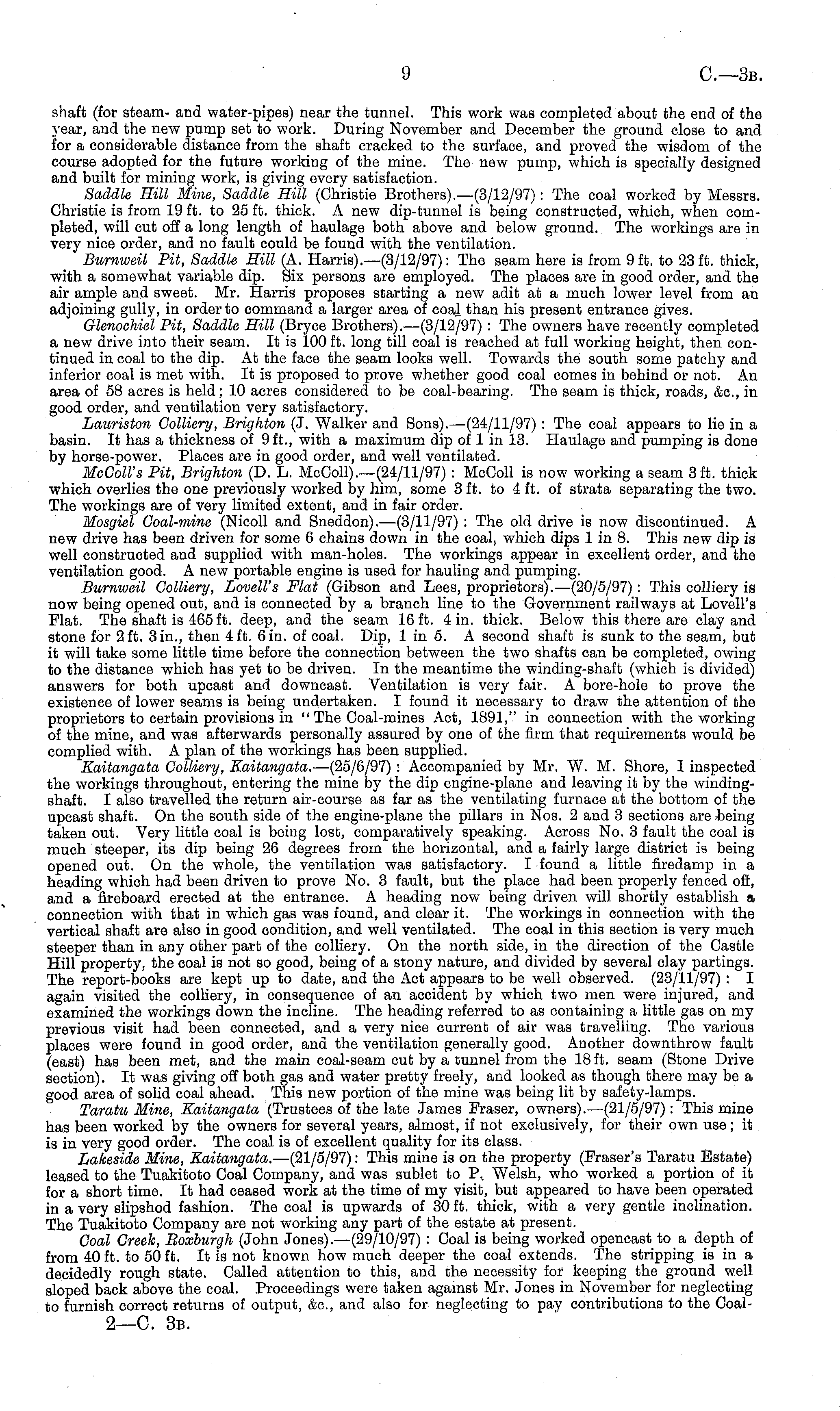 shaft (for steam- and water-pipes) near the tunnel. This work was completed about the end of the year, and the new pump set to work. During November and December the ground close to and for a considerable distance from the shaft cracked to the surface, and proved the wisdom of the course adopted for the future working of the mine. The new pump, which is specially designed and built for mining work, is giving every satisfaction. Saddle Hill Mine, Saddle Hill (Christie Brothers). —(3/12/97): The coal worked by Messrs. Christie is from 19 ft. to 25 ft. thick. A new dip-tunnel is being constructed, which, when completed, will cut off a long length of haulage both above and below ground. The workings are in very nice order, and no fault could be found with the ventilation. Burnweil Pit, Saddle Hill (A. Harris).—(3/12/97): The seam here is from 9 ft. to 23 ft. thick, with a somewhat variable dip. Six persons are employed. The places are in good order, and the air ample and sweet. Mr. Harris proposes starting a new adit at a much lower level from an adjoining gully, in order to command a larger area of coal than his present entrance gives. Glenochiel Pit, Saddle Hill (Bryce Brothers). —(3/12/97) : The owners have recently completed a new drive into their seam. It is 100 ft. long till coal is reached at full working height, then continued in coal to the dip. At the face the seam looks well. Towards the south some patchy and inferior coal is met with. It is proposed to prove whether good coal comes in behind or not. An area of 58 acres is held; 10 acres considered to be coal-bearing. The seam is thick, roads, &c, in good order, and ventilation very satisfactory. Lauriston Colliery, Brighton (J. Walker and Sons). —(24/11/97) : The coal appears to lie in a basin. It has a thickness of 9 ft., with a maximum dip of lin 13. Haulage and pumping is done by horse-power. Places are in good order, and well ventilated. McColl's Pit, Brighton (D. L. McColl).—(24/11/97) : McColl is now working a seam 3 ft. thick which overlies the one previously worked by him, some 3 ft. to 4 ft. of strata separating the two. The workings are of very limited extent, and in fair order. Mosgiel Coal-mine (Nicoll and Sneddon). —(3/11/97) : The old drive is now discontinued. A new drive has been driven for some 6 chains down in the coal, which dips lin 8. This new dip is well constructed and supplied with man-holes. The workings appear in excellent order, and the ventilation good. A new portable engine is used for hauling and pumping. Burnweil Colliery, Lovell's Flat (Gibson and Lees, proprietors). —(20/5/97): This colliery is now being opened out, and is connected by a branch line to the Government railways at Lovell's Flat. The shaft is 465 ft. deep, and the seam 16 ft. 4 in. thick. Below this there are clay and stone for 2 ft. 3 in., then 4 ft. 6 in. of coal. Dip, lin 5. A second shaft is sunk to the seam, but it will take some little time before the connection between the two shafts can be completed, owing to the distance which has yet to be driven. In the meantime the winding-shaft (which is divided) answers for both upcast and downcast. Ventilation is very fair. A bore-hole to prove the existence of lower seams is being undertaken. I found it necessary to draw the attention of the proprietors to certain provisions in " The Coal-mines Act, 1891," in connection with the working of the mine, and was afterwards personally assured by one of the firm that requirements would be complied with. A plan of the workings has been supplied. Eaitangata Colliery, Eaitangata. —(2s/6/97) : Accompanied by Mr. W. M. Shore, I inspected the workings throughout, entering the mine by the dip engine-plane and leaving it by the windingshaft. I also travelled the return air-course as far as the ventilating furnace at the bottom of the upcast shaft. On the south side of the engine-plane the pillars in Nos. 2 and 3 sections are being taken out. Very little coal is being lost, comparatively speaking. Across No. 3 fault the coal is much steeper, its dip being 26 degrees from the horizontal, and a fairly large district is being opened out. On the whole, the ventilation was satisfactory. I found a little firedamp in a heading which had been driven to prove No. 3 fault, but the place had been properly fenced oft, and a fireboard erected at the entrance. A heading now being driven will shortly establish a connection with that in which gas was found, and clear it. The workings in connection with the vertical shaft are also in good condition, and well ventilated. The coal in this section is very much steeper than in any other part of the colliery. On the north side, in the direction of the Castle Hill property, the coal is not so good, being of a stony nature, and divided by several clay partings. The report-books are kept up to date, and the Act appears to be well observed. (23/11/97) : I again visited the colliery, in consequence of an accident by which two men were injured, and examined the workings down the incline. The heading referred to as containing a little gas on my previous visit had been connected, and a very nice current of air was travelling. The various places were found in good order, and the ventilation generally good. Another downthrow fault (east) has been met, and the main coal-seam cut by a tunnel from the 18 ft. seam (Stone Drive section). It was giving off both gas and water pretty freely, and looked as though there may be a good area of solid coal ahead. This new portion of the mine was being lit by safety-lamps. Taratu Mine, Eaitangata (Trustees of the late James Fraser, owners). —(21/5/97): This mine has been worked by the owners for several years, almost, if not exclusively, for their own use; it is in very good order. The coal is of excellent quality for its class. Lakeside Mine, Eaitangata. —(2l/5/97): This mine is on the property (Fraser's Taratu Estate) leased to the Tuakitoto Coal Company, and was sublet to P