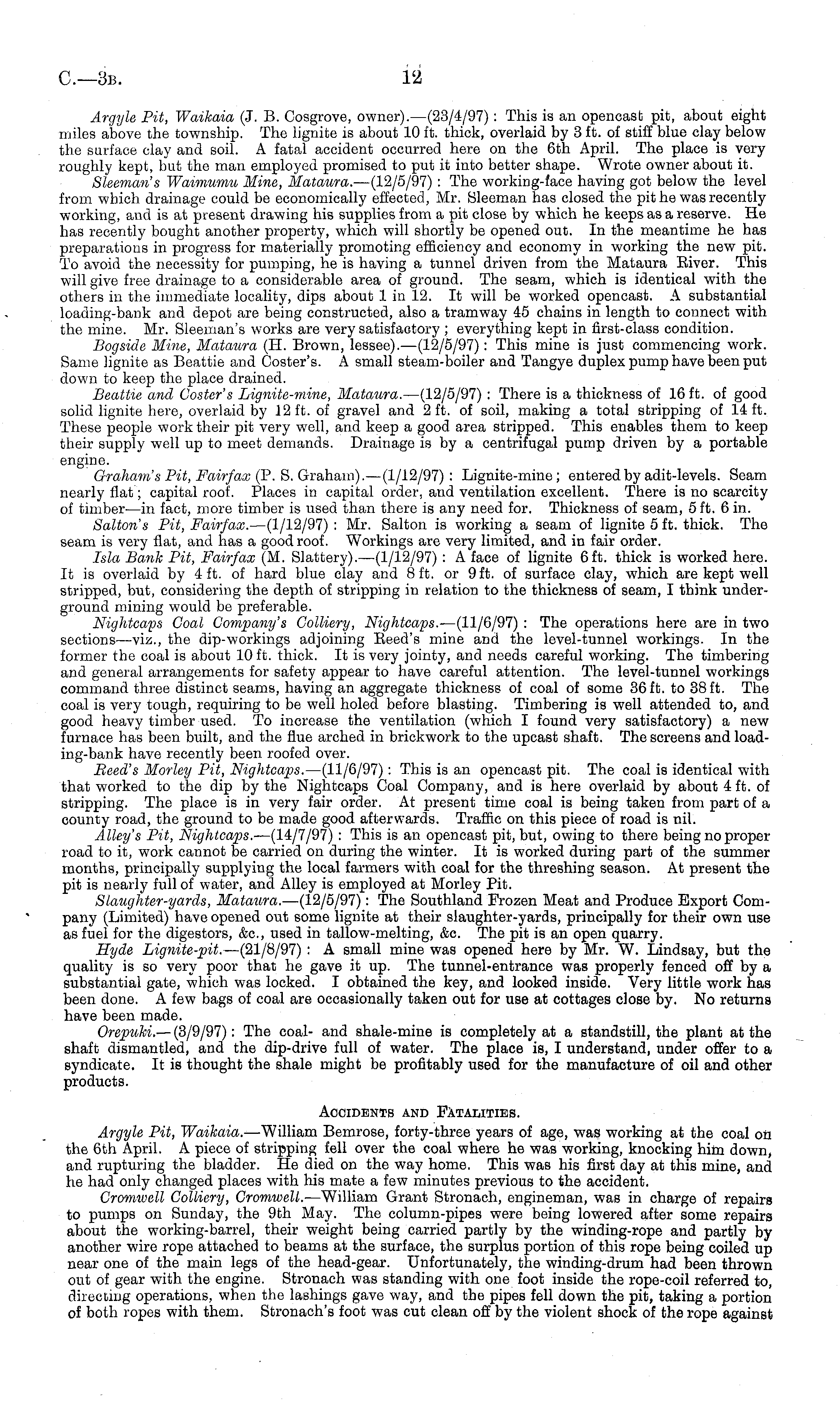 Argyle Pit, Waikaia (J. B. Cosgrove, owner). —(23/4/97): This is an opencast pit, about eight miles above the township. The lignite is about 10 ft. thick, overlaid by 3 ft. of stiff blue clay below the surface clay and soil. A fatal accident occurred here on the 6th April. The place is very roughly kept, but the man employed promised to put it into better shape. Wrote owner about it. Sleeman's Waimumu Mine, Mataura. —(l2/5/97) : The working-face having got below the level from which drainage could be economically effected, Mr. Sleeman has closed the pit he was recently working, and is at present drawing his supplies from a pit close by which he keeps as a reserve. He has recently bought another property, which will shortly be opened out. In the meantime he has preparations in progress for materially promoting efficiency and economy in working the new pit. To avoid the necessity for pumping, he is having a tunnel driven from the Mataura River. This will give free drainage to a considerable area of ground. The seam, which is identical with the others in the immediate locality, dips about lin 12. It will be worked opencast. A substantial loading-bank and depot are being constructed, also a tramway 45 chains in length to connect with the mine. Mr. Sleeman's works are very satisfactory ; everything kept in first-class condition. Bogside Mine, Mataura (H. Brown, lessee). —(12/5/97): This mine is just commencing work. Same lignite as Beattie and Coster's. A small steam-boiler and Tangye duplex pump have been put down to keep the place drained. Beattie and Coster's Lignite-mine, Mataura. —(l2/5/97) : There is a thickness of 16 ft. of good solid lignite here, overlaid by 12 ft. of gravel and 2 ft. of soil, making a total stripping of 14 ft. These people work their pit very well, and keep a good area stripped. This enables them to keep their supply well up to meet demands. Drainage is by a centrifugal pump driven by a portable engine. Graham's Pit, Fairfax (P. S. Graham). —(1/12/97): Lignite-mine; entered by adit-levels. Seam nearly flat; capital roof. Places in capital order, and ventilation excellent. There is no scarcity of timber'—in fact, more timber is used than there is any need for. Thickness of seam, 5 ft. 6 in. Saltern's Pit, Fairfax. —(1/12/97) : Mr. Salton is working a seam of lignite 5 ft. thick. The seam is very flat, and has a good roof. Workings are very limited, and in fair order. Isla Bank Pit, Fairfax (M. Slattery).—(l/12/97) : A face of lignite 6 ft. thick is worked here. It is overlaid by 4 ft. of hard blue clay and 8 ft. or 9 ft. of surface clay, which are kept well stripped, but, considering the depth of stripping in relation to the thickness of seam, I think underground mining would be preferable. Nightcaps Coal Company's Colliery, Nightcaps.- —(11/6/97) : The operations here are in two sections —viz., the dip-workings adjoining Heed's mine and the level-tunnel workings. In the former the coal is about 10 ft. thick. It is very jointy, and needs careful working. The timbering and general arrangements for safety appear to have careful attention. The level-tunnel workings command three distinct seams, having an aggregate thickness of coal of some 36 ft. to 38 ft. The coal is very tough, requiring to be well holed before blasting. Timbering is well attended to, and good heavy timber used. To increase the ventilation (which I found very satisfactory) a new furnace has been built, and the flue arched in brickwork to the upcast shaft. The screens and load-ing-bank have recently been roofed over. Beed's Morley Pit, Nightcaps. —(ll/6/97): This is an opencast pit. The coal is identical with that worked to the dip by the Nightcaps Coal Company, and is here overlaid by about 4 ft. of stripping. The place is in very fair order. At present time coal is being taken from part of a county road, the ground to be made good afterwards. Traffic on this piece of road is nil. Alley's Pit, Nightcaps. —(l 4/7/97) : This is an opencast pit, but, owing to there being no proper road to it, work cannot be carried on during the winter. It is worked during part of the summer months, principally supplying the local farmers with coal for the threshing season. At present the pit is nearly full of water, and Alley is employed at Morley Pit. Slaughter-yards, Mataura. —(l2/5/97): The Southland Frozen Meat and Produce Export Company (Limited) have opened out some lignite at their slaughter-yards, principally for their own use as fuel for the digestors, &c, used in tallow-melting, &c. The pit is an open quarry. Hyde Lignite-pit.— {2l /8/97) : A small mine was opened here by Mr. W. Lindsay, but the quality is so very poor that he gave it up. The tunnel-entrance was properly fenced off by a substantial gate, which was locked. I obtained the key, and looked inside. Very little work has been done. A few bags of coal are occasionally taken out for use at cottages close by. No returns have been made. Orepuki. — (3/9/97): The coal- and shale-mine is completely at a standstill, the plant at the shaft dismantled, and the dip-drive full of water. The place is, I understand, under offer to a syndicate. It is thought the shale might be profitably used for the manufacture of oil and other products. Accidents and Fatalities. Argyle Pit, Waikaia. —William Bemrose, forty-three years of age, was working at the coal on the 6th April. A piece of stripping fell over the coal where he was working, knocking him down, and rupturing the bladder. He died on the way home. This was his first day at this mine, and he had only changed places with his mate a few minutes previous to the accident. Cromwell Colliery, Cromwell. —William Grant Stronach, engineman, was in charge of repairs to pumps on Sunday, the 9th May. The column-pipes were being lowered after some repairs about the working-barrel, their weight being carried partly by the winding-rope and partly by another wire rope attached to beams at the sur