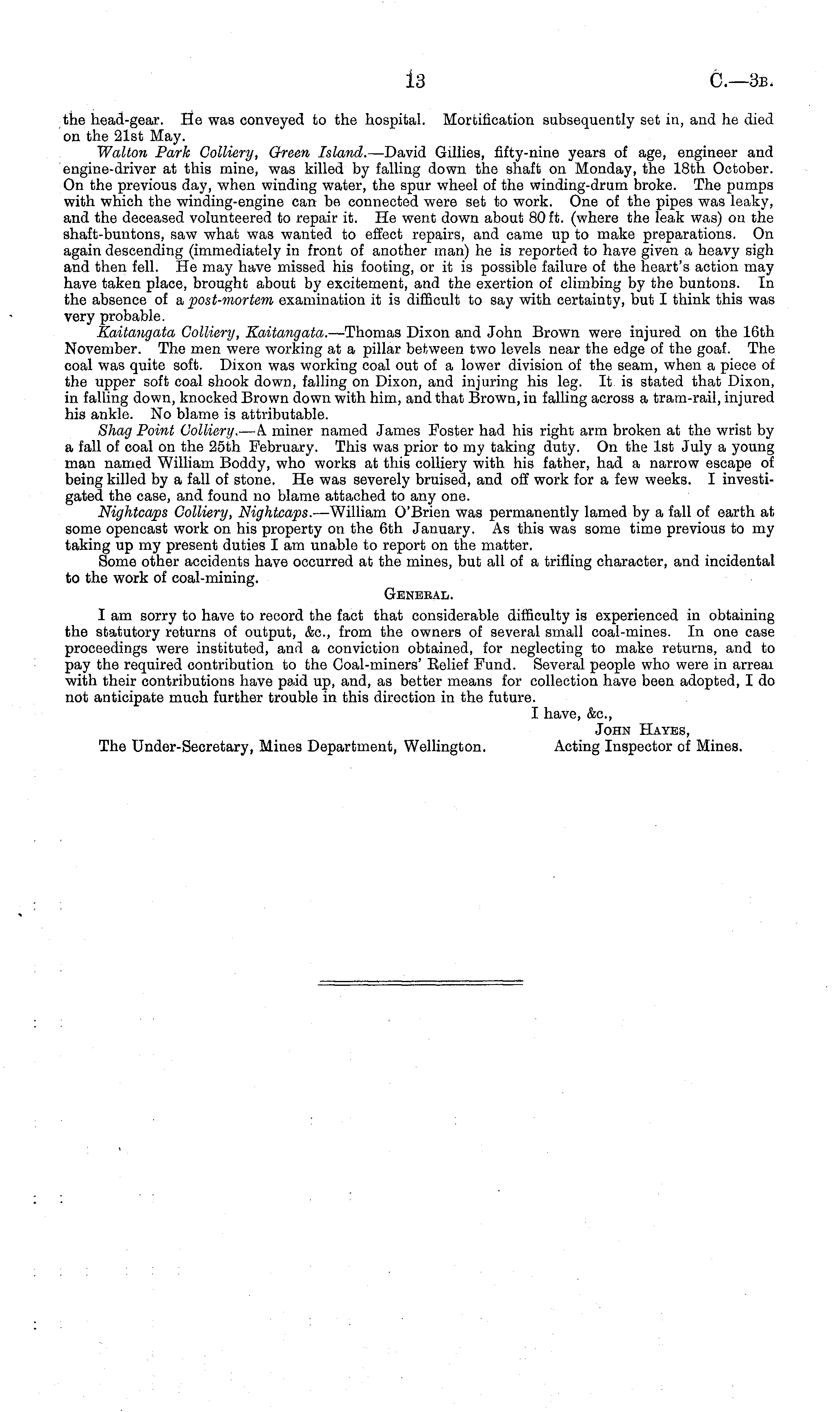 the head-gear. He was conveyed to the hospital. Mortification subsequently set in, and he died on the 21st May. Walton Park Colliery, Green Island. —David Gillies, fifty-nine years of age, engineer and engine-driver at this mine, was killed by falling down the shaft on Monday, the 18th October. On the previous day, when winding water, the spur wheel of the winding-drum broke. The pumps with which the winding-engine can be connected were set to work. One of the pipes was leaky, and the deceased volunteered to repair it. He went down about 80 ft. (where the leak was) on the shaft-buntons, saw what was wanted to effect repairs, and came up to make preparations. On again descending (immediately in front of another man) he is reported to have given a heavy sigh and then fell. He may have missed his footing, or it is possible failure of the heart's action may have taken place, brought about by excitement, and the exertion of climbing by the buntons. In the absence of & post-mortem examination it is difficult to say with certainty, but I think this was very probable. Kaitangata Colliery, Kaitangata. —Thomas Dixon and John Brown were injured on the 16th November. The men were working at a pillar between two levels near the edge of the goaf. The coal was quite soft. Dixon was working coal out of a lower division of the seam, when a piece of the upper soft coal shook down, falling on Dixon, and injuring his leg. It is stated that Dixon, in falling down, knocked Brown down with him, and that Brown, in falling across a tram-rail, injured his ankle. No blame is attributable. Shag Point Colliery. —A miner named James Foster had his right arm broken at the wrist by a fall of coal on the 25th February. This was prior to my taking duty. On the Ist July a young man named William Boddy, who works at this colliery with his father, had a narrow escape of being killed by a fall of stone. He was severely bruised, and off work for a few weeks. I investigated the case, and found no blame attached to any one. Nightcaps Colliery, Nightcaps. —William O'Brien was permanently lamed by a fall of earth at some opencast work on his property on the 6th January. As this was some time previous to my taking up my present duties I am unable to report on the matter. Some other accidents have occurred at the mines, but all of a trifling character, and incidental to the work of coal-mining. General. I am sorry to have to record the fact that considerable difficulty is experienced in obtaining the statutory returns of output, &c, from the owners of several small coal-mines. In one case proceedings were instituted, and a conviction obtained, for neglecting to make returns, and to pay the required contribution to the Coal-miners' Belief Fund. Several people who were in arreai with their contributions have paid up, and, as better means for collection have been adopted, I do not anticipate much further trouble in this direction in the future. I have, &c, John Hates, The Under-Secretary, Mines Department, Wellington. Acting Inspector of Mines.