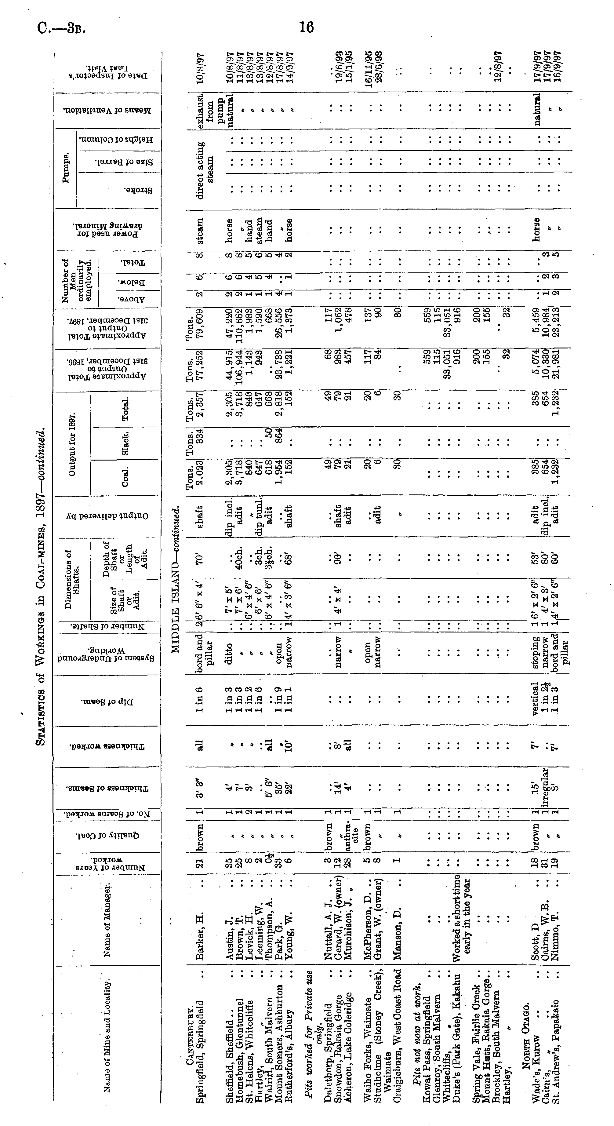 Name of Mine and Locality. Name of Manager. Q . i 8 2 "3 o a § O d I .2 1 a 3 EH no s a g I. 3•8 "a Dimensions of Shafts. Depth of! Shaft or Length of Adit. 9 a o Output for 1897. ill Hi I s ! Nui ore em mber of Men linarily iployed. pq B 1-9 e> 3B ipB. a 0 •s •3 a L F ? Size of Shaft or Adit. Coal. Slack. Total. I I u MID LE ISLA .ND— cc ■tinued. Cantebbuey. Springfield, Springfield Barker, H. 21 brown 3' 3" all Iin6 bord and pillar 6' 6" x 4' 70' shaft Tons. 2,023 Tons. 334 Tons. 2,357 Tons. 77,252 Tons. 79,609 steam direct sti actij am exhaust from pump natural 10/8/97 Sheffield, Sheffield .. Homebush, Glenturmel St. Helene, Whiteeliffs Hartley, Wairiri, South Malvern Mount Somers, Ashburton .. Rutherford's, Albury Austin, J. Brown, T. Levick, H. Leeming, W. Thompson, A. .. Park, G. Young, W. 35 25 8 2 33 6 1 1 2 1 1 1 1 4' 7' 3' M 1 in 3 lin 3 1 in 2 lin 6 ditto 7'x5' 7'x6' 6' x 4' 6" 6'x6' 6' x 4' 6" 40oh. dip incl. adit 2,305 3,718 840 647 618 1,954 152 •• - 2,305 3,718 840 647 668 2,818 152 44,915 106,944 1,143 943 47,220 110,662 1,983 1,590 668 26,556 1,373 2 2 1 1 1 4 1 6 6 4 5 4 8 8 5 6 5 2 horse hand steam hand ■• 10/8/97 11/8/97 13/8/97 13/8/97 12/8/97 17/8/97 14/9/97 5' 6" 35' 22' ail M ■■ 3ch. 3|ch. dip tunl. adit "50 864 10' 1 in 9 linl open narrow 1 4' x'3' 6" 68' shaft 1,221 1 horse n i • • • • „ Pits worked for Private use only. Dalethorp, Springfield Snowdon, Rakaia Gorge Acheron, Lake Coleridge Nuttall, A.J. Gerard, W. (owner) Murchison, J. „ 3 12 28 brown | 1 1 1 14' 4' 8' all narrow 90' shaft adit 49 79 21 49 79 21 68 983 457 117 1,062 478 19"/6;93 15/1/95 anthracite 1 4' at 4' Waiho Forks, Waimate Studholme (Stoney Creek), Waimate Craigieburn, West Coast Eoad McPherson, D. Grant, W. (owner) 5 8 brown | 1 1 open narrow adit 20 6 20 6 117 84 137 90 16/11/95 28/6/93 " - I I I Manson, D. 1 30 30 30 Pits not now at work. Kowai Pass, Springfield Glenroy, South Malvern Whiteoliffs, Duke's (Park Gate), Kakahu 559 115 33,051 916 559 115 33,051 916 Worked a short time early in the year .. Spring Vale, Fairlie Creek .. Mount Hutt, Rakaia Gorge.. Brockley, South Malvern Hartley, » 200 155 200 155 12"/8/97 32 32 Noeth Otago. Wade's, Kurow .. Cairn's, „ St. Andrew's, Papakaio Scott, D Cairns, W.B. .. Nimmo, T. 18 31 19 brown 1 1 1 15' irregular 8' V vertical lin2J 1 in 3 stoping narrow bord and pillar 1 1 1 6' x 2' 6" 4' x3' 4' x 2' 6" 53' 80' 60' adit dip incl. adit 385 654 1,232 385 654 1,232 5,074 10,330 21,981 5,459 10,984 23,213 ' 2 3 "3 5 horse natural 17/9/97 17/9/97 16/9/97 V w