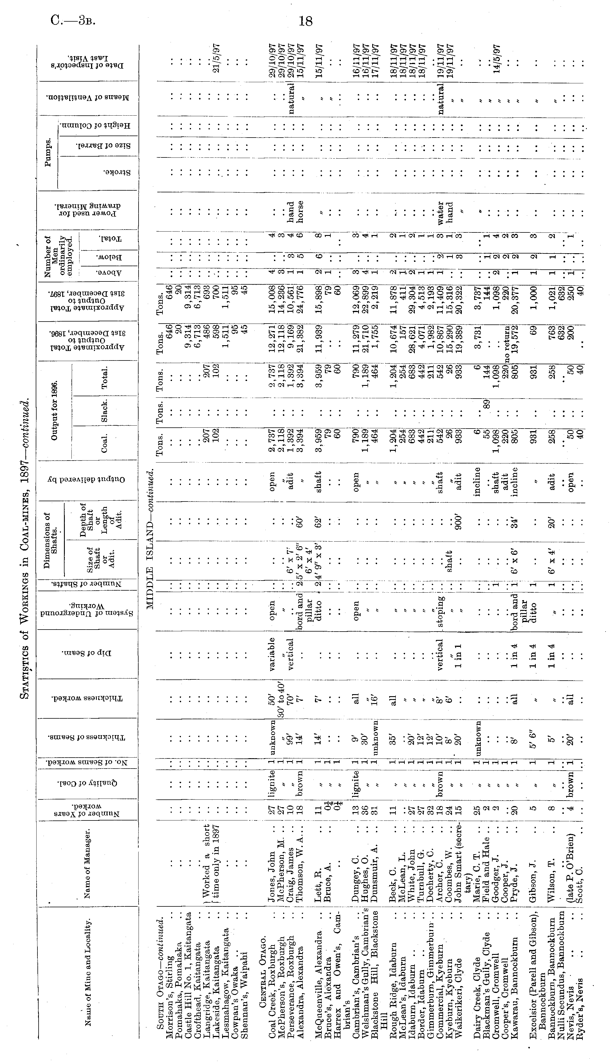 Naiiio of Mine and Locality. Name of Manager. f o "o 5Tβ CO O d 9 CO CD s o m a a o CO CO 8 a Dimensions of Shafts. Depth of Shaft or Length of Adit. o Out] iut for 1896. is- i ft 43 ft « 3 S ft » Km ore mber of Men iinarily iployed. © O 1H Q rops. o a a o o M o 43 Cβ 43 o 05 n Size of Shaft or Adit. Coal. Slack. Total. > O Slack. CD O 4S South Otago — continued. Morrison's, Stirling Pornahaka, Pomahaka Castle Hill No. 1, Kaitangata Croffchead, Kaitangata Langridge, Kaitangata Lakeside, Kaitangata Lesmahagow, Kaitangata .. Cowpan's Owaka .. Shennan's, Waipahi MIDDLE ISLA1 ND— cot tinned. •■ ■■ ■■ Tons. Tons. Tons. I Tons. 646 20 9,314 6,713 207 486 102 598 1,511 95 45 Tons. 646 20 9,314 6,713 693 700 1,511 95 45 I " •• •• i "■ t Worked a short .. I time only in 1897 .. .. " 207 102 21/5/97 " ■■ 2,737 j 12,271 2,118 12,118 1,392! 9,169 3,394: 21,382: ■■ Central Otago. Coal Creek, Roxburgh McPherson's, Roxburgh Perseverance, Roxburgh Alexandra, Alexandra Jones, John .. 27 McPherson, M. .. 27 Craig, James .. 10 j Thomson, W. A... 18 ! lignite " 1 1 1 unknown 99' 14' j 50' 30' to 40' 70' variable vertical open ..! 6' x 7 f bord and! 2i5' x 2' 6" pillar ' J 6' x 4' ditto I 2k' 9" x 3' 60' 62' • open 2,737 2,118 adit 1,392 3,394 15,008 14,236 10,561 24,776! 4 1 1 •• 3 5 4 3 4 hand 6 horse .. natural 29/10/97 29/10/97 29/10/97 15/11/97 • ■ brown McQueenville, Alexandra Brace's, Alexandra Harrex and Owen's, Cambrian's Cambrian's, Cambrian's Welshman's Gully, Cambrian's Blackstone Hill, Blackstone Hill Rough Ridge, Idaburn McLean's, Idaburn Idaburn, Idaburn .. Border, Idaburn Girnrnerburn, Gimmerbum .. Commercial, Kyeburn Kyeburn, Kyeburn Waikerikeri, Clyde Lett, R. ..11 Bruce, A. .. QJ Dungey, C. .. 13 Hughes, 0. .. 36 Dunsmuir, A. .. j 31 Beck, C. .,. .11 McLean, L. .. .. White, John .. 27 Turnbull, G. .. 27 Docherty, C. .. 32 Archer, C. .. 18 Coombes, W. .. 24 John Smart (secre- 15 tary) Marie, C. T. .. 25 Field and Hale .. 2 Goodger, J. .. 2. Cooper, J. .... Pryde, J. .. I 20 " lignite " „ 1 1 1 1 1 14' 30' unknown 35' 7' all 16' all open shaft 3,959, 79j 60 open 790: 1,189: 464 1,204 254 683 442 211 shaft 542: 26 adit 933 3,959! 11,939 79: .. 60' .. 790 11,279 1,189 21,710! 464 l,755i l>204 1 10,674 254 157 683 28,621 442 4,071 211! 1,982 542 10,867: 26 ! 15,290' 933| 19,389 15,898; 79 : 60i 12,069: 22,899 2,219: 11,878 ! 41l! 29,304! 4,513 : 2,193 ! 11,409! 15,316 20.322J ! " 3 4 1 6 • • 8 „ 1 3' .. 4 1 .. 2 1 3 water 1 hand 3 2 .. 1 . .. 15/11/97 16/11/97 16/11/97 17/11/97 18/11/97 18/11/97 18/11/97 18/11/97 " „ 1 1 1 1 1 1 1 1 20' 12' 12' 10' 8' ' 20' 8' 6' " 2 2 1 brown vertical . stoping .. „ .. shaft 900' 2 1 3 natural 19/11/97 19/11/97 1 in 1 • •1 Dairy Creek, Clyde Blackman's Gully, Clyde Cromwell, Cromwell Cooper's, Cromwell .. j Kawarau, Bannockburn 1 1 1 1 unknown 8' all :: - i :: incline 6 55 shaft 1,098 adit 220 incline 805 "89 6 3,731 i 144 1,098 220 no return; 805 19,572; 3,737 144i 1,098: 220 ; 20,377: •• 2 1 2 2 2 14/5/97 • • I " 1 in 4 1 in 4 bord and 1 6' x 6' ! pillar ditto 1 1 6' x 4' 34' 20' 'i i •• m Excelsior (Parell and Gibson), Bannockburn Bannuckburn, Bannockburn Nulli Secundus, Bannockburn Nevis, Nevis Ryder's, Nevis .. .. ! Gibson, J. .. 5 Wilson, T. .. 8 1 5' 6" 5' 1 in 4 931 adit 258 931 69 258 763 632 50 200 40 1,000 1,021 632 250 40 1 1 (late P. O'Brien) 4 Scott, C. .. .. brown 1 20' all open 50 40! 1 •v :: .••