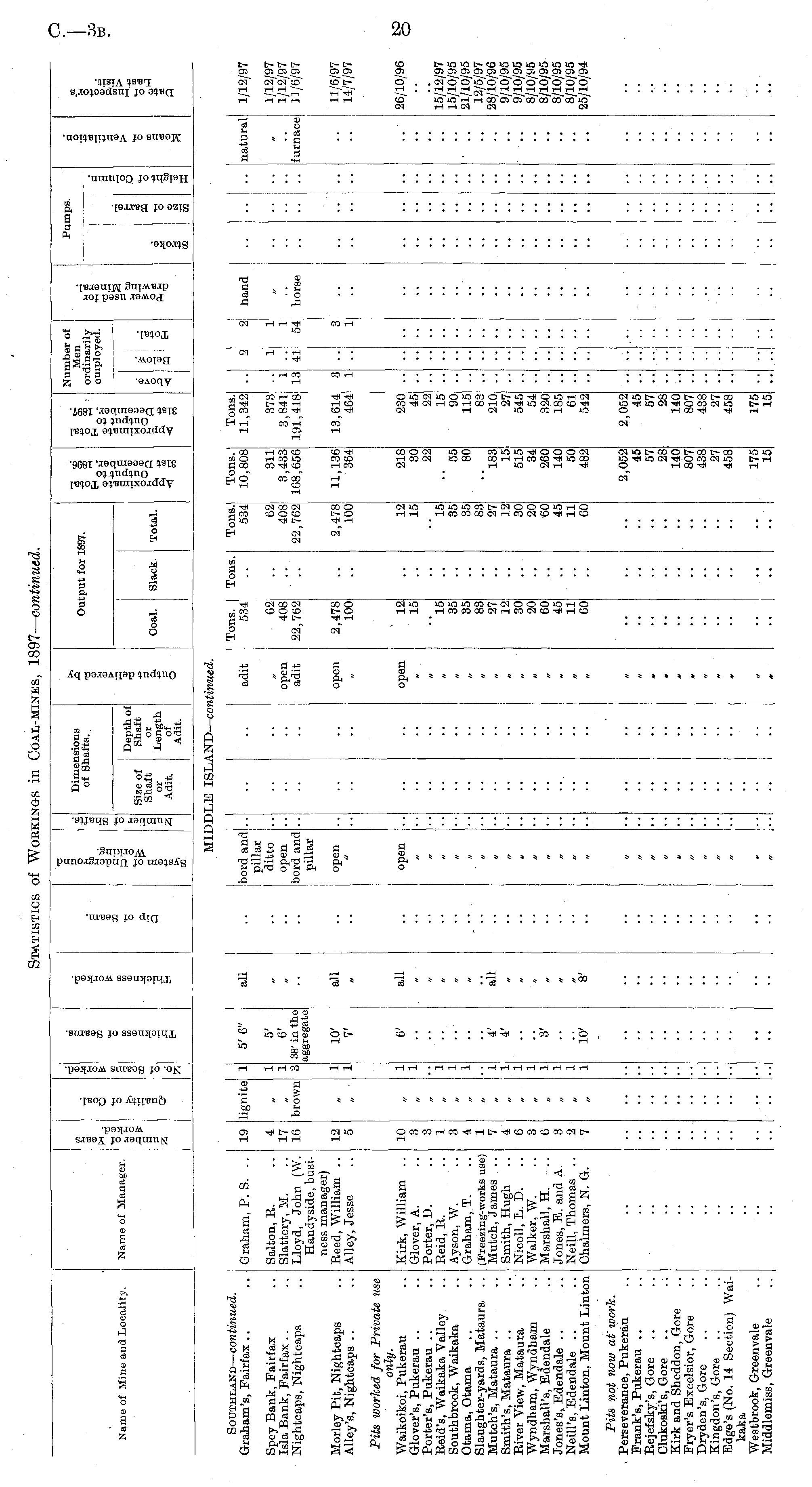 Name of Manager, j °-g O "o o 6 ft no CO CD a u o 1 a O ft. o tic 13 a i Dimensions of Shafts.. ■a o Output for 1897. 111 P , to Number of Men ordinarily employed. si n Pumps. J 8 <D o a) _cc I Is 1 Name of Mine and Locality. B SQ O s 3 m CD Depth of Size of I Shaft Shaft or or Length Adit. of Adit. Coal. Slack. Total. pi g I I to in Mil 'LE ISLAND— c< tinned. Southland — continued. Graham's, Fairfax Graham, P. S. 19 lignite 5' 6" i all bord and pillar ditto adit Tons. 1 534 Tons. Tons. 534 Tons. 10,808 Tons. 11,342 2 hand natural 1/12/97 Spey Bank, Fairfax Isla Bank, Fairfax Nightcaps, Nightcaps Salton, B. Slattery, M. Lloyd, John (W. Handyside, business manager) Beed, William .. Alley, Jesse 4 17 16 brown 1 1 3 5' 6' 38' in the aggregate open bord and pillar .. open adit 62 408 22,762 62 408i 22,762 ! 311 3,433 168,656 373 3,841 191,418 1 13 1 4! 1 54J horse • ■ 1/12/97 1/12/97 11/6/97 .. :furnace Morley Pit, Nightcaps Alley's, Nightcaps 10' 7' all open open 2,478 100 2,478 lOQ 11,136 364 13,614 464; 11/6/97 14/7/97 12 5 1 1 3 1 3 1 << ■ Pits worked for Private use only. Waikoikoi, Pukerau Glover's, Pukerau Porter's, Pukerau Beid's, Waikaka Valley Southbrook, Waikaka Otarna, Otama Slaughter-yards, Mataura .. Mutch's, Mataura Smith's, Mataura Eiver View, Mataura Wyndham, Wyndham Marshall's, Edendale Jones's, Edendale Neill's, Edendale Mount Linton, Mount Linton Kirk, William .. Glover, A. Porter, D. Beid, B. Ayson, W. Graham, T. (Freezing-works use) Mutch, James .. Smith, Hugh .. Nicoll,L. D. Walker, W. Marshall, H. Jones, E. and A. Neill, Thomas .. Chalmers, N. G. 10 3 3 1 3 4 1 7 4 6 3 6 3 2 7 1 1 1 1 1 1 1 1 1 1 1 1 1 6' 4' all all open open 12 15 15 35 35 83 27 12 30 20 60 45 11 60 12 15 "l5 35 35 83 27 12 30 20 60 45 11 60 218 30 22 55 80 183 15 515 34 260 140 50 482 230 45 22 15 90 115 83 210 27 545 54 320 185 61 542 26/10/96 15/12/97 15/10/95 21/10/95 12/5/97 28/10/96 9/10/95 9/10/95 8/10/95 8/10/95 8/10/95 8/10/95 25/10/94 I ' 3' 10' 8' Pits not now at work. Perseverance, Pukerau Frank's, Pukerau .. Bejefsky's, Gore Clukoski's, Gore Kirk and Sneddon, Gore Fryer's Excelsior, Gore Dryden's, Gore Kingdon's, Gore Edge's (No. 14 Section) Waikaka Westbrook, Greenvale Middlemiss, Greenvale 2,052 45 57 28 140 807 438 27 458 2,052 45 57 28 140 807 438 27 458 ■■ 175 15 175 15 • • „ .. • •