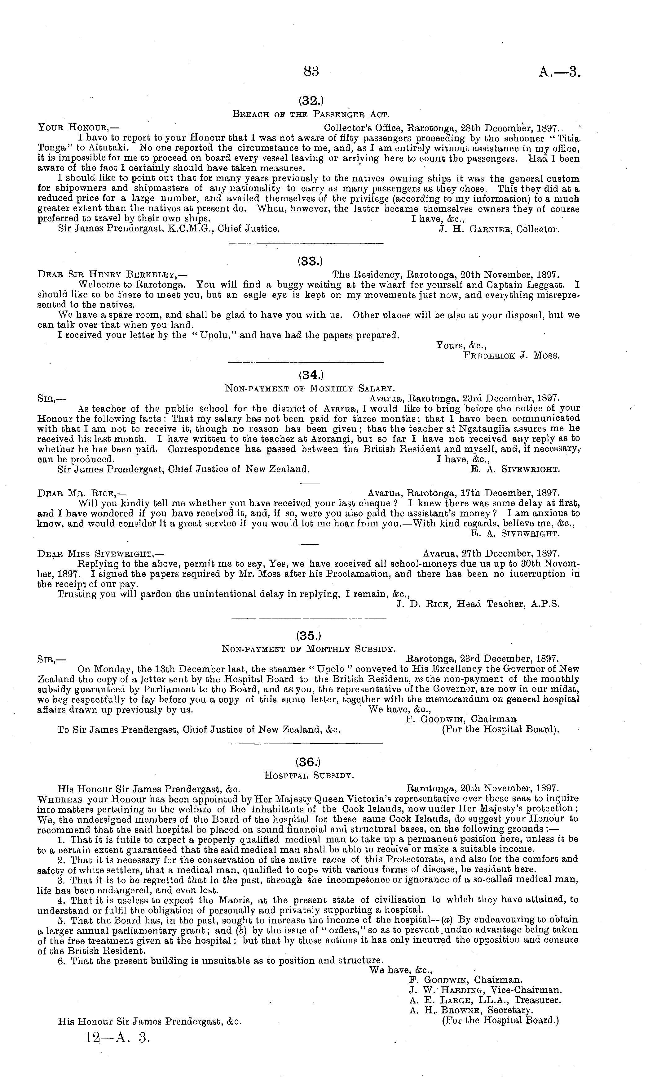 (35.) Non-payment of Monthly Subsidy. Sir,— Rarotonga, 23rd December, 1897. On Monday, the 13th December last, the steamer " Upolo " conveyed to His Excellency the Governor of New Zealand the copy of a letter sent by the Hospital Board to the British Resident, re the non-payment of the monthly subsidy guaranteed by Parliament to the Board, and as you, the representative of the Governor, are now in our midst, we beg respectfully to lay before you a copy of this same letter, together with the memorandum on general hospital affairs drawn up previously by us. We have, &c, F. Goodwin, Chairman To Sir James Prendergast, Chief Justice of New Zealand, &c. (For the Hospital Board).