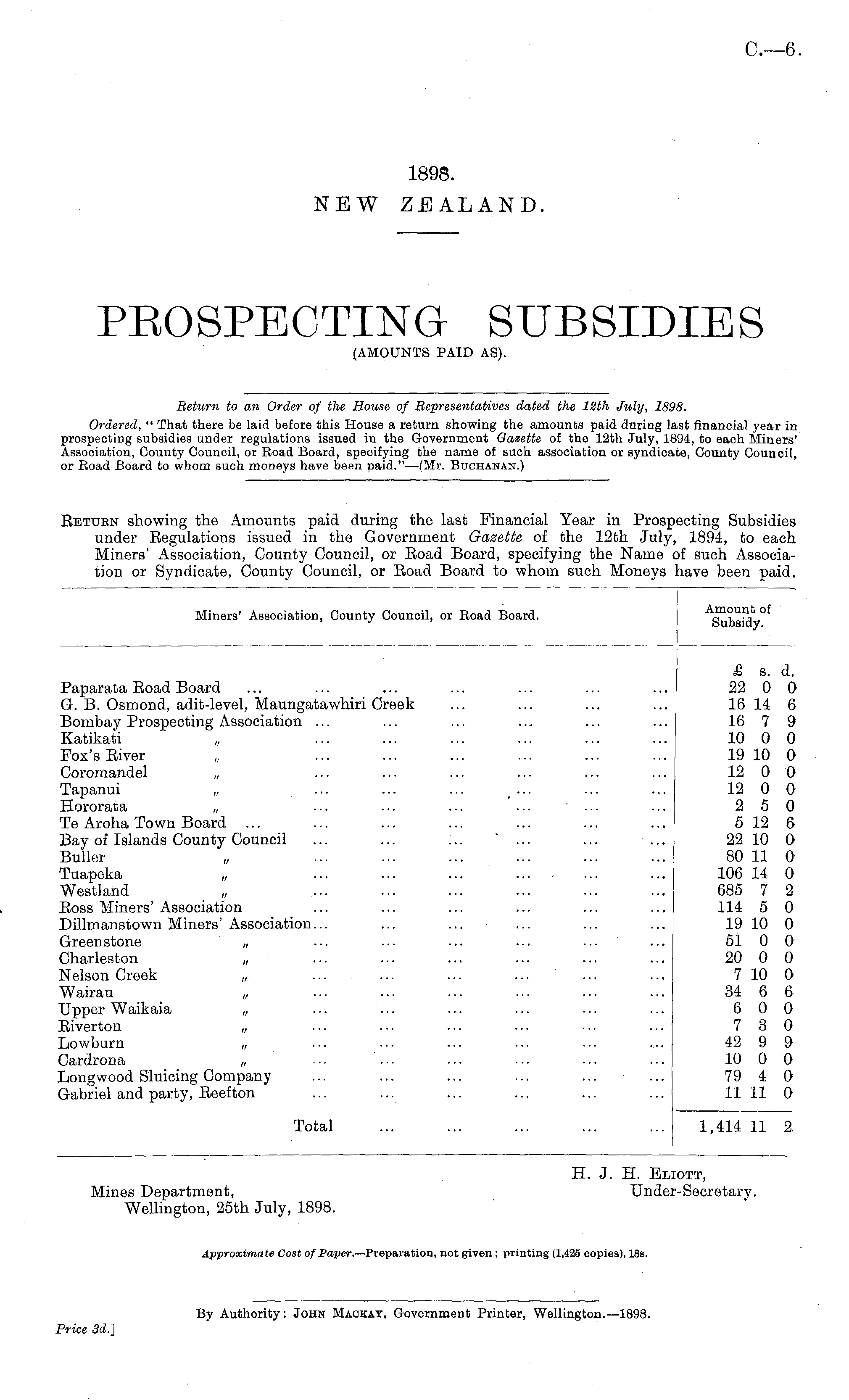 H. J. H. Eliott, Mines Department, Under-Secretary. Wellington, 25th July, 1898. Approximate Cost 0/Paper.—Preparation, not given ; printing (1,425 copies), 18s.