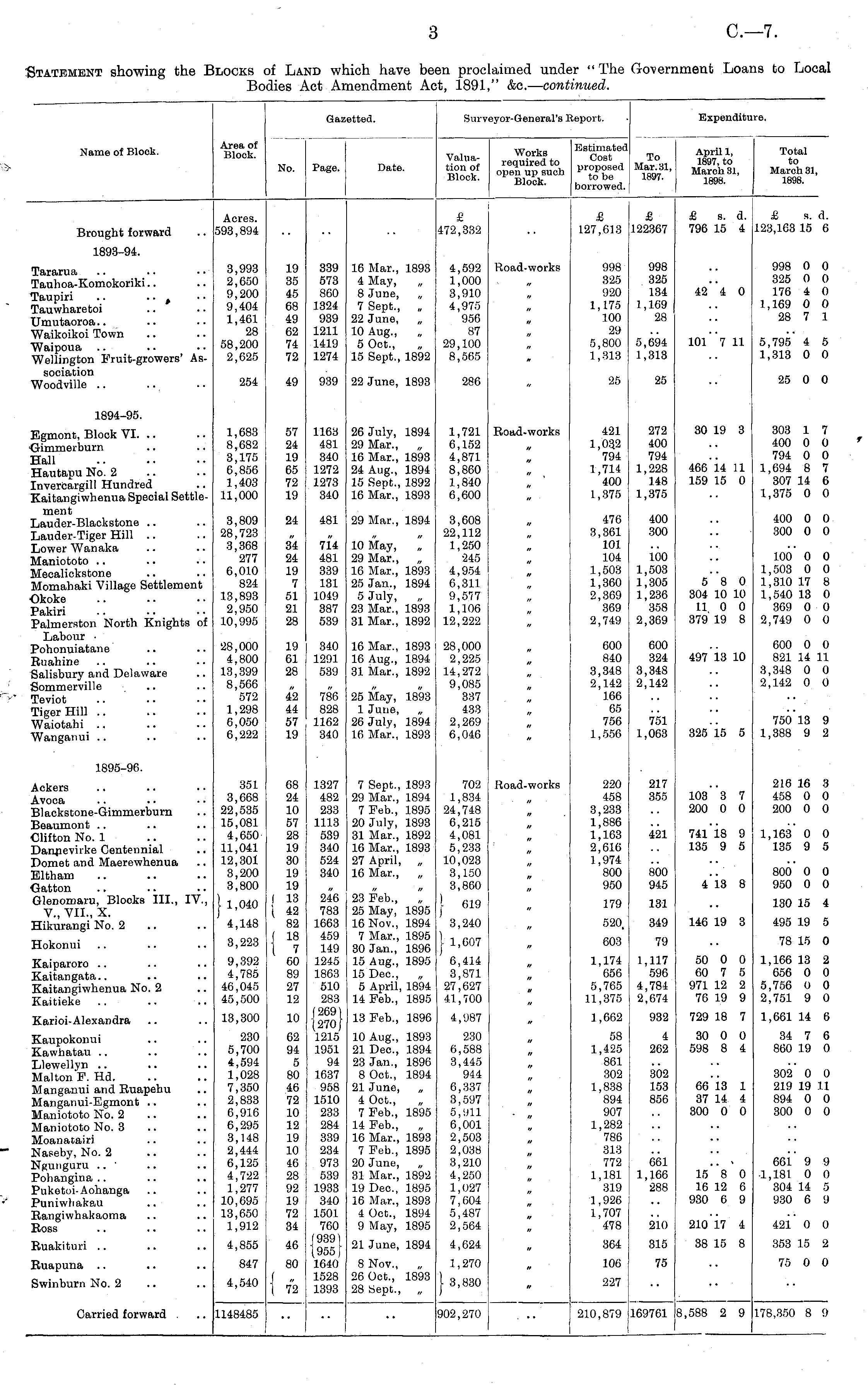 Ga: letted. Surveyor-General's .eport. Expenditui *e. Name of Block. Area of Block. No. Page. Date. Vilnn Works Hon of inquired to mock °P eu U P such Block. Block. Estimated Cost proposed to be borrowed. To Mar. 31, 1897. April 1, 1897, to March 31, 1898. Total to March 31, 1898. Brought forward Acres. 593,894 £ 472,332 £ 127,613 £ 122367 £ s. d. 796 15 4 £ s. d. 123,163 15 6 1893-94. 3,993 2,650 9,200 9,404 1,461 28 58,200 2,625 19 35 45 68 49 62 74 72 339 573 860 1324 939 1211 1419 1274 16 Mar., 1893 4 May, 8 June, „ 7 Sept., „ 22 June, 10 Aug., 5 Oct., 15 Sept., 1892 4,592 1,000 3,910 4,975 956 87 29,100 8,565 Road-works 998 325 920 1,175 100 29 5,800 1,313 998 325 134 1,169 28 998 0 0 325 0 0 176 4 0 1,169 0 0 28 7 1 Tararua Tauhoa-Komokoriki Taupiri .. .. t Tauwharetoi Umutaoroa.. Waikoikoi Town Waipoua Wellington Fruit-growers' Association Woodville 5,694 1,313 42"4 0 101 "7 11 5,795' 4 5 1,313 0 0 254 49 939 22 June, 1893 286 25 25 25 0 0 1894-95. 1,683 8,682 3,175 6,856 1,403 11,000 26 July, 1894 29 Mar., „ 16 Mar., 1893 24 Aug., 1894 15 Sept., 1892 16 Mar., 1893 1,721 6,152 4,871 8,860 1,840 6,600 Road-works 272 400 794 1,228 148 1,375 30 19 3 303 1 7 400 0 0 794 0 0 1,694 8 7 307 14 6 1,375 0 0 Egmont, Block VI. .. Gimmerburn Hall Hautapu No. 2 Invercargill Hundred Kaitangiwhenua Special Settlement Lauder-Blackstone Lauder-Tiger Hill Lower Wanaka Maniototo Mecalickstone Momahaki Village Settlement Okoke Pakiri Palmerston North Knights of Labour • Pohonuiatane Ruahine Salisbury and Delaware Sommerville Teviot Tiger Hill .. Waiotahi Wangarmi 3,809 28,723 3,368 277 6,010 824 13,893 2,950 10,995 57 24 19 05 72 19 24 34 24 19 7 51 21 28 1163 481 340 1272 1273 340 481 714 481 339 131 1049 387 539 29 Mar., 1894 10 May, 29 Mar., „ 16 Mar., 1893 25 Jan., 1894 5 July, „ 23 Mar., 1893 31 Mar., 1892 3,608 22,112 1,250 245 4,954 6,311 9,577 1,106 12,222 421 1,032 794 1,714 400 1,375 476 3,361 101 104 1,503 1,360 2,369 369 2,749 400 300 100 1,503 1,305 1,236 358 2,369 466 14 11 159 15 0 5 8 0 304 10 10 11 0 0 379 19 8 400 0 0 300 0 0 100 0 0 1,503 0 0 1,310 17 8 1,540 13 0 369 0 0 2,749 0 0 28,000 4,800 13,399 8,566 572 1,298 6,050 6,222 19 61 28 340 1291 539 16 Mar., 1893 16 Aug., 1894 31 Mar., 1892 28,000 2,225 14,272 9,085 337 433 2,269 6,046 600 840 3,348 2,142 166 65 756 1,556 600 324 3,348 2,142 497 13 10 600 0 0 821 14 11 3,348 0 0 2,142 0 0 42 44 57 19 786 828 1162 340 25 May, 1893 1 June, „ 26 July, 1894 16 Mar., 1893 751 1,063 750 13 9 1,388 9 2 325 15 5 1895-96. 351 3,668 22,535 15,081 4,650 11,041 12,301 3,200 3,800 7 Sept., 1893 29 Mar., 1894 7 Feb., 1895 20 July, 1893 31 Mar., 1892 16 Mar., 1893 27 April, „ 16 Mar., 702 1,834 24,748 6,215 4,081 5,233 10,023 3,150 3,860 Road-works 220 458 3,233 1,886 1,163 2,616 1,974 800 950 103 "3 7 200 0 0 216 16 3 458 0 0 200 0 0 Ackers Avoca Blackstone-Gimmerburn Beaumont Clifton No. 1 Danneviike Centennial Domet and Maerewhenua Eltham Gatton Glenomaru, Blocks III., IV., V., VII., X. Hikurangi No. 2 68 24 10 57 28 19 30 19 19 I 13 ( 42 82 H 60 89 27 12 1327 482 233 1113 539 340 524 340 217 355 421 741 18 9 135 9 5 1,163' 0 0 135 9 5 800 945 418 8 806' 0 0 950 0 0 Hokonui I 1,040 4,148 3,223 246 783 1663 459 149 1245 1863 510 283 (2691 "(270/ 1215 1951 94 1637 958 1510 233 284 339 234 973 539 1933 340 1501 760 (939) 1955 f 1640 1528 1393 23 Feb., „ 25 May, 1895 16 Nov., 1894 7 Mar., 1895 30 Jan., 1896 15 Aug., 1895 15 Dec, „ 5 April, 1894 14 Feb., 1895 J- 619 3,240 J 1,607 179 520, 603 131 349 79 146 19 3 130 15 4 495 19 5 78 15 0 Kaiparoro Kaitangata.. Kaitangiwhenua No. 2 Kaitieke 9,392 4,785 46,045 45,500 6,414 3,871 27,627 41,700 1,174 656 5,765 11,875 1,117 596 4,784 2,674 50 0 0 60 7 5 971 12 2 76 19 9 1,166 13 2 656 0 0 5,756 0 0 2,751 9 0 Karioi-Alexandra 13,300 10 13 Feb., 1896 4,987 1,662 932 729 18 7 1,661 14 6 Kaupokonui Kawhatau .. Llewellyn Malton'F. Hd. Manganui and Ruapehu Manganui-Egmont Maniototo No. 2 Maniototo No. 3 Moanatairi Naseby, No. 2 Ngunguru .. Pohangina Puketoi-Aohanga Puniwhakau Rangiwhakaoma Ross 230 5,700 4,594 1,028 7,350 2,833 6,916 6,295 3,148 2,444 6,125 4,722 1,277 10,695 13,650 1,912 62 94 5 80 46 72 10 12 19 10 46 28 92 19 72 34 10 Aug., 1893 21 Dec, 1894 23 Jan., 1896 8 Oct., 1894 21 June, „ 4 Oct., 7 Feb., 1895 14 Feb., 16 Mar., 1893 7 Feb., 1895 20 June, „ 31 Mar., 1892 19 Dec, 1895 16 Mar., 1893 4 Oct., 1894 9 May, 1895 230 6,588 3,445 944 6,337 3,597 5,911 6,001 2,503 2,038 3,210 4,250 1,027 7,604 5,487 2,564 58 1,425 861 302 1,838 894 907 1,282 786 313 772 1,181 319 1,926 1,707 478 4 262 30 0 0 598 8 4 34 7 6 860 19 0 302 153 856 66 13 1 37 14 4 300 0 0 302 0 0 219 19 11 894 0 0 300 0 0 661 1,166 288 15 8 0 16 12 6 930 6 9 661 9 9 1,181 0 0 304 14 5 930 6 9 210 210 17 4 421 0 0 Ruakituri 4,855 46 21 June, 1894 4,624 364 315 38 15 8 353 15 2 Ruapuna Swinburn No. 2 847 80 8 Nov., 26 Oct., 1893 28 Sept., „ 1,270 106 75 75 0 0 4,540 I. 72 I 3,830 227 Carried forward . |8,588 2 9 1148485 902,270 210,879 1169761 178,350 8 9