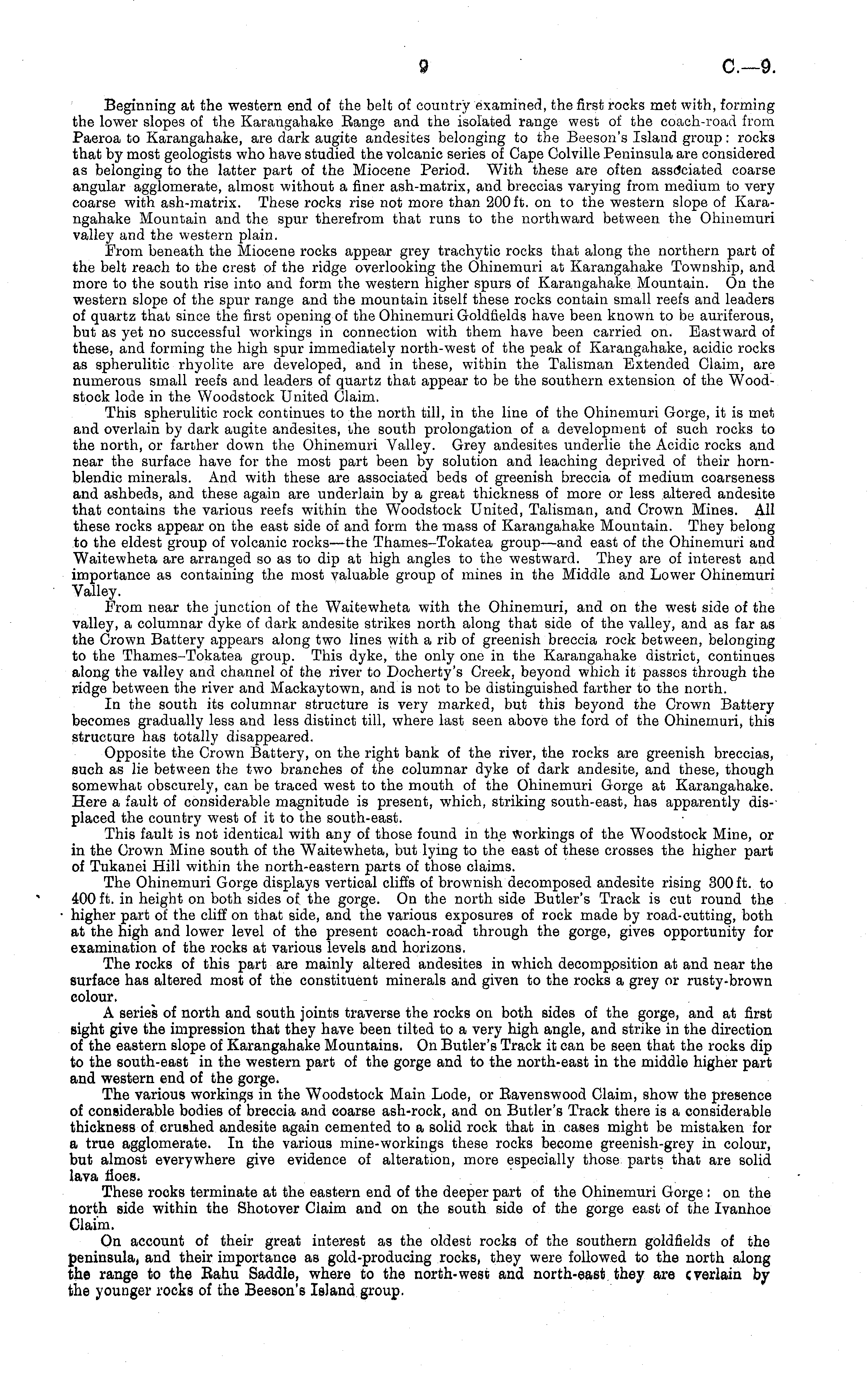 Beginning at the western end of the belt of country examined, the first rocks met with, forming the lower slopes of the Karangahake Bange and the isolated range west of the coach-road from Paeroa to Karangahake, are dark augite andesites belonging to the Beeson's Island group : rocks that by most geologists who have studied the volcanic series of Cape Colville Peninsula are considered as belonging to the latter part of the Miocene Period. With these are often associated coarse angular agglomerate, almost without a finer ash-matrix, and breccias varying from medium to very coarse with ash-matrix. These rocks rise not more than 200 ft. on to the western slope of Karangahake Mountain and the spur therefrom that runs to the northward between the Ohinemuri valley and the western plain. From beneath the Miocene rocks appear grey trachytic rocks that along the northern part of the belt reach to the crest of the ridge overlooking the Ohinemuri at Karangahake Township, and more to the south rise into and form the western higher spurs of Karangahake Mountain. On the western slope of the spur range and the mountain itself these rocks contain small reefs and leaders of quartz that since the first opening of the Ohinemuri Goldfields have been known to be auriferous, but as yet no successful workings in connection with them have been carried on. Eastward of these, and forming the high spur immediately north-west of the peak of Karangahake, acidic rocks as spherulitic rhyolite are developed, and in these, within the Talisman Extended Claim, are numerous small reefs and leaders of quartz that appear to be the southern extension of the Woodstock lode in the Woodstock United Claim. This spherulitic rock continues to the north till, in the line of the Ohinemuri Gorge, it is met and overlain by dark augite andesites, the south prolongation of a development of such rocks to the north, or farther down the Ohinemuri Valley. Grey andesites underlie the Acidic rocks and near the surface have for the most part been by solution and leaching deprived of their hornblendic minerals. And with these are associated beds of greenish breccia of medium coarseness and ashbeds, and these again are underlain by a great thickness of more or less altered andesite that contains the various reefs within the Woodstock United, Talisman, and Crown Mines. All these rocks appear on the east side of and form the mass of Karangahake Mountain. They belong to the eldest group of volcanic rocks —the Thames-Tokatea group—and east of the Ohinemuri and Waitewheta are arranged so as to dip at high angles to the westward. They are of interest and importance as containing the most valuable group of mines in the Middle and Lower Ohinemuri Valley. From near the junction of the Waitewheta with the Ohinemuri, and on the west side of the valley, a columnar dyke of dark andesite strikes north along that side of the valley, and as far as the Crown Battery appears along two lines with a rib of greenish breccia rock between, belonging to the Thames-Tokatea group. This dyke, the only one in the Karangahake district, continues along the valley and channel of the river to Docherty's Creek, beyond which it passes through the ridge between the river and Mackaytown, and is not to be distinguished farther to the north. In the south its columnar structure is very marked, but this beyond the Crown Battery becomes gradually less and less distinct till, where last seen above the ford of the Ohinemuri, this structure has totally disappeared. Opposite the Crown Battery, on the right bank of the river, the rocks are greenish breccias, such as lie between the two branches of the columnar dyke of dark andesite, and these, though somewhat obscurely, can be traced west to the mouth of the Ohinemuri Gorge at Karangahake. Here a fault of considerable magnitude is present, which, striking south-east, has apparently displaced the country west of it to the south-east. This fault is not identical with any of those found in the workings of the Woodstock Mine, or in the Crown Mine south of the Waitewheta, but lying to the east of these crosses the higher part of Tukanei Hill within the north-eastern parts of those claims. The Ohinemuri Gorge displays vertical cliffs of brownish decomposed andesite rising 300 ft. to 400 ft. in height on both sides of the gorge. On the north side Butler's Track is cut round the higher part of the cliff on that side, and the various exposures of rock made by road-cutting, both at the high and lower level of the present coach-road through the gorge, gives opportunity for examination of the rocks at various levels and horizons. The rocks of this part are mainly altered andesites in which decomposition at and near the surface has altered most of the constituent minerals and given to the rocks a grey or rusty-brown colour. A series of north and south joints traverse the rocks on both sides of the gorge, and at first sight give the impression that they have been tilted to a very high angle, and strike in the direction of the eastern slope of Karangahake Mountains. On Butler's Track it can be seen that the rocks dip to the south-east in the western part of the gorge and to the north-east in the middle higher part and western end of the gorge. The various workings in the Woodstock Main Lode, or Bavenswood Claim, show the presence of considerable bodies of breccia and coarse ash-rock, and on Butler's Track there is a considerable thickness of crushed andesite again cemented to a solid rock that in cases might be mistaken for a true agglomerate. In the various mine-workings these rocks become greenish-grey in colour, but almost everywhere give evidence of alteration, more especially those parts that are solid lava floes. These rocks terminate at the eastern end of the deeper part of the Ohinemuri Gorge ; on the north side within the Shotover Claim and on the south side of the gorge east of the Ivanhoe Claim. On account of their great interest as the olde