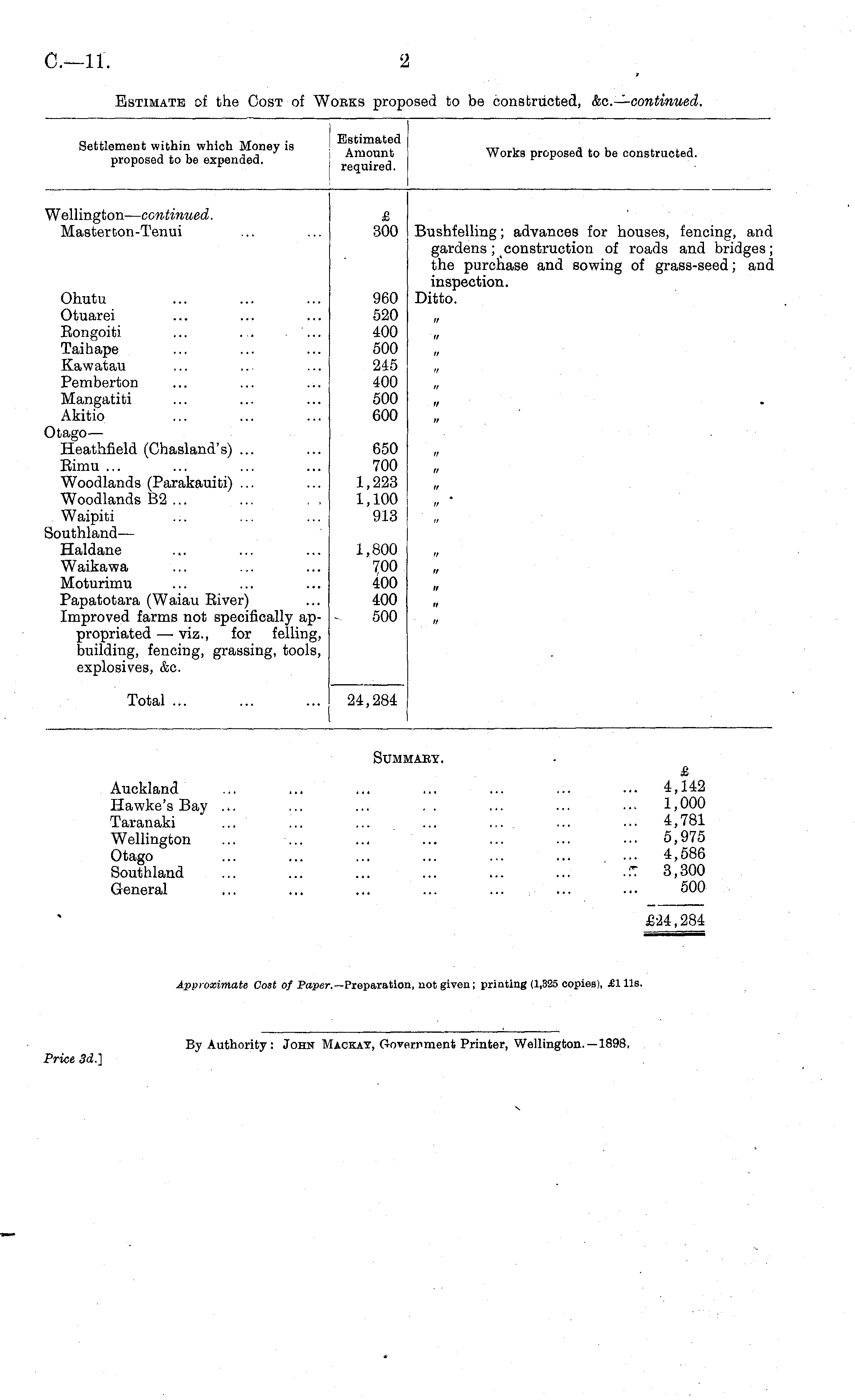 Summary. £ Auckland 4,142 Hawke'sßay ... ... ... . . ... ... ... 1,000 Taranaki ... ... ... ... ... ... ... 4,781 Wellington ... ... ... ... ... ... ... 5,975 Otago ... ... ... ... ... ... ... 4,586 Southland ... ... ... ... ... ... ■■'. 3,300 General ... ... ... ... ... ... ... 500 £24,284 Approximate Cost of Paper.— Preparation, not given; printing (1,325 copies), £1 lis.