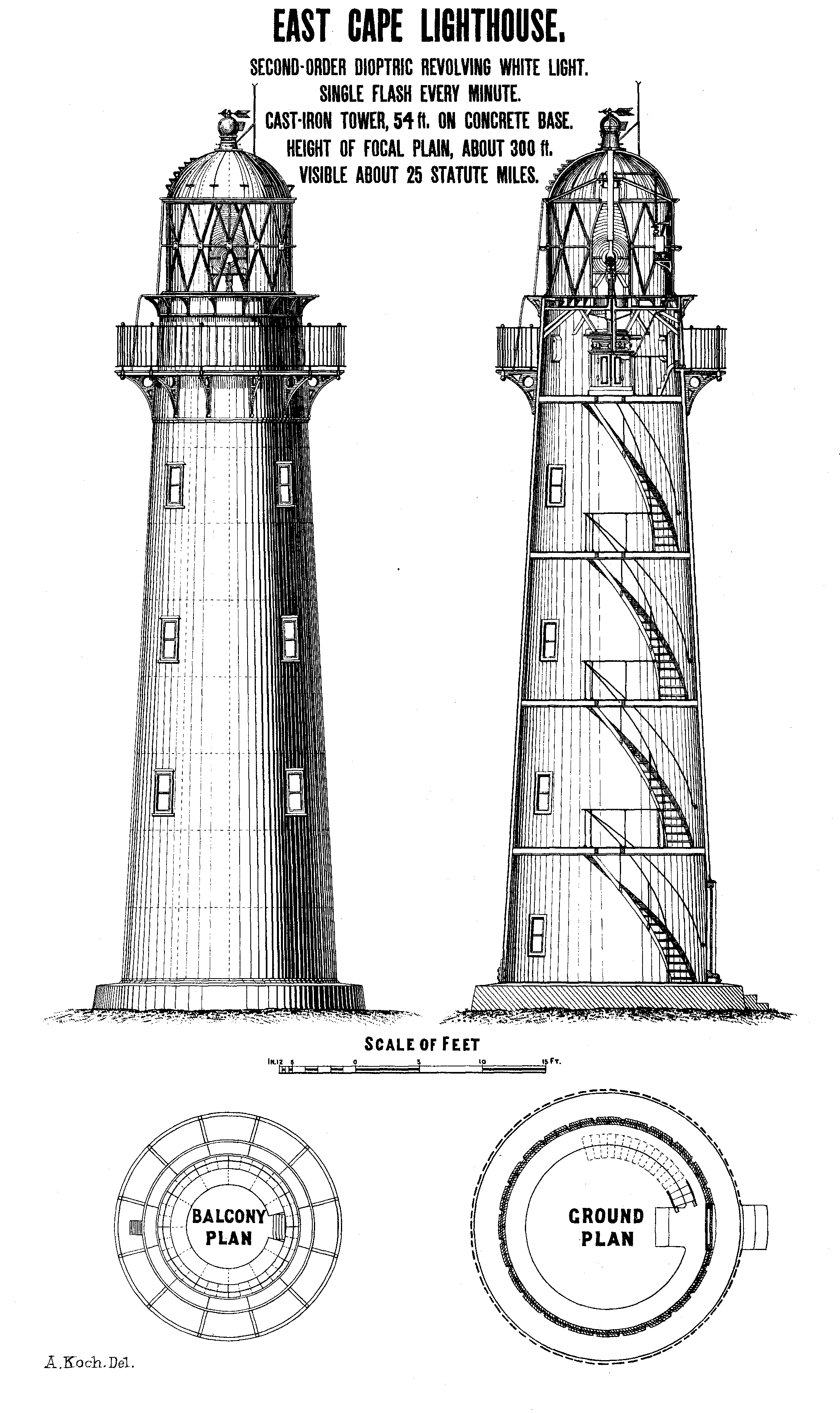EAST CAPE LIGHTHOUSE. SECOND-ORDER DIOPTRIC REVOLVING WHITE LIGHT. SINGLE FLASH EVERY MINUTE. CAST-IRON TOWER, 54 ft. ON CONCRETE BASE. HEIGHT OF FOCAL PLAIN, ABOUT 300 ft. INVISIBLE ABOUT 25 STATUTE MILES.
