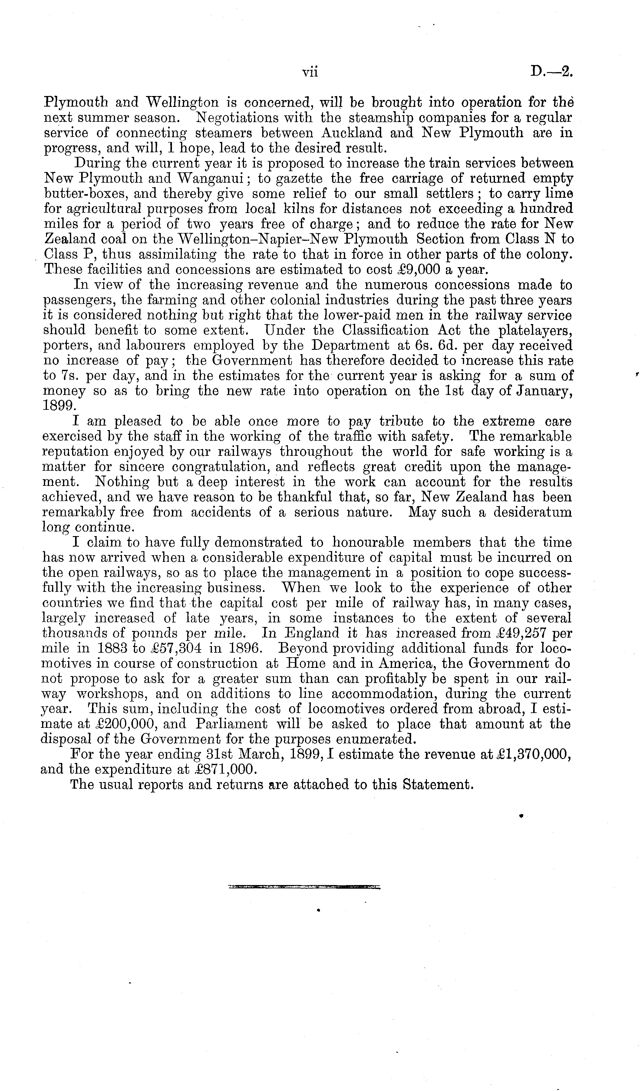 Plymouth and Wellington is concerned, will be brought into operation for the next summer season. Negotiations with the steamship companies for a regular service of connecting steamers between Auckland and New Plymouth are in progress, and will, I hope, lead to the desired result. During the current year it is proposed to increase the train services between New Plymouth and Wanganui; to gazette the free carriage of returned empty butter-boxes, and thereby give some relief to our small settlers ; to carry lime for agricultural purposes from local kilns for distances not exceeding a hundred miles for a period of two years free of charge; and to reduce the rate for New Zealand coal on the Wellington-Napier-New Plymouth Section from Class N to Class P, thus assimilating the rate to that in force in other parts of the colony. These facilities and concessions are estimated to cost £9,000 a year. In view of the increasing revenue and the numerous concessions made to passengers, the farming and other colonial industries during the past three years it is considered nothing but right that the lower-paid men in the railway service should benefit to some extent. Under the Classification Act the platelayers, porters, and labourers employed by the Department at 6s. 6d. per day received no increase of pay; the Government has therefore decided to increase this rate to 7s. per day, and in the estimates for the current year is asking for a sum of money so as to bring the new rate into operation on the Ist day of January, 1899. I am pleased to be able once more to pay tribute to the extreme care exercised by the staff in the working of the traffic with safety. The remarkable reputation enjoyed by our railways throughout the world for safe working is a matter for sincere congratulation, and reflects great credit upon the management. Nothing but a deep interest in the work can account for the results achieved, and we have reason to be thankful that, so far, New Zealand has been remarkably free from accidents of a serious nature. May such a desideratum long continue. I claim to have fully demonstrated to honourable members that the time has now arrived when a considerable expenditure of capital must be incurred on the open railways, so as to place the management in a position to cope successfully with the increasing business. When we look to the experience of other countries we find that the capital cost per mile of railway has, in many cases, largely increased of late years, in some instances to the extent of several thousands of pounds per mile. In England it has increased from £49,257 per mile in 1883 to £57,304 in 1896. Beyond providing additional funds for locomotives in course of construction at Home and in America, the Government do not propose to ask for a greater sum than can profitably be spent in our railway workshops, and on additions to line accommodation, during the current year. This sum, including the cost of locomotives ordered from abroad, I estimate at £200,000, and Parliament will be asked to place that amount at the disposal of the Government for the purposes enumerated. For the year ending 31st March, 1899,1 estimate the revenue at £1,370,000, and the expenditure at £871,000. The usual reports and returns are attached to this Statement.