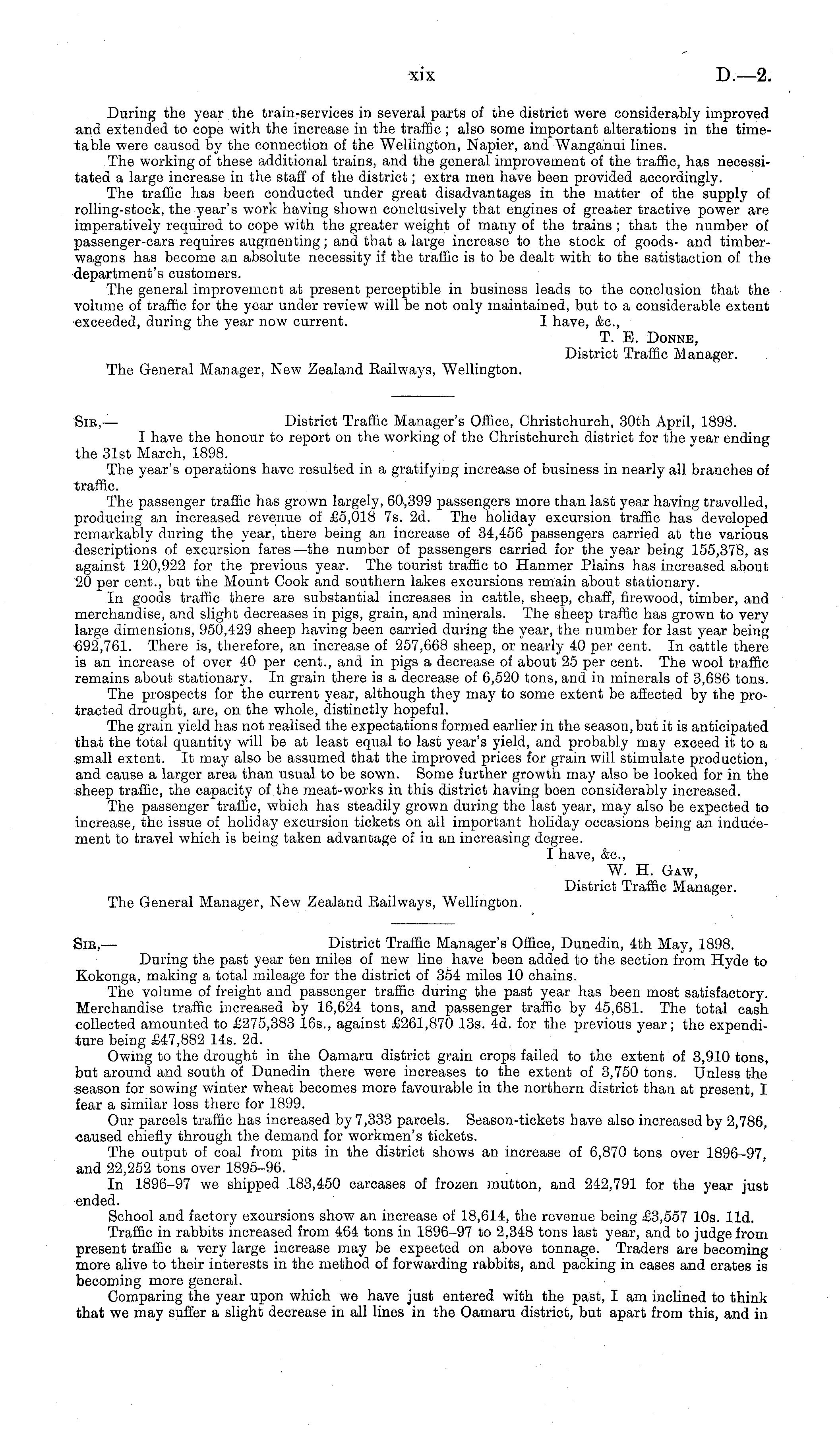 Sib, — District Traffic Manager's Office, Dunedin, 4th May, 1898. During the past year ten miles of new line have been added to the section from Hyde to Kokonga, making a total mileage for the district of 354 miles 10 chains. The volume of freight and passenger traffic during the past year has been most satisfactory. Merchandise traffic increased by 16,624 tons, and passenger traffic by 45,681. The total cash collected amounted to £275,383 165., against £261,870 13s. 4d. for the previous year; the expenditure being £47,882 14s. 2d. Owing to the drought in the Oamaru district grain crops failed to the extent of 3,910 tons, but around and south of Dunedin there were increases to the extent of 3,750 tons. Unless the season for sowing winter wheat becomes more favourable in the northern district than at present, I fear a similar loss there for 1899. Our parcels traffic has increased by 7,333 parcels. Season-tickets have also increased by 2,786, caused chiefly through the demand for workmen's tickets. The output of coal from pits in the district shows an increase of 6,870 tons over 1896-97 and 22,252 tons over 1895-96. In 1896-97 we shipped .183,450 carcases of frozen mutton, and 242,791 for the year just ended. School and factory excursions show an increase of 18,614, the revenue being £3,557 10s. lid. Traffic in rabbits increased from 464 tons in 1896-97 to 2,348 tons last year, and to judge from present traffic a very large increase may be expected on above tonnage. Traders are becoming more alive to their interests in the method of forwarding rabbits, and packing in cases and crates is becoming more general. Comparing the year upon which we have just entered with the past, I am inclined to think that we may suffer a slight decrease in all lines in the Oamaru district, but apart from this, and in
