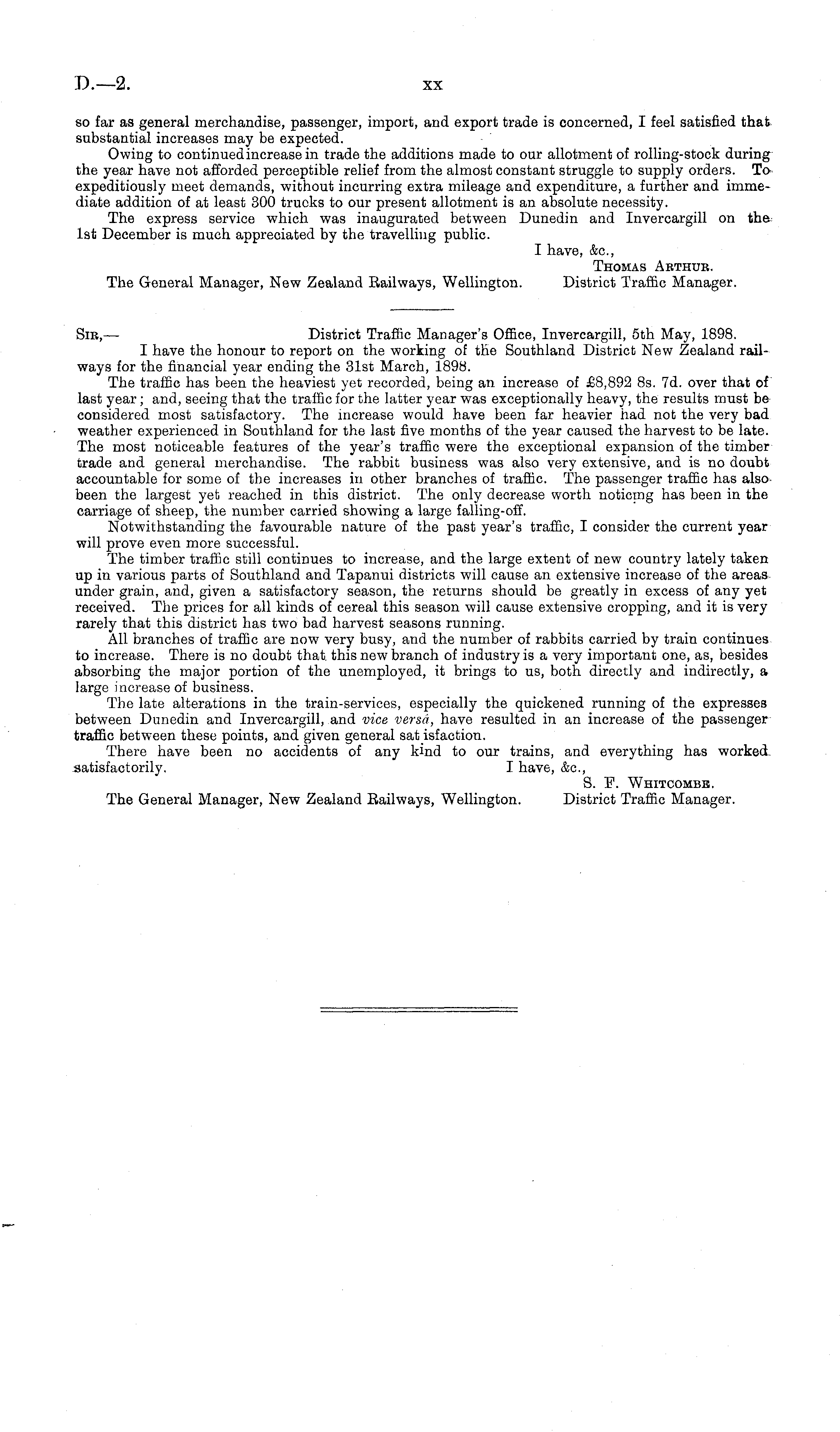 so far as general merchandise, passenger, import, and export trade is concerned, I feel satisfied that substantial increases may be expected. Owing to continued increase in trade the additions made to our allotment of rolling-stock during the year have not afforded perceptible relief from the almost constant struggle to supply orders. To expeditiously meet demands, without incurring extra mileage and expenditure, a further and immediate addition of at least 300 trucks to our present allotment is an absolute necessity. The express service which was inaugurated between Dunedin and Invercargill on the Ist December is much appreciated by the travelling public. I have, &c, Thomas Aethub. The General Manager, New Zealand Eailways, Wellington. District Traffic Manager.