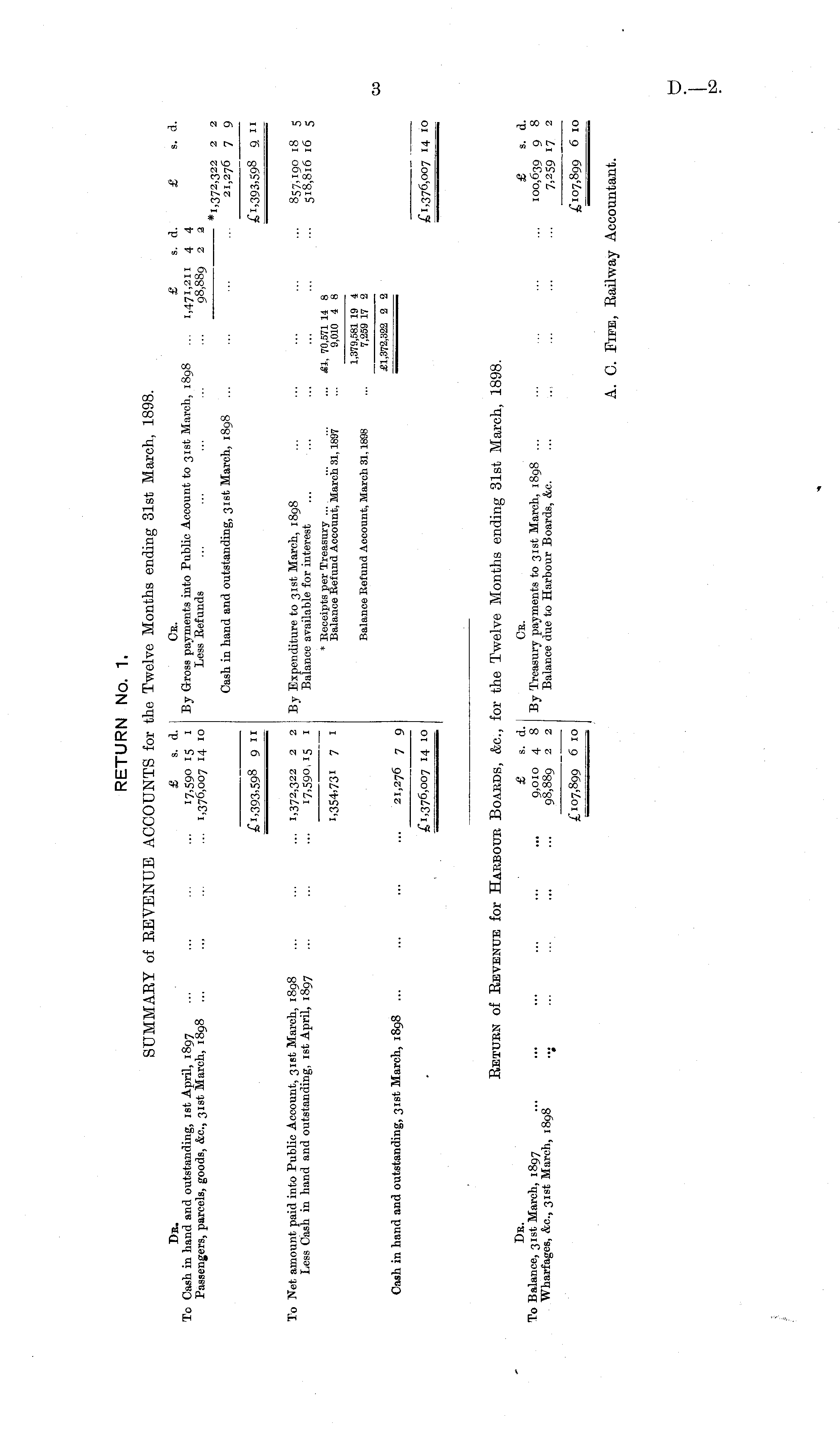 Db. £ s. d. Ce. £ s. d. To Cash in hand and outstanding, ist April, 1897 ... ... ... ... 17,590 IS 1 By Gross payments into Public Account to 31st March, 1898 ... 1,471,211 4 4 Passengers, parcels, goods, &c, 31st March, 1898 ... ... ... ... 1,376,007 14 10 Less Refunds ... ... ... ... ... 98,889 2 3 £ s. d. *I.172.'}22 2 2 s. d. Cash in hand and outstanding, 31st March, 1898 " z z 21,276 7 9 -1,372,322 2 2 21,276 7 9 £i,393,59 8 9 'i £i,393,598 9 11 £1,393,598 a » To Net amount paid into Public Account, 31st March, 1898 ... ... ... 1,372,322 2 2 By Expenditure to 31st March, 1898 Less Cash in hand and outstanding, 1 st April, 1897 ... ... ... 17,590,15 1 ' Balance available for interest * Eeceipts per Treasury ... ... ... ... £1, 70,571 14 8 !,354>73i 7 I Balance Behind Account, March 31,1897 ... 9,010 4 8 1,379,581 19 4 Balance Refund Account, March 31,1898 ... 7,259 17 2 £1,372,322 2 2 Cash in hand and outstanding, 31st March, 1898 ... ... ... ... 21,276 7 9 £1,376,007 14 10 857,190 18 5 518,816 16 5 £1,376,007 14 10 ' . 1 Betukn of Bevbnue for Haeboub Boards, &c, for the Twelve Months ending 31st March, 1898. De. - £ s. d. Ce. To Balance, 31st March, 1897 ... ... ... ... ... ... 9,010 4 8 By Treasury payments to 31st March, 1898 ... Wharfages, &c, 31st March, 1898 .. ; ... ... ... ... 98,889 2 2 Balance due to Harbour Boards, &c. £107,899 6 10 £ s. d. 100,639 9 8 7,259 17 2 £107,899 6 10