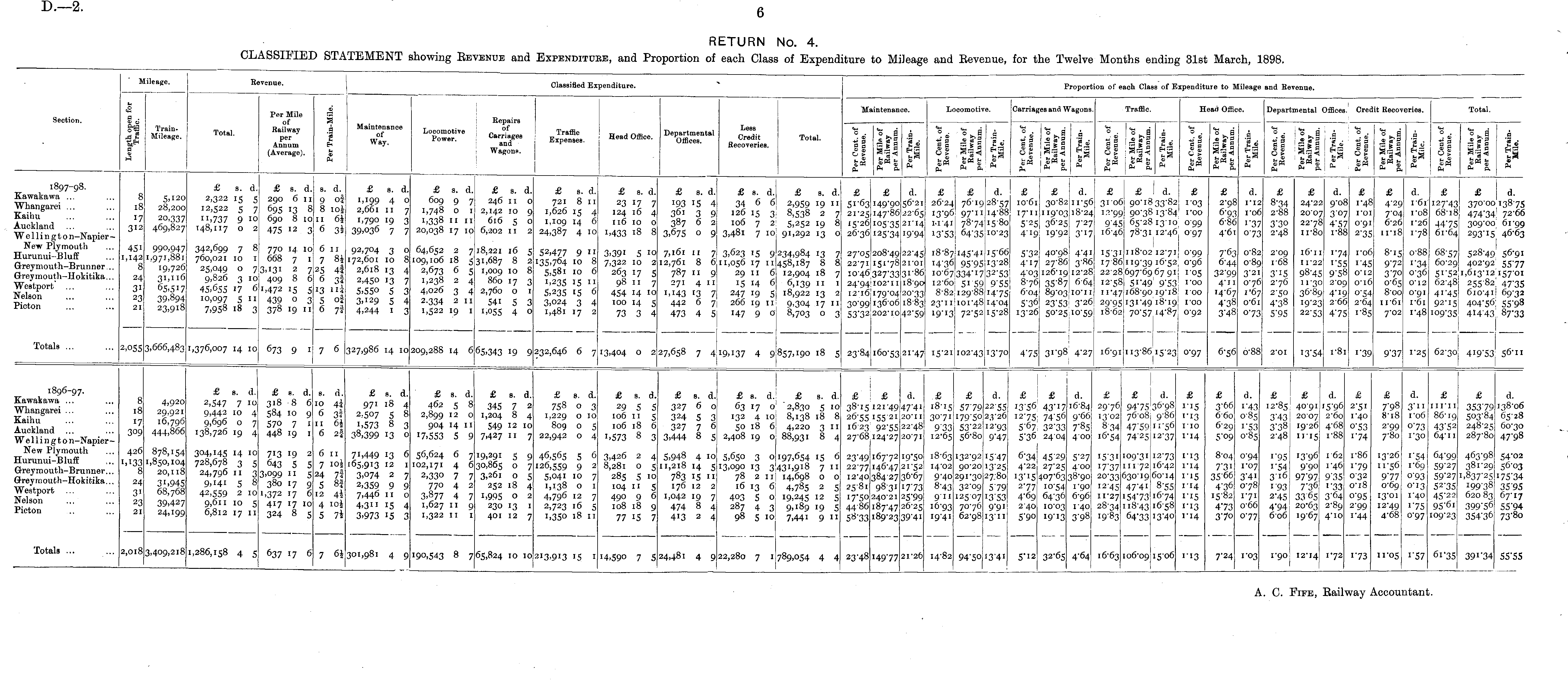 RETURN No. 4. CLASSIFIED STATEMENT showing Revenue and Expenditure, and Proportion of each Class of Expenditure to Mileage and Revenue, for the Twelve Months ending 31st March, 1898.