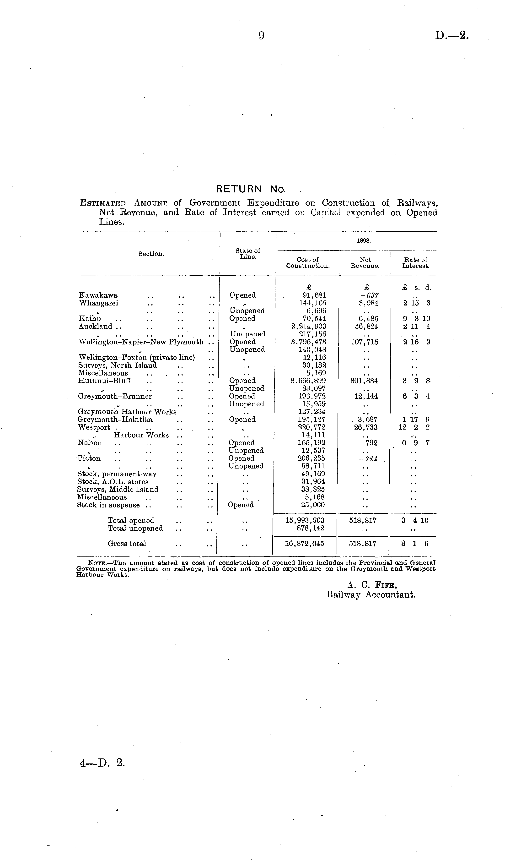1898. Section. State of Line. Cost of Construction. Net Revenue. Kate of Interest. £ 91,681 144,105 6,696 70,544 2,214,903 217,156 3,796,473 140,048 42,116 30,182 5,169 8,666,899 83,097 196,972 15,959 127,234 195,127 220,772 14,111 165,192 12,537 206,235 58,711 49,169 31,964 38,825 5,168 25,000 15,993,903 878,142 -637 3,984 £ s. d. Kawakawa Whangarei Opened 2 15 3 Kaibu Auckland Unopened Opened 6,485 56,824 9 3 10 2 11 4 Wellington-Napier-New Plymouth .. Wellington-Foxton (private line) Surveys, North Island Miscellaneous Hurunui-Blufi Unopened Opened Unopened 107,715 2 16 9 Opened Unopened Opened Unopened 301,' 834 8 9 8 Greymouth-Brunner 12,144 6 3 4 Grey mouth Harbour Works Greymouth-Hokitika Westport . . „ Harbour Works Nelson Opened 3,687 26,733 1 17 9 12 2 2 Opened Unopened Opened Unopened 792 0 9 7 Picton -744 Stock, permanent-way Stock, A.O.Ij. stores Surveys, Middle Island Miscellaneous Stock in suspense Opened Total opened Total unopened 518,817 3 4 10 Gross total 16,872,045 518,817 3 16 Note.—The amount stated as cost of rovernment expenditure on railways, bui [arbour Works. construction of does not inclm jpened lines includes the Provincial and General le expenditure on the Greymouth and Weitport