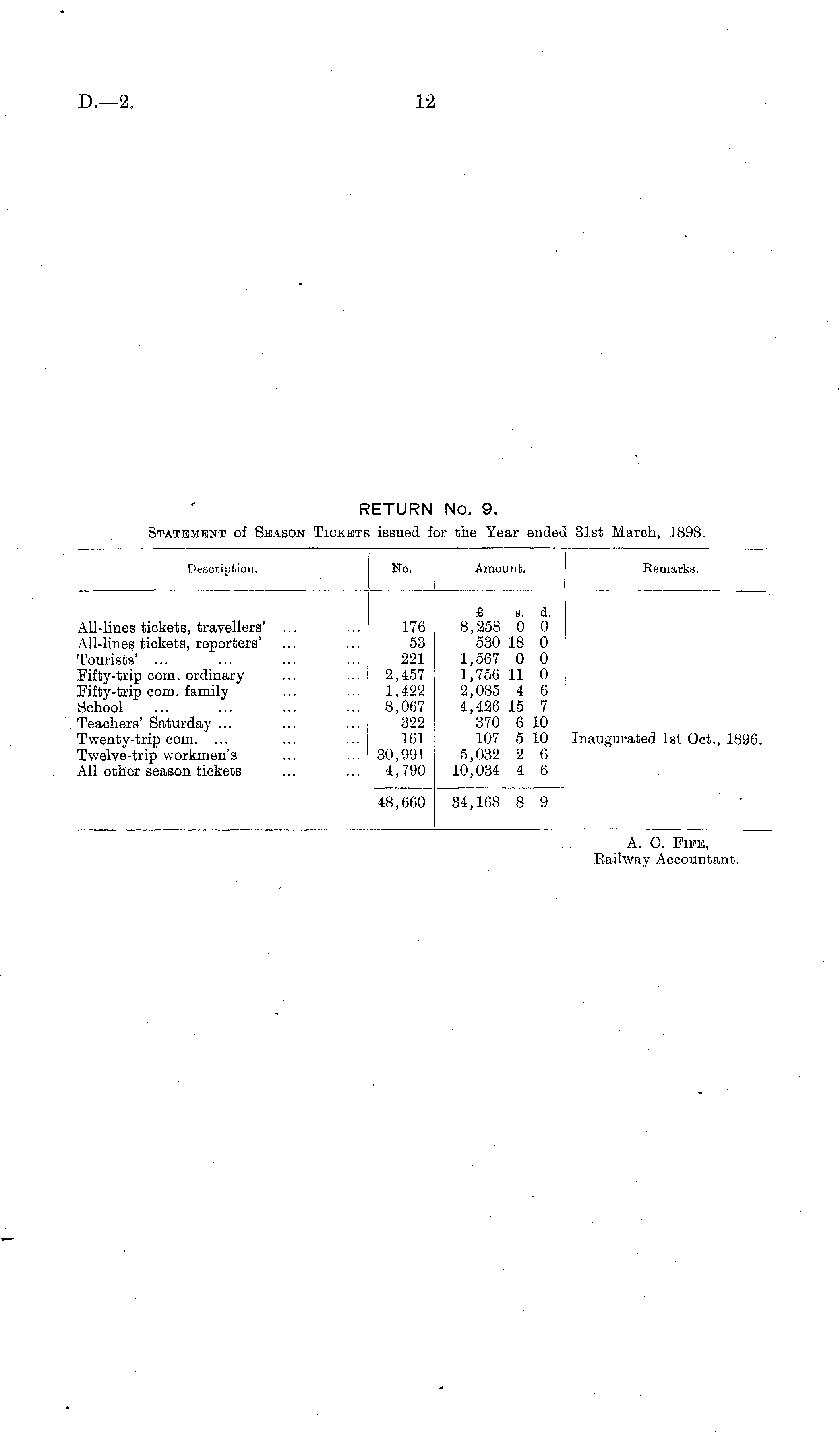 Description. No. Amount. Remarks. All-lines tickets, travellers' All-lines tickets, reporters' Tourists' ... Fifty-trip com. ordinary Fifty-trip com. family School Teachers' Saturday ... Twenty-trip com. ... Twelve-trip workmen's All other season tickets 176 53 221 2,457 1,422 8,067 322 161 30,991 4,790 £ s. d. 8,258 0 0 530 18 0 1,567 0 0 1,756 11 0 2,085 4 6 4,426 15 7 370 6 10 107 5 10 5,032 2 6 10,034 4 6 Inaugurated 1st Oct., 1896.. 48,660 34,168 8 9