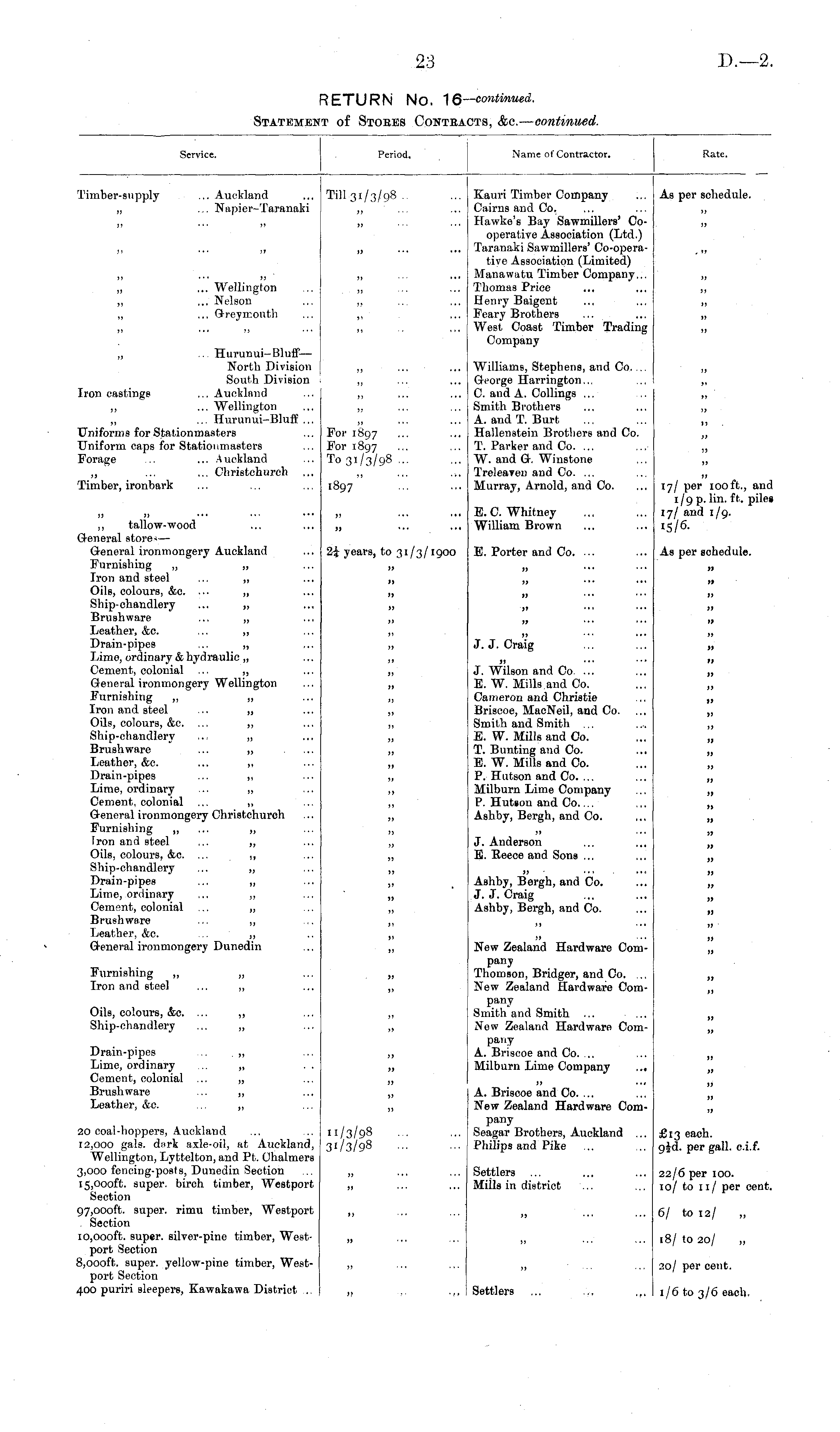 Service. Period. Name of Contractor. Rate. Timber-supply ... Auckland „ ... Napier-Taranaki Till 31/3/98 Kauri Timber Company Cairns and Co. Hawke's Bay Sawmillers' Cooperative Association (Ltd.) Taranaki Sawmillers' Co-opera-tive Association (Limited) Manawatu Timber Company... Thomas Price Henry Baigent Feary Brothers West Coast Timber Trading Company As per schedule. .. • ■ • >> „ ... Wellington „ ... Nelson ,, ... Greymouth »> „ .. Hurunui-Bluff — North Division South Division Iron castings ... Auckland „ ... Wellington „ ... Hurunui-Bluff... Uniforms for Stationmasters Uniform caps for Stationmasters Forage ... ... Auckland „ ... ... Christchurch Timber, ironbark For 1897 For 1897 To 31/3/98 Williams, Stephens, and Co George Harrington.., C. and A. Collings ... Smith Brothers A. and T.Burt Hallenstein Brothers and Co. T. Parker and Co. ... W. and G. Winstone Treleaven and Co. ... Murray, Arnold, and Co. » .1 .1 51 ,, ,, ... ... ... ,, tallow-wood General store* — General ironmongery Auckland Furnishing „ „ Iron and steel ... ,, Oils, colours, &c. ... „ Ship-chandlery ... „ Brushware ... „ Leather, &c. ... ,, Drain-pipes ... „ Lime, ordinary & hydraulic ,, Cement, colonial ... ,, General ironmongery Wellington Furnishing ,, „ Iron and steel ... „ Oils, colours, &c. ... ,, Ship-chandlery ... „ Brushware ... „ Leather, &c. ... ,, Drain-pipes ... ,, Lime, ordinary ... ,, Cement, colonial ... ,, General ironmongery Christchurch Furnishing ,, ... „ Iron and steel ... „ Oils, colours, &c. ... ,, Ship-chandlery ... „ Drain-pipes ... „ Lime, ordinary ... ,, Cement, colonial ... „ Brushware ... ,, Leather, &c. ... „ General ironmongery Dunedin 1897 E.C.Whitney William Brown 17/ per 100 ft., and i/9p.lin. ft. piles 17/ and 1/9. iS/6. jj ... ... 2£ years, to 31/3/1900 E. Porter and Co. ... As per schedule. a •" » T» "• ••• >) » » It it ,, ... ... J. J. Craig n »» J. Wilson and Co ... E. W. Mills and Co. Cameron and Christie Briscoe, MacNeil, and Co. Smith and Smith ... E. W. Mills and Co. T. Bunting and Co. E. W. Mills and Co. P. Hutson and Co. ... Milburn Lime Company P. Hution and Co.... Ashby, Bergh, and Co. »» »» j> j» >> »» jj jj )> » »> J. Anderson E. Reece and Sons ... ») n » ,, - ... ... Ashby, Bergh, and Co. J. J. Craig Ashby, Bergh, and Co. i» >» ») a Furnishing ,, „ Iron and steel ... „ Oils, colours, &c. ... „ Ship-chandlery ... ,, New Zealand Hardware Company Thomson, Bridger, and Co. ... New Zealand Hardware Company Smith and Smith New Zealand Hardware Company A. Briscoe and Co. ... Milburn Lime Company )> >> j» » Drain-pipes ... . ,, Lime, ordinary ... „ Cement, colonial ... „ Brushware ... ,, Leather, &c. ... ,, A. Briscoe and Co. ,.. New Zealand Hardware Company Seagar Brothers, Auckland ... Philips and Pike >j a » 20 coal-hoppers, Auckland 12,000 gals. dt»rk axle-oil, at Auckland, Wellington, Lyttelton, and Pt. Chalmers 3,000 fencing-posts, Dunedin Section 15,000ft. super, birch timber, Westport Section 97,000ft. super, rimu timber, Westport Section 10,000ft. super, silyer-pine timber, Westport Section 8,000ft. super, yellow-pine timber, Westport Section 400 puriri sleepers, Kawakawa District ... »/3/98 31/3/98 £13 each. 9|d. per gall, c.i.f. Settlers Mills in district 22/6 per 100. 10/ to 11/ per cent. ,, 6/ to 12/ „ 18/ to 20/ „ 20/ per cent. Settlers ... ... ... 1/6 to 3/6 each.
