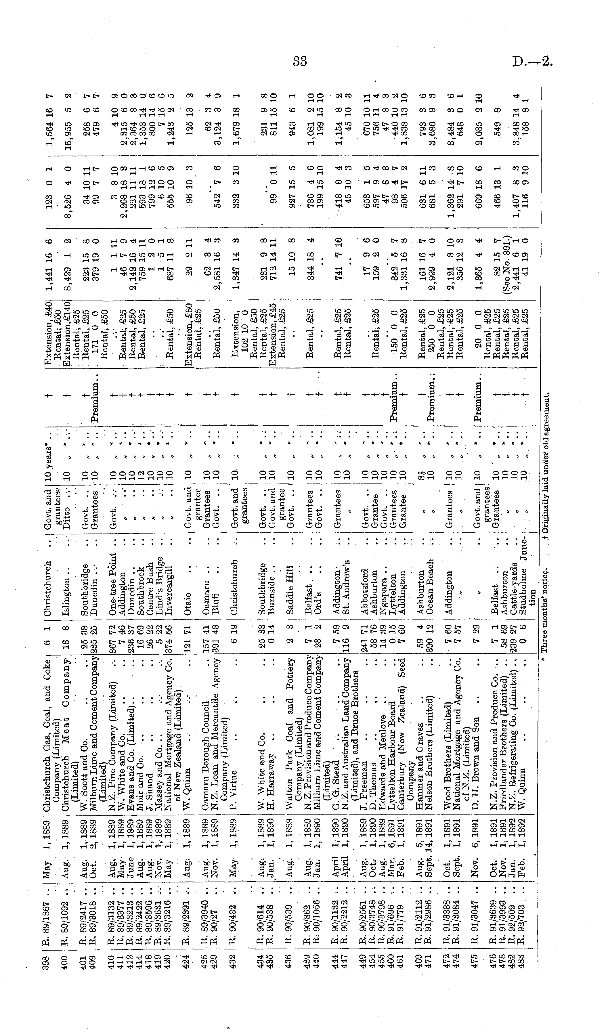 oy/iooj .. May 1, 1889 Christchurch Gas, Coal, and Coke Company (Limited) Christchurch Meat Company(Limited) W. Scott and Co. Milburn Lime and Cement Company (Limited) N.Z. Pine Company (Limited) W. White and Co. Evans and Co. (Limited) Moir and Co. J. Shand Massey and Co. .. National Mortgage and Agency Co. of New Zealand (Limited) W. Quinn 6 1 Christchurch Govt. and granteesDitto .. 10 years* .. t Extension, £40 Rental; £50 Extension, £140 Rental, £25 Eental, £25 . 171 0 0 Rental, £50 Eental; £25 Eental, £50 Eental, £25 1,441 16 6 123 0 1 I 1,564 16 7 400 R. 89/1692 .-. Aug. 1,1889 13 8 Islington 10 „ t 8,429 1 2 8,526 4 0 16,955 5 2 401 409 E. 89/2417 .. E. 89/3018 .. Aug. 1, 1889 Oct. 2, 1889 25 38 235 25 Southbridge Dunedin Govt. .. Grantees 10 „ *".. 10 „ * t Premium.. 223 15 8 379 19 0 34 10 11 99 7 7 258 6 7 479 6 7 410 411 412 414 418 419 420 E. 89/3132 .. R. 89/3377 .. E. 89/3213 .. R. 89/2422 .. E. 89/3596 .. R. 89/3631 .. E. 89/3216 .. Aug. 1, 1889 May 1, 1889 June 1, 1889 Aug. 1, 1889 Aug. 1, 1889 Nov. 1, 1889 May 1, 1889 Aug. 1, 1889 367 72 7 46 236 37 16 69 26 22 5 22 374 56 One- tree Point .. Addington Dunedin Southbrook Centre Bush Lind's Bridge Invercargill Govt. . i 10 „ *..- 10 „ * .. 10 „ • .. 12 , • .. 10 „ * .. 10 „ * .. 10 „ * .. t t t t t t t 1 1 11 46 7 9 2,142 16 4 759 15 11 12 0 15 1 687 11 8 3 8 10 2,268 18 3 221 11 11 593 18 1 799 12 6 6 10 5 555 10 9 4 10 9 2,315 6 0 2,364 8 3 1,353 14 0 800 14 6 7 15 6 1,243 2 5 •• Eental, £50 424 E. 89/2391 .-. 121 71 Otaio Govt. and grantee Grantees Govt. .. 10 „ * .. t Extension, £80 I Eental, £25 29 2 11 96 10 3 125 13 2 425 429 R. 89/3940 .. E. 90/27 .. Aug. 1, 1889 Nov. 1, 1889 Oamaru Borough Council N.Z. Loan and Mercantile Agency Company (Limited) P. Virtue 157 41 391 48 Oamaru Blufl 10 „ * .. 10 „ * .. t t Eentai, £50 62 3 4 2,581 16 3 542 7 6 62 3 4 3,124 3 9 432 E. 90/432 .. May 1, 1889 6 19 Christchurch Govt. and grantees 10 „ * .. t Extension, 102 10 0 Eental, £50 Eental, £25 Extension, £45 Eental, £25 1,347 14 3 332 3 10 1,679 18 1 434 435 E. 90/614 .. E. 90/538 .. Aug. 1, 1889 Jan. 1,1890 W. White and Co. H. Harraway 25 33 0 14 Southbridge Burnside ,. Govt. .. Govt. and grantee Govt. .. 10 „ * .. 10 „ * .. t t 231 9 8 712 14 11 99 - 0 11 231 9 8 811 15 10 436 E. 90/539 .. Aug. 1, 1889 Walton Park Coal and Pottery Company (Limited) N.Z. Provision and Produce Company Milburn Lime and Cement Company (Limited) G. G. Stead N.Z. and Australian Land Company (Limited), and Bruce Brothers J. Freeman D. Thomas Edwards and Menlove Lyttelton Harbour Board Canterbury (New Zealand) Seed Company Hanmer and Graves Nelson Brothers (Limited) Wood Brothers (Limited) National Mortgage and Agency Co. of N.Z. (Limited) D. H. Brown and Son 2 3 Saddle Hill 10 '„'*.. t 15 10 8 927 15 5 943 6 1 439 440 E. 90/862 .. R. 90/1056 .. Aug. 1, 1889 Jan. 1, 1890 7 1 23 2 Belfast .. .. Ord's Grantees Govt. .. 10 „ * .. 10 „ * .. t Eental, £25 344 18 4 736 4 6 199 15 10 1,081 2 10 199 15 10 444 447 R. 90/1132 :. R. 90/2212 .. April 1, 1890 April 1, 1890 7 59 116 9 Addington ■ St. Andrew's Grantees 10 „ * .. 10 „ • .. t t Eental, £25 Eental, £25 741 7 10 413 0 4 45 10 3 1,154 8 2 45 10 3 449 454 455 460 461 E. 90/2561 .. R. 90/3748 .. E. 90/3798 .. E. 91/696 .. R. 91/779 .. Aug. 1, 1889 Oct.- 1, 1890 Aug. 1, 1889 Mar. 6, 1891 Feb. 1, 1891' 241 71 58 76 14 39 0 15 7 60 Abbotsford Ashburton Ngapara Lyttelton Addington Govt. .. Grantee Govt. .. Grantees Grantee 10 „ * .. 10 „ ' .. 10 „ ' .. 10 „ * .. 10 „ * .. t t Premium.. t Eentai, £25 17 9 6 159 2 0 653 1 5 597 9 4 47 8 3 98 4 7 506 17 2 670 10 11 756 11 4 47 8 3 440 10 2 1,838 13 10 150 0 0 Rental, £25 342"5 7 1,331 16 8 469 471 E. 91/2112 .. R. 91/2986 .. Aug. 5, 1891 Sept. 14, 1891 59 4 390 12 Ashburton Ocean Beach 8* . *.. 10 ;, *;: t Premium.. Eental, £25 250 0 0 Rental, £25 Eental, £25 Rental, £25 161 16 7 2,999 4 0 631 6 11 681 5 3 793 3 6 3,680 9 3 472 474 E. 91/3338 .. E. 91/3084 .. Oct. 1, 1891 Sept. 1, 1891 7 60 7 57 Addington Grantees 10 „ * .. 10 „ .*,„., t t 2,121 8 10 356 12 3 1,362 14 8 291 7 10 3,484 3 6 648 0 1 475 R. 91/3047 .. Nov. 6, 1891 7 29 Govt. and grantees Grantees 10 „ * .. Premium.. 20 0 0 Rental, £25 Rental, £25 Rental, £25 Rental, £25 Rental, £25 1,365 4 4 669 18 6 2,035 2 10 476 478 482 483 E. 91/3639 .. R. 91/3993 .. R. 92/509 .. R. 92/703 .. Oct. 1, 1891 Nov. lj 1891 Jan. 1, 1892 Feb. 1, 1892 N.Z. Provision and Produce Co. .. Friedlander Brothers (Limited) .. N.Z. Refrigerating Co. (Limited) .. W. Quinn 7 1 58 69 239 27 0 6 Belfast .. Ashburton Cattle-yards Studholme Junction 10 „ * .. 10 „ * .. 10 „ ' .. 10 „ * .. t t 4 t ■ 82 15 7 (See No. 391.) 2,441 6 1 41 19 0 466 13 1 549 8 1,407 8 3 116 9 10 3,848 14 4 158 8 1 * Three months' notice. t Originally laid under old aj [reenient.
