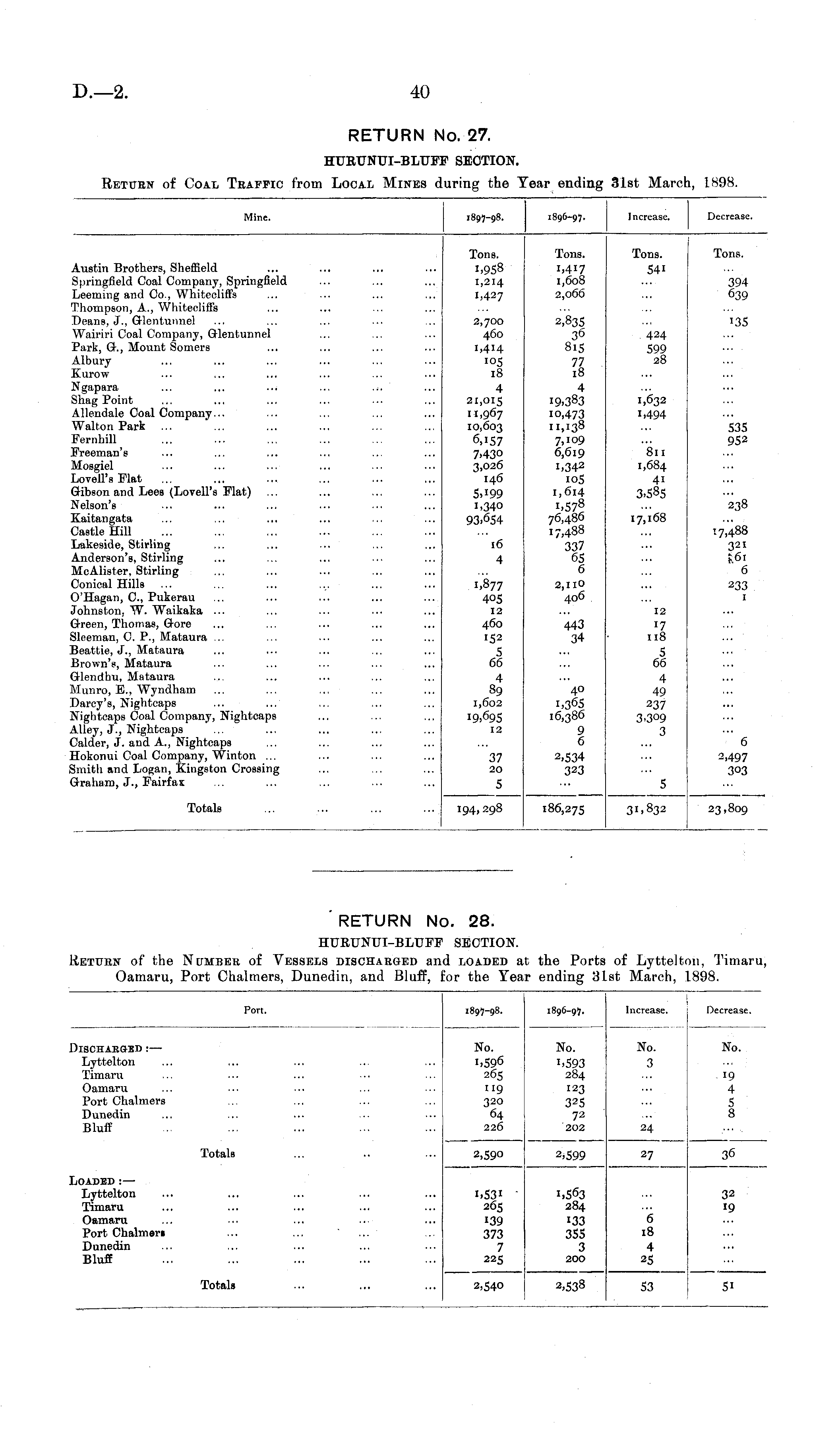 RETURN No. 27. HURUNUI-BLUFF SECTION. Return of Coal Traffic from Local Mines during the Year ending 31st March, 1898.