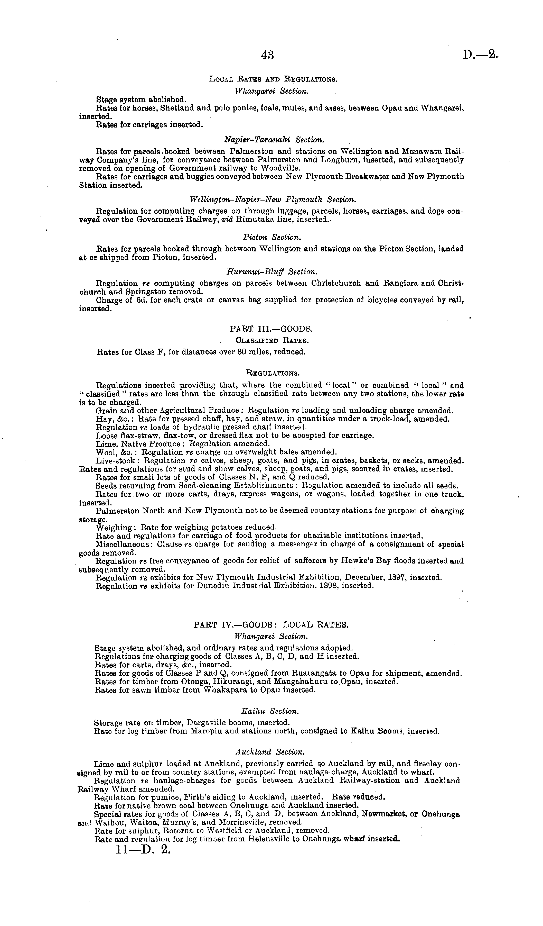 Local Rates and Regulations. Whangarei Section. Stage system abolished. Rates for horses, Shetland and polo ponies, foals, mules, and asses, between Opau and Whangarei, inserted. Rates for carriages inserted. Napier-Taranaki Section. Rates for parcels booked between Palmerston and stations on Wellington and Manawatu Railway Company's line, for conveyance between Palmerston and Longburn, inserted, and subsequently removed on opening of Government railway to Woodville. Rates for carriages and buggies conveyed between New Plymouth Breakwater and New Plymouth Station inserted. Wellington-Napier-New Plymouth Section. Regulation for computing charges on through luggage, parcels, horses, carriages, and dogs oonveyed over the Government Railway, via Rimutaka line, inserted.Picton Section. Rates for parcels booked through between Wellington and stations on the Picton Section, landed at or shipped from Picton, inserted. Hurunui-Bluff Section. Regulation re computing charges on parcels between Christchurch and Rangiora and Christchurch and Springston removed. Charge of 6d. for each crate or canvas bag supplied for protection of bicycles conveyed by rail, inserted. PART lII.—GOODS. Classified Rates. Rates for Class F, for distances over 30 miles, reduced. Regulations. Regulations inserted providing that, where the combined " local" or combined " local " and " classified " rates are less than the through classified rate between any two stations, the lower rate is to be charged. Grain and other Agricultural Produce : Regulation re loading and unloading charge amended. Hay, &o.: Rate for pressed chaff, hay, and straw, in quantities under a truck-load, amended. Regulation re loads of hydraulio pressed chaff inserted. Loose flax-straw, flax-tow, or dressed flax not to be accepted for carriage. Lime, Native Produce : Regulation amended. Wool, &c. : Regulation re charge on overweight bales amended. Live-stock: Regulation re calves, sheep, goats, and pigs, in crates, baskets, or sacks, amended. Rates and regulations for stud and show calves, sheep, goats, and pigs, secured in crates, inserted. Rates for small lots of goods of Classes N, P, and Q reduced. Seeds returning from Seed-cleaning Establishments : Regulation amended to include all seeds. Rates for two or more carts, drays, express wagons, or wagons, loaded together in one truck, inserted. Palmerston North and New Plymouth not to be deemed country stations for purpose of charging storage. Weighing : Rate for weighing potatoes reduced. Rate and regulations for carriage of food products for charitable institutions inserted. Miscellaneous: Clause re charge for sending a messenger in charge of a consignment of speoial goods removed. Regulation re free conveyance of goods for relief of sufferers by Hawke's Bay floods inserted and subsequently removed. Regulation re exhibits for New Plymouth Industrial Exhibition, December, 1897, inserted. Regulation re exhibits for Dunedin Industrial Exhibition, 1898, inserted. PART IV.—GOODS : LOCAL RATES. Whangarei Section. Stage system abolished, and ordinary rates and regulations adopted. Regulations for charging goods of Classes A, B, C, D, and H inserted. Rates for carts, drays, &c, inserted. Rates for goods of Classes P and Q, consigned from Ruatangata to Opau for shipment, amended. Rates for timber from Otonga, Hikurangi, and Mangahahuru to Opau, inserted. Rates for sawn timber from Whakapara to Opau inserted. Kaihu Section. Storage rate on timber, Dargaville booms, inserted. Rate for log timber from Maropiu and stations north, consigned to Kaihu Booms, inserted. Auckland Section. Lime and sulphur loaded at Auckland, previously carried to Auckland by rail, and fireclay consigned by rail to or from country stations, exempted from haulage-charge, Auckland to wharf. Regulation re haulage-charges for goods between Auckland Railway-station and Auckland Railway Wharf amended. Regulation for pumice, Firth's siding to Auckland, inserted. Rate reduced. Rate for native brown coal between Onehunga and Auckland inserted. Special rates for goods of Classes A, B, C, and D, between Auckland, Newmarket, or Onehunga ami Waihou, Waitoa, Murray's, and Morrinsville, removed. Rate for sulphur, Rotorua to Westfield or Auckland, removed. Rate and regulation for log timber from Helensvillo to Onehunga wharf inserted.