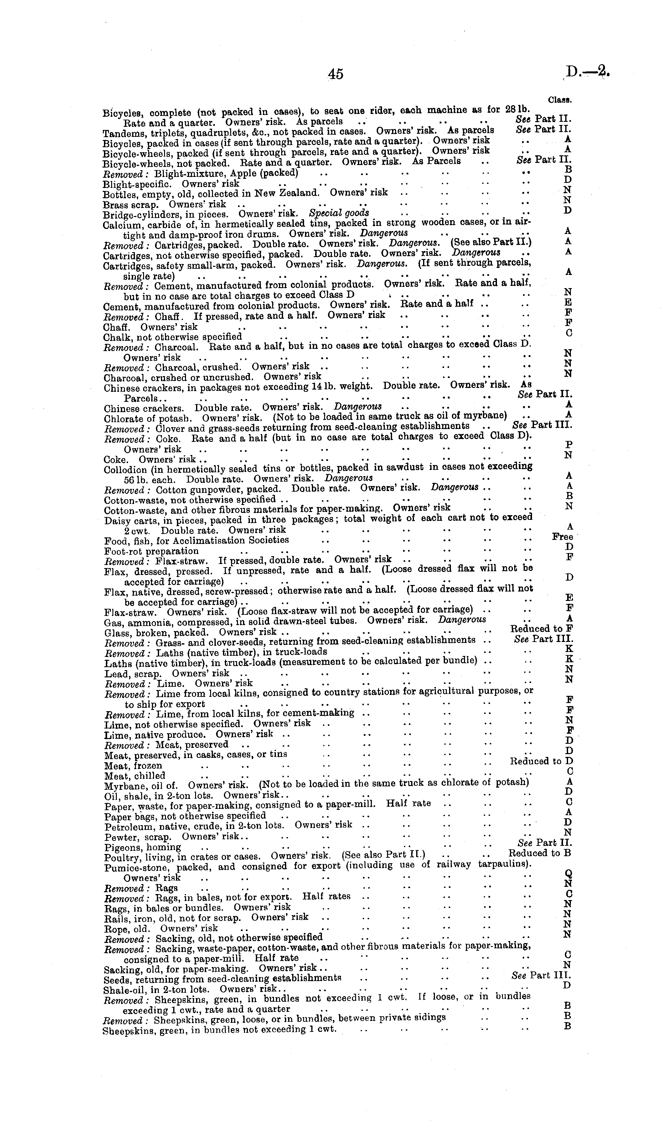 Class. Bicycles, complete (not packed in cases), to seat one rider, each machine as for 28 lb. Rate and a quarter. Owners'risk. As parcels .." .. .. •• ° M ™^ Tandems, triplets, quadruplets, &c, not packed in cases. Owners' risk. As parcels See l*art 11. Bicycles, packed in cases (if sent through parcels, rate and a quarter). Owners'risk .. A Bicycle-wheels, packed (if sent through parcels, rate and a quarter). Owners' risk .. A Bicycle-wheels, not packed. Rate and a quarter. Owners' risk. As Parcels .. See Part 11. Removed : Blight-mixture, Apple (packed) .. .. • • • • • • • • -° Blight-specific. Owners' risk .. .. • • •-..-' ■ ■ • • ij Bottles, empty, old, oolleoted in New Zealand. Owners' risk .. .. •• • ■ £1 Brass scrap. Owners' risk .. .. • • • • • ■ • • • • • • ** Bridge-cylinders, in pieces. Owners' risk. Special goods .. ■■ ■■ _•• v Calcium, carbide of, in hermetically sealed tins, packed in strong wooden cases, or m airtight and damp-proof iron drums. Owners'risk. Dangerous .. .. •• A Removed: Cartridges, packed. Double rate. Owners'risk. Dangerous. (See also Part II.) A Cartridges, not otherwise speoified, packed. Double rate. Owners'risk. Dangerous .. A Cartridges, safety small-arm, packed. Owners' risk. Dangerous. (If sent through parcels, single rate) .. .. • • • • • • _ •*,.'-* -, . "-"» vii Removed : Cement, manufactured from colonial products. Owners risk. Hate and a nan, but in no case are total charges to exceed Class D ... ,".,.*' ' * S Cement, manufactured from colonial products. Owners' risk. Rate and a half .. .. & Removed : Chaff. If pressed, rate and a half. Owners' risk .. .. .. ■ • V Chaff. Owners' risk .. .. ■ • • ■ • ■ ■ • • • ■ - * Chalk, not otherwise specified .. .. • • • • • ■ ■ • ■ ■ *-" Removed : Charcoal. Rate and a half, but in no oases are total charges to exceed Class D. Owners' risk .. .. • • • • • • • • • • • • * * r: Removed: Charcoal, crushed. Owners'risk .. .. .. •• •• •• -N Charcoal, crushed or uncrushed. Owners' risk .. .. • • .. .. Chinese crackers, in packages not exceeding 14 lb. weight. Double rate. Owners risk. As Parcels.. . See Part II Chinese crackers. Double rate. Owners' risk. Dangerous .. .. .... A Chlorate of potash. Owners' risk. (Not to be loaded in same truck as oil of myrbane) .. A Removed : Clover and grass-seeds returning from seed-cleaning establishments .. See Part 111. Removed: Coke. Rate and a half (but in no case are total charges to exoeed Class D). Owners'risk .. .. .. •• •• •• •• •• , *• .£ Coke. Owners'risk .. .. -. •• •• •• •• •• •■ Collodion (in hermetically sealed tins or bottles, packed in sawdust in cases not exceeding 56 lb. each. Double rate. Owners' risk. Dangerous .. .. • • • • A Removed : Cotton gunpowder, packed. Double rate. Owners' risk. Dangerous .. .. A Cotton-waste, not otherwise specified .. .. .. • • • • • • • • -° Cotton-waste, and other fibrous materials for paper-making. Owners* risk .. .. -N Daisy carts, in pieces, packed in three packages; total weight of each cart not to exceed 2 cwt. Double rate. Owners' risk .. .. • ■ • • • • • ■ -p Food, fish, for Acclimatisation Societies .. .. •• ■• •• •• Vt Foot-rot preparation .. .. • • • • • ■ • • •■ • • r. Removed: Flax-straw. If pressed, double rate. Owners'risk .. .. .. •• * Flax, dressed, pressed. If unpressed, rate and a half. (Loose dressed flax will not be accepted for carriage) .. .. •• ■*~,',%- ," •,, *1 Flax, native, dressed, screw-pressed; otherwise rate and a half. (Loose dressed flax will not be accepted for carriage) .. .. .. •• •■ ••. •• it Flax-straw. Owners' risk. (Loose flax-straw will not be accepted for carriage) .. .. a Gas, ammonia, compressed, in solid drawn-steel tubes. Owners' risk. Dangerous .. * Glass, broken, packed. Owners* risk **~,. ±** ** c d , ttt Removed : Grass- and clover-seeds, returning from seed-cleaning establishments .. See i-art ill. Removed: Laths (native timber), in truck-loads .. .. ;*,,,"* " 5 Laths (native timber), in truck-loads (measurement to be calculated per bundle) .. .. -K. Lead, scrap. Owners' risk .. .. .. •• ■ • ••■ ■ • ■ *J Removed: Lime. Owners' risk .. .. • ■ • ■ . • ■ • • ■" Removed: Lime from local kilns, consigned to country stations for agricultural purposes, or to ship for export .. .. • • • • • • • • • • • • £, Removed : Lime, from local kilns, for cement-making .. .. .. •■ • • * Lime, not otherwise specified. Owners' risk .. .. • • • • • • • • -N Lime, native produce. Owners' risk .. .. .. ■ • • • • • • • f' Removed : Meat, preserved .. .. - • • • • ■ • • ■ ■ • • i* Meat, preserved, in casks, cases, or tins .. .. •• -• •• • • « Meat, frozen Reduced to D Meat, chilled .. .. •• •■ ■• •• , •• •• . ** V Myrbane, oil of. Owners' risk. (Not to be loaded in the same truck as chlorate oi potash) A Oil, shale, in 2-ton lots. Owners'risk.. .. ■• •• •• •■ ■• Paper, waste, for paper-making, consigned to a paper-mill. Half rate .. .. .. InPaper bags, not otherwise specified .. .. ■ • ■ • • ■ ■ • • • "■ Petroleum, native, crude, in 2-ton lots. Owners' risk .. .. .. • • • • JJ Pewter, scrap. Owners' risk.. .. ■• •• •■ •• ■• ■• ** Pigeons, homing ■ * •• •• ■• _ S * e p «* "• Poultry living, in crates or cases. Owners'risk. (See also Part II.) .. .. Keduced to a Pumice-stone, packed, and consigned for export (including use of railway tarpaulins). Owners' risk .. .. • • • ■ ■ • ■ • • • • • " 