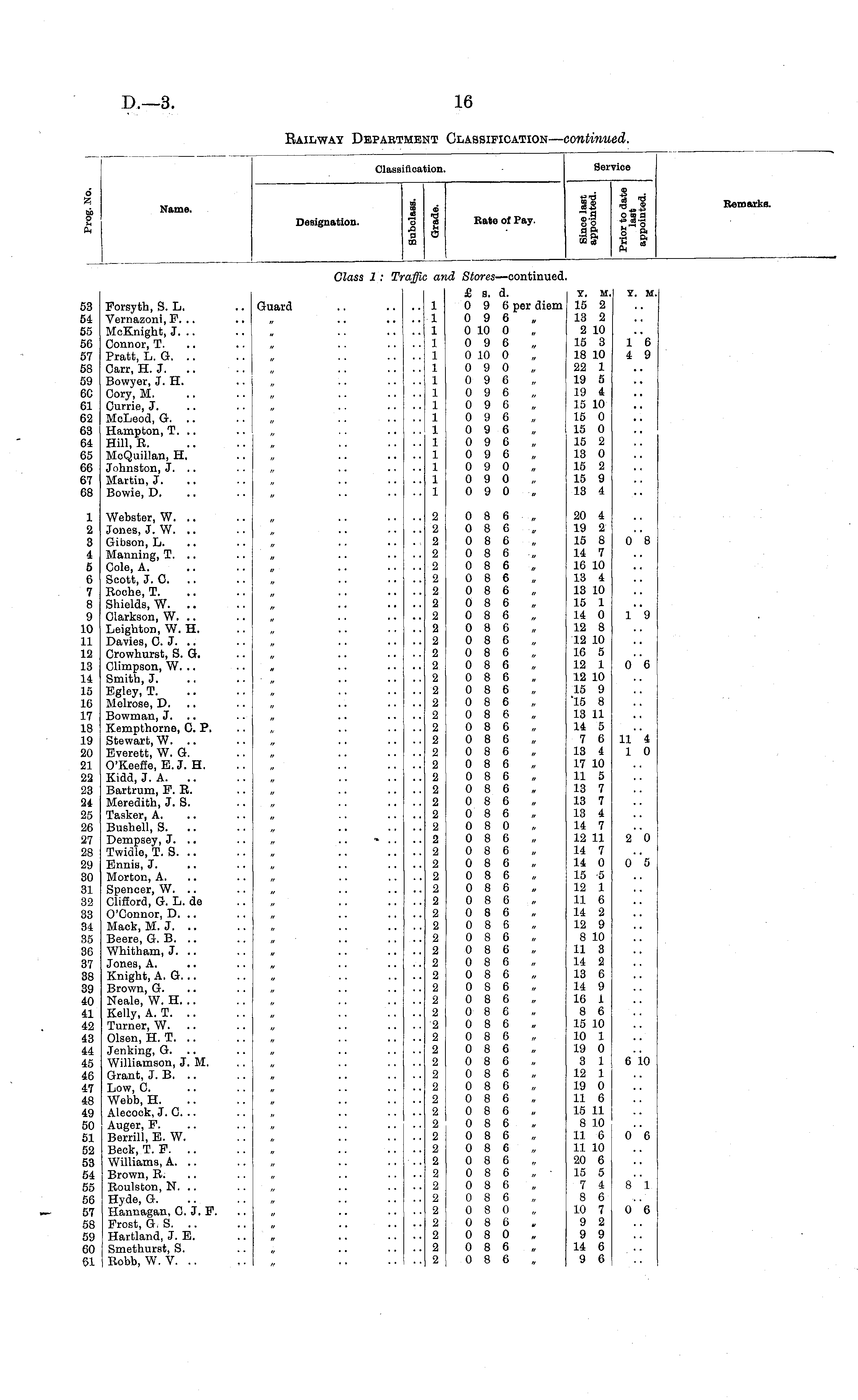 Clasi lifloatio! Service f Name. Designation. 1 02 Bate of Pay. g| *3| q ft g p. Remarks. Class 1 : 1 •affii id Stores —continued, 53 54 55 56 57 58 59 6C 61 62 63 64 65 66 67 68 Forsyth, S. L. Vernazoni, F. .. MeKnight, J. .. Connor, T. Pratt, L. G. Carr, H. J. Bowyer, J. H. Cory, M. Currie, J. McLeod, G. .. Hampton, T. .. Hill, E. McQuillan, H. Johnston, J. .. Martin, J. Bowie, D. Guard 1 1 1 1 1 1 1 1 1 1 1 1 1 1 1 1 £ s. a. 0 9 6 per diem 0 9 6 „ 0 10 0 0 9 6 0 10 0 0 9 0 0 9 6 0 9 6 0 9 6 0 9 6 0 9 6 0 9 6 0 9 6 0 9 0 0 9 0 0 9 0 Y. M. 15 2 13 2 2 10 15 3 18 10 22 1 19 5 19 4 15 10 15 0 15 0 15 2 13 0 15 2 15 9 13 4 Y. M. 1*6 4 9 1 2 3 4 5 6 7 8 9 10 11 12 13 14 15 16 17 18 19 20 21 22 23 24 25 26 27 28 29 30 31 32 33 34 85 30 37 38 39 40 41 42 43 44 45 46 47 48 49 50 51 52 53 54 55 56 57 58 59 60 61 Webster, W. .. Jones, J. W. .. Gibson, L. Manning, T. .. Cole, A. Scott, J. C. .. Koche, T. Shields, W. .. Clarkson, W. .. Leighton, W. H. Davies, O. J. Crowhurst, S. G. Climpson, W. .. Smith, J. Bgley, T. Melrose, D. Bowman, J. Kempthorne, C. P. Stewart, W. .. Everett, W. G. O'Keefie, E. J. H. Kidd, J. A. Bartrum, F. E. Meredith, J. S. Tasker, A. Bushell, S. Dempsey, J. .. Twidle, T. S. Ennis, J. Morton, A. Spencer, W. .. Clifford, G. L. de O'Connor, D. .. Mack, M. J. Beere, G. B. Whitham, J. .. Jones, A. Knight, A. G. .. Brown, G. Neale, W. H. .. Kelly, A. T. Turner, W. .. Olsen, H. T. Jenking, G. Williamson, J. M. Grant, J. B. Low, C. Webb, H. Alecock, J. C. .. Auger, F. Berrill, E. W. Beck, T. F. Williams, A. .. Brown, R. Eoulston, N. .. Hyde, G. Hannagan, C. J. F. Frost, G, S. .. Hartland, J. E. Smethurst, S. Robb, W. V. .. // 2 2 2 2 2 2 2 2 2 2 2 2 2 2 2 2 2 2 2 2 2 2 2 2 2 2 2 2 2 2 2 2 2 2 2 2 2 2 2 2 2 2 2 2 2 2 2 2 2 2 2 2 2 2 2 2 2 2 2 2 2 0 8 6 0 8 6 0 8 6 0 8 6 „ 0 8 6 0 8 6 0 8 6 0 8 6 0 8 6 0 8 6 0 8 6 0 8 6 0 8 6 0 8 6 0 8 6 0 8 6 0 8 6 0 8 6 0 8 6 0 8 6 0 8 6 0 8 6 0 8 6 0 8 6 0 8 6 0 8 0 0 8 6 0 8 6 0 8 6 0 8 6 0 8 6 0 8 6 0 8 6 0 8 6 0 8 6 0 8 6 0 8 6 0 8 6 0 8 6 0 8 6 0 8 6 0 8 6 0 8 6 0 8 6 0 8 6 0 8 6 0 8 6 0 8 6 0 8 6 0 8 6 0 8 6 0 8 6 0 8 6 0 8 6 0 8 6 0 8 6 0 8 0 0 8 6 0 8 0 0 8 6 0 8 6 20 4 19 2 15 8 14 7 16 10 13 4 13 10 15 1 U 0 12 8 12 10 16 5 12 1 12 10 15 9 "15 8 13 11 14 5 7 6 13 4 17 10 11 5 13 7 13 7 13 4 14 7 12 11 14 7 14 0 15 -5 12 1 11 6 14 2 12 9 8 10 11 3 14 2 13 6 14 9 16 1 8 6 15 10 10 1 19 0 3 1 12 1 19 0 11 6 15 11 8 10 11 6 11 10 20 6 15 5 7 4 8 6 10 7 9 2 9 9 14 6 9 6 o"8 l"9 o"6 1 0 20 o"s 6 10 0 6 s"i 0 6