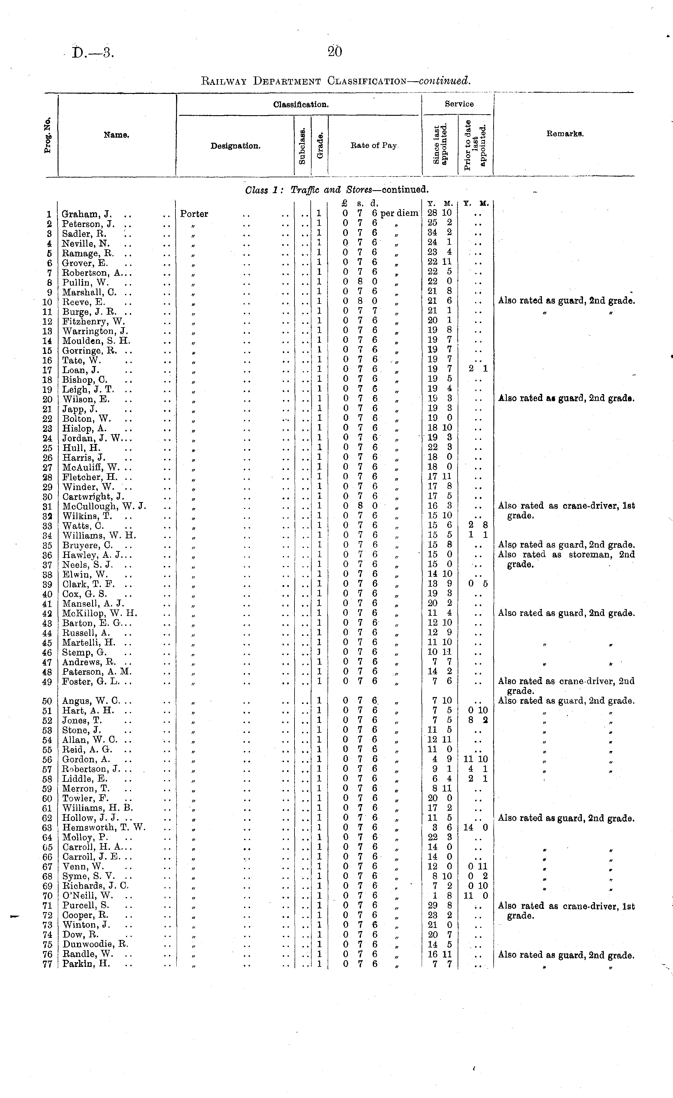 Clasi sifio! lion. Service i I Name. 1 m 6 1 it II 1 d .2 S Kemarke. Designation. Rate of Pay Class 1: Vα md Stores —continue u. 1 2 8 4 6 c> 7 8 9 10 11 12 18 U L6 10 17 18 19 20 21 22 23 24 25 26 27 28 29 30 31 33 33 34 35 36 37 38 39 to 11 12 13 14 15 16 17 18 19 Graham, J. Peterson, J. .. Sadler, R. Neville, N. .. Ramage, R. .. Grover, E. Robertson, A... Pullin, W. Marshall, G. .. Reeve, E. Burge, J. R. .. Fitzhenry, W. Warrington, J. Moulden, S. H. Gorringe, R. .. Tate, W. Loan, J. Bishop, O. Leigh, J. T. Wilson, E. Japp, J. Bolton, W. Hislop, A. Jordan, J. W.. • Hull, H. Harris, J. MoAuliff, W. .. Fletcher, H. .. Winder, W. .. Cartwright, J. MoOullough, W. J. Wiikins, T. .. Watts, G. Williams, W. H. Bruyere, G. Hawley, A. J.. . Neels.'S. J. .. Elwin, W. Clark, T. F. .. Cox, G. S. Mansell, A. J. MoKillop, W. H. Barton, E. G... Russell, A. Martelli, H. .. Stemp, G. Andrews, R. .. Paterson, A. M. Foster, G. L. Porter 1 1 1 1. 1 1 1 1 1 1 1 1 1 1 1 1 1 1 1 1 1 1 1 1 1 1 1 1 1 1 1 1 1 1 1 1 1 1 1 1 1 1 1 1 1 J 1 1 1 & s. d. 0 7 6 per diem 0 7 6 0 7 6 0 7 6 0 7 6 „ 0 7 6 0 7 6 0 8 0 0 7 6 0 8 0 0 7 7 0 7 6 0 7 6 0 7 6 0 7 6 0 7 6 0 7 6 0 7 6 0 7 6 0 7 6 0 7 6 0 7 6 0 7 6 0 7 6 0 7 6 0 7 6 0 7 6 0 7 6 0 7 6 0 7 6 0 8 0 0 7 6 0 7 6 0 7 6 0 7 6 0 7 6,, 0 7 6 0 7 6 0 7 6 0 7 6 0 7 6 0 7 6 0 7 6 0 7 6 0 7 6 0 7 6 0 7 6 0 7 6 0 7 6 Y. M. 28 10 25 2 34 2 24 1 23 4 22 11 22 5 22 0 21 8 21 6 21 1 20 1 19 8 19 7 19 7 19 7 19 7 19 5 19 4 19 3 19 3 19 0 18 10 19 3 22 3 18 0 18 0 17 11 17 8 17 5 16 3 15 10 15 6 15 5 15 8 15 0 15 0 14 10 13 9 19 3 20 2 11 4 12 10 12 9 11 10 10 11 7 7 14 2 7 6 Y. 11. a" i Also rated as guard, 2nd grade. H H Also rated ai guard, 2nd grade. Also rated as crane-driver, 1st grade. 2"8 1 1 Alao rated as gua,rd, 2nd grade. Also rated as storeman, 2nd grade. o"e Also rated as guard, 2nd grade. Also rated as crane-driver, 2nd grade. Also rated as guard, 2nd grade. 50 51 52 13 34 35 3G 37 38 59 50 31 S2 33 34 35 36 37 38 59 70 71 72 73 74 75 70 77 Angus, W. C. .. Hart, A. H. Jones, T. Stone, J. Allan, W. C. Reid, A. G. Gordon, A. Robertson, J. .. Liddle, E. Merron, T. Towler, F. Williams, H. B. Hollow, J. J. Hemsworth, T. W. Molloy, P. Carroll, H. A... Carroll, J. E. .. Venn, W. Syme, S. V. Richards, J. C. O'Neill, W. .. Purcell, S. Cooper, E. Winton, J. Dow, R. Dunwoodie, R. Handle, W. .. Parkin, H. 1 I 1 1 1 1 1 1 1 1 1 1 1 1 1 1 1 1 1 1 1 1 1 1 1 1 1 1 0 7 6 0 7 6 0 7 6 0 7 6 0 7 6 0 7 6 0 7 6 0 7 6 0 7 6 0 7 6 0 7 6 0 7 6 0 7 6 0 7 6 0 7 6 0 7 6 0 7 6 „ 0 7 6 0 7 6 0 7 6 0 7 6 0 7 6 0 7 6 0 7 6 0 7 6 0 7 6 0 7 6 0 7 6 7 10 7 5 7 5 11 5 12 11 11 0 4 9 9 1 6 4 8 11 20 0 17 2 11 5 3 6 22 3 14 0 14 0 12 0 8 10 7 2 1 8 29 8 23 2 21 0 ! 20 7 J 14 5 I 16 11 7 7 0 10 8 2 11 10 4 1 2 1 u"o It /r If H Also rated as guard, 2nd grade. H IV 0 11 0 2 0 10 11 0 » // " K Also rated as crane-driver, 1st grade. Also rated as guard, 2nd grade.
