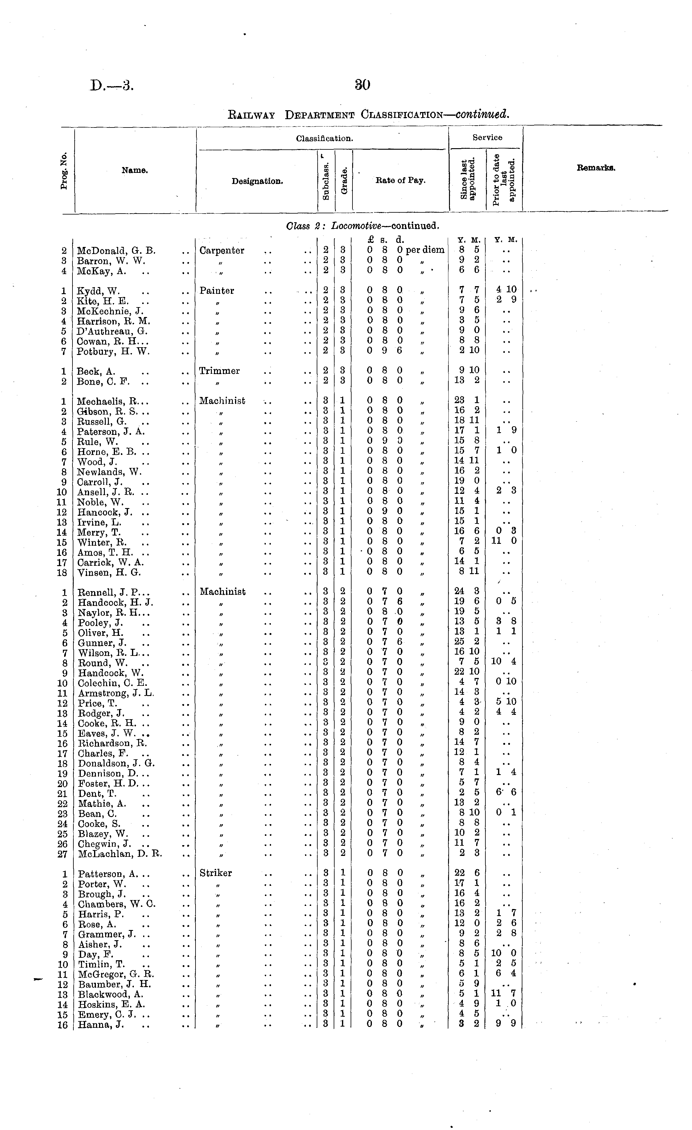 Class: illcation. Service o" S5 C4 Name. Designation. I « •S 5 DO Bate of Pay. 11 ij if *Il aft S a Remarks. Class :0C: motive —continued. 2 3 4 McDonald, G. B. Barren, W. W. McKay, A. Carpenter 2 2 2 8 8 3 £ s. d. 0 8 0 per diem 0 8 0 0 8 0 y. m. 8 5 9 2 6 6 Y. M. 1 2 8 4 6 G 7 Kydd, W. Kite, H. E. .. McKeohnie, J. Harrison, R. M. D'Authreau, G. Cowan, B. H... Potbury, H. W. Painter 2 2 2 2 2 2 2 8 3 3 8 8 3 8 0 8 0 0 8 0 0 8 0 0 8 0 0 8 0 0 8 0 0 9 6 7 7 7 5 9 6 3 5 9 0 8 8 2 10 4 10 2 9 1 2 Beck, A. Bone, C. F. Trimmer 2 2 3 3 0 8 0 0 8 0 9 10 13 2 1 2 S 4 5 G 7 8 9 0 .1 .2 .3 .4 .5 .6 .7 .8 Meehaelis, B... Gibson, B. S. .. Russell, G. Paterson, J. A. Rule, W. Home, E. B. Wood, J. Newlands, W. Carroll, J. Ansell, J. R. Noble, W. Hancock, J. .. Irvine, L. Merry, T. Winter, R. Amos, T. H. Carrick, W. A. Vinsen, H. G. Machinist 3 3 3 3 8 3 3 8 3 3 3 3 3 3 3 3 8 3 1 1 1 1 1 1 1 1 1 1 1 1 1 1 1 1 1 1 0 8 0 0 8 0 0 8 0 0 8 0 0 9 0 0 8 0 0 8 0 0 8 0 0 8 0 0 8 0 0 8 0 0 9 0 0 8 0 0 8 0 0 8 0 ■ 0 8 0 0 8 0 0 8 0 23 1 16 2 18 11 17 1 15 8 15 7 14 11 16 2 19 0 12 4 11 4 15 1 15 1 16 6 7 2 6 5 14 1 8 11 1*9 1 0 2**3 0**3 11 0 1 2 3 4 5 C 7 8 9 10 11 12 18 14 IS 16 17 IS 19 20 21 22 23 24 25 26 27 Eennell, J. P... Handeock, H. J. Nay lor, R. H... Pooley, J. Oliver, H. Gunner, J. Wilson, R. L... Bound, W. Handeock, W. Colechin, C. E. Armstrong, J. L. Price, T. Rodger, J. Cooke, R. H. Eaves, J. W. .. Richardson, R. Charles, P. .. Donaldson, J. G. Dennison, D. .. Poster, H. D. .. Dent, T. Mathie, A. Bean, C. Cooke, S. Blazey, W. Chegwin, J. McLachlan, D. B. Machinist 3 3 3 3 3 3 8 8 3 8 3 8 3 8 8 8 8 8 3 3 8 3 3 3 3 8 2 2 2 2 2 2 2 2 2 2 2 2 2 2 2 2 2 2 2 2 2 2 2 2 2 2 2 0 7 0 0 7 6 0 8 0 0 7 0 0 7 0 0 7 6 0 7 0 0 7 0 0 7 0 0 7 0 0 7 0 0 7 0 0 7 0 0 7 0 0 7 0 0 7 0 0 7 0 0 7 0 0 7 0 0 7 0 0 7 0 0 7 0 0 7 0 0 7 0 0 7 0 0 7 0 0 7 0 24 3 19 6 19 5 13 5 13 1 25 2 16 10 7 5 22 10 4 7 14 3 4 3 4 2 9 0 8 2 14 7 12 1 8 4 7 1 5 7 2 5 13 2 8 10 8 8 10 2 11 7 2 3 o"s 3**8 1 1 10**4 o'io 5*io 4 4 1*4 6-" 6 0 1 1 2 3 4 5 6 7 8 9 10 11 12 13 U 15 16 Patterson, A. .. Porter, W. Brough, J. Chambers, W. C. Harris, P. Bose, A. Grammer, J. .. Aisher, J. Day, P. Timlin, T. McGregor, G. R. Baumber, J. H. Blackwood, A. Hoskins, E. A. Emery, C. J. .. Hanna, J. Striker 3 3 3 3 3 3 8 3 8 8 3 8 3 8 3 8 1 1 1 1 1 1 1 1 1 1 1 1 1 1 1 1 0 8 0 0 8 0 0 8 0 0 8 0 0 8 0 0 8 0 0 8 0 0 8 0,, 0 8 0 0 8 0 0 8 0 0 8 0 0 8 0 0 8 0 0 8 0 0 8 0 22 6 17 1 16 4 16 2 13 2 12 0 9 2 8 6 8 5 5 1 6 1 5 9 5 1 4 9 4 5 3 2 1 7 2 6 2 8 10 0 2 5 6 4 11**7 1 0 • 9 "9