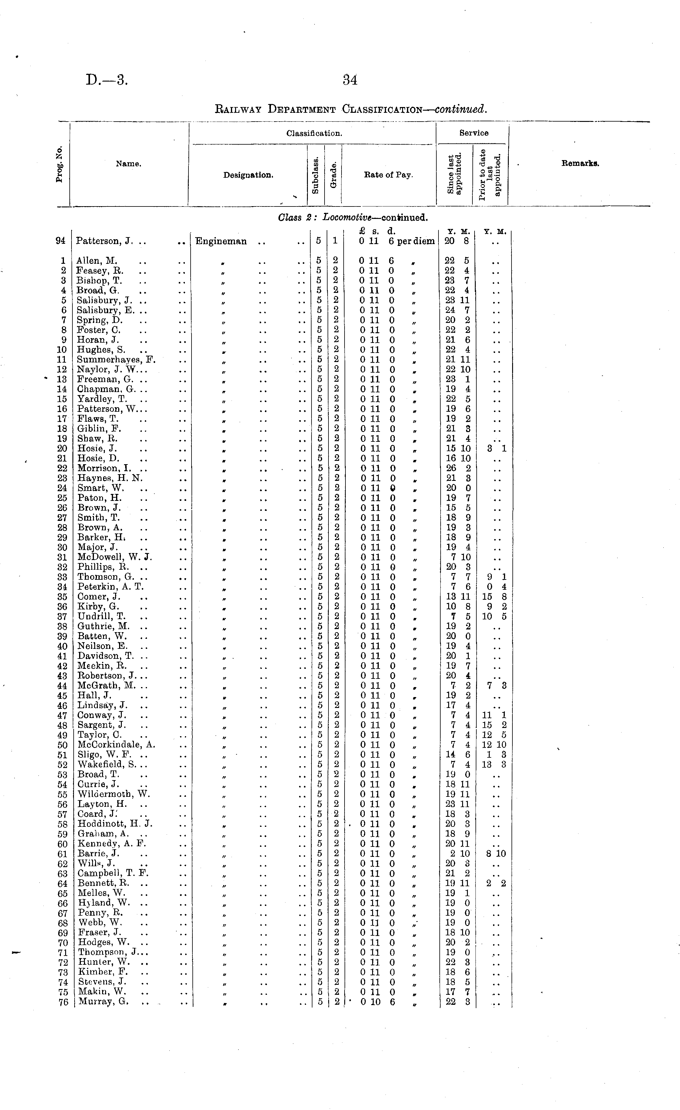 Classification. Service o I Name. Designation. I ' I CD 3 ,§ ■§ & Bate of Pay. II ii Bern arks. Class I <oco\ totive —continued. 94 Patterson, J. .. Engineman 5 1 £ s. d. 0 11 6 per diem Y. M. 20 8 T. M. 1 2 3 4 5 6 7 8 9 10 11 12 18 14 15 1G 17 18 19 20 21 22 23 24 25 2G 27 28 29 ao 81 32 88 31 35 36 37 38 39 40 41 42 43 44 45 4G 47 48 49 50 51 52 53 54 55 56 57 58 59 60 01 62 63 64 65 66 67 68 69 70 71 72 73 74 75 76 Allen, M. Feasey, B. Bishop, T. Broad, G. Salisbury, J. .. Salisbury, E. .. Spring, t>. Poster, C. Horan, J. Hughes, S. .. Summerhayes, F. Naylor, J. W... Freeman, G. .. Chapman, G. .. Yardley, T. .. Patterson, W... Flaws, T. Giblin, F. Shaw, E. Hosie, J. Hosie, D. Morrison, I. .. Haynes, H. N. Smart, W. Paton, H. Brown, J. Smith, T. Brown, A. Barker, Hi Major, J. McDowell, W. J. Phillips, E. .. Thomson, G. .. Peterkin, A. T. Comer, J. Kirby, G. Undrill, T. .. Guthrie, M. .. Batten, W. .. Neilson, E. Davidson, T. .. Meekin, E. Robertson, J. .. McGrath, M. .. Hall, J. Lindsay, J. Conway, J. Sargent, J. Taylor, C. McCorkindale, A. Sligo, W. F. .. Wakefield, S. .. Broad, T. Currie, J. Wildermoth, W. Lay ton, H. Coard, J.' Hoddinott, H. J. Graliam, A. Kennedy, A. F. Barrie, 3. Wills, J. Campbell, T. F. Bennett, E. Melles, W. .. Hyland, W. .. Penny, E. Webb, W. Fraser, J. Hodges, W. .. Thompson, J.. . Hunter, W. .. Kimber, F. .. Stevens, J. Makin, W. Murray, G. .... n if u m H 0 H 5 5 5 5 5 5 5 5 5 5 5 8 5 5 5 5 5 5 5 5 5 5 5 5 5 5 5 5 5 5 5 5 5 5 5 5 5 5 5 5 5 5 5 5 5 5 5 5 5 S 5 5 5 5 5 5 5 5 5 5 5 5 5 5 5 5 5 5 5 5 5 5 5 5 5 5 2 2 2 2 2 2 2 2 2 2 2 2 2 2 2 2 2 2 2 2 2 2 2 2 2 2 2 2 2 2 2 2 2 2 2 2 2 2 2 2 2 2 2 2 2 2 2 2 2 2 2 2 2 2 2 2 2 2 2 2 2 2 2 2 2 2 2 2 2 2 2 2 2 2 2 2 0 11 6 0 11 0 0 11 0 0 11 0 0 11 0 0 11 0 0 11 0 0 11 0 0 11 0 0 11 0 0 11 0 0 11 0 0 11 0 0 11 0 0 11 0 0 11 0 0 11 0 0 11 0 0 11 0 0 11 0 0 11 0 0 11 0 0 11 0 0 11 0 0 11 0 0 11 0 0 11 0 0 11 0 0 11 0 0 11 0 0 11 0 0 11 0 0 11 0 0 11 0 0 11 0 0 11 0 0 11 0 0 11 0 0 11 0 0 11 0 0 11 0 0 11 0 0 11 0 0 11 0 0 11 0 0 11 0 0 11 0 0 11 0 0 11 0 0 11 0 0 11 0 0 11 0 0 11 0 0 11 0 0 11 0 0 11 0 0 11 0 0 11 0 . 0 11 0 0 11 0 0 11 0 0 11 0 0 11 0 0 11 0 0 11 0 0 11 0 0 11 0 0 11 0 0 11 0 , 0 11 0 0 11 0 0 11 0 0 11 0 0 11 0 0 11 0 , • 0 10 6 22 5 22 4 23 7 22 4 23 11 24 7 20 2 22 2 21 6 22 4 21 11 22 10 23 1 19 4 22 5 19 6 19 2 21 3 21 4 15 10 16 10 26 2 21 3 20 0 19 7 15 5 18 9 19 3 18 9 19 4 7 10 20 3 7 7 7 6 13 11 10 8 7 5 19 2 20 0 19 4 20 1 19 7 20 4 7 2 19 2 17 4 7 4 7 4 7 4 7 4 14 6 7 4 19 0 18 11 19 11 23 11 18 3 20 3 18 9 20 11 2 10 20 3 21 2 19 11 19 1 19 0 19 0 19 0 18 10 20 2 19 0 22 3 18 6 18 5 17 7 22 3 3"l 9 1 0 4 15 8 9 2 10 5 IV 7 - 3 11 1 15 2 12 5 12 10 1 3 13 3 8 10 2 2 *