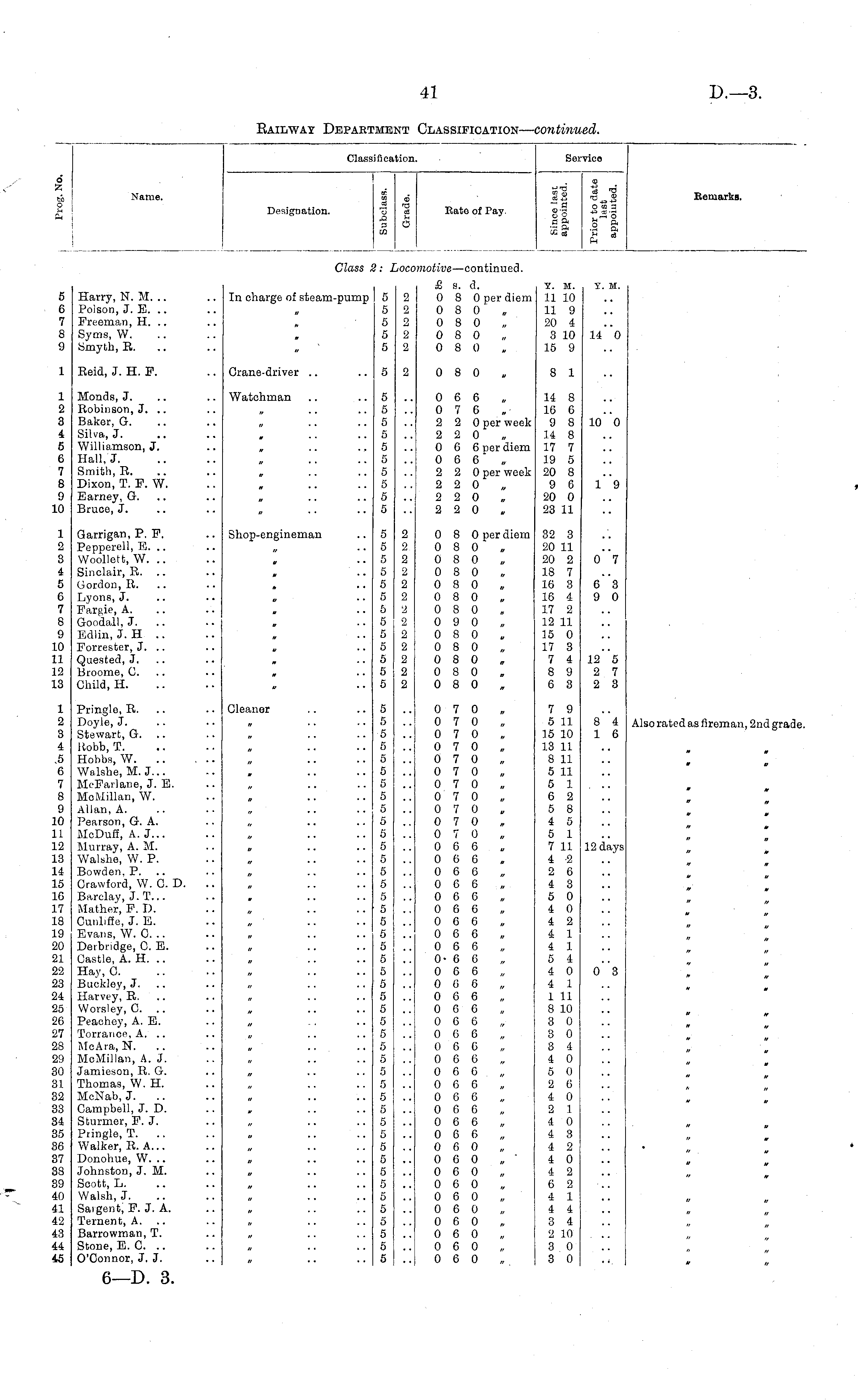 6 K to o j Name. Classi ficatioi 2 <c .3 "3 I 5 in o-9 3 5.3 Service Remarks. Designation. Rato of Pay. Class ': Loco, native —continued. r> 6 7 S 9 Harry, N. M. .. Poison, J. E. Freeman, H. .. Syms, W. Smyth, R. In charge of steam-pump r> 5 5 5 5 2 2 2 2 2 £ a. d. 0 8 0 per diem 0 8 0 „ 0 8 0 0 8 0 0 8 0 Y. M. 11 10 11 9 20 4 3 10 15 9 T, M. 14 0 1 Reid, J. H. F. Orane-driver 5 2 0 8 0 8 1 1 2 3 4 5 0 7 8 9 10 Monds, J. Robinson, J. .. Baker, G. Silva, J. Williamson, J. Hall, J. Smith, R. Dixon, T. F. W. Earney, G. Bruce, J. Watchman K . . • . 5 5 5 5 6 5 5 5 6 5 0 6 6 0 7 6 2 2 0 per week 2 2 0 0 6 6 per diem 0 6 6 2 2 0 per week 2 2 0 2 2 0 2 2 0 14 8 16 6 9 8 14 8 17 7 19 5 20 8 9 6 20 0 23 11 io"o It ■ • • • 1 9 1 2 3 4. 5 6 7 8 9 10 11 12 13 Garrigan, P. F. Pepperell, E. .. Woollett, W. .. Sinclair, R. Gordon, R. Lyons, J. Pargie, A. Goodall, J. Edlin, J. H .. Forrester, J. .. Quested, J. Bioome, C. Child, H. Shop-engineman 5 5 5 5 5 5 5 5 5 5 5 5 5 2 2 2 2 2 2 2 2 2 2 2 2 0 8 0 per diem 0 8 0 0 8 0 0 8 0 0 8 0 0 8 0 0 8 0 0 9 0 0 8 0 0 8 0 0 8 0 0 8 0 0 8 0 32 3 20 11 20 2 18 7 16 3 16 4 17 2 12 11 15 0 17 3 7 4 8 9 6 3 0 7 6"3 9 0 H • • 12 5 2 7 2 3 1 2 3 4 .6 0 7 8 9 10 11 12 IS U 15 16 17 18 19 20 21 22 23 24 25 26 27 28 2!) 30 31 82 83 31 35 36 37 38 39 40 41 42 43 44 Pringle, R. Doyle, J. Stewart, G. .. liobb, T. Hohbs, W. Walshe, M.J... McFailaue, J. E. McMillan, W. Allan, A. Pearson, G. A. McDufi, A. J... Murray, A. M. Walshe, W. P. Bowden, P. Crawford, W. C. D. Barclay, J. T... Mather, F. D. Cunliffe, J. E. Evans, W. C. .. Detbndge, 0. E. Castle, A. H. .. Hay, C. Buckley, J. Harvey, R. VVorsley, C. .. Peachey, A. E. Torrancfi, A. .. McAra, N. McMillan, A. J. Jamieson, R. G. Thomas, W. H. MoNab, J. .. Campbell, J. D. Scunner, F. J. Piingle, T. .. Walker, R. A... Donohue, W. .. Johnston, J. M. Scott, L. Walsh, J. Saigent, F. J. A. Ternent, A. Barrowman, T. Stone, E. C. .. O'Connor, J. J. 6—D. 3. Gleaner 6 5 5 5 S f> 5 5 5 5 5 5 5 ') 5 5 S 6 5 6 5 5 5 5 5 5 5 3 5 5 5 5 5 5 5 5 5 5 5 5 5 5 5 5 5 0 7 0 0 7 0 0 7 0 0 7 0 0 7 0 0 7 0 0 7 0 0 7 0 0 7 0 0 7 0 0 7 0 0 6 6 0 6 6 0 6 6 0 6 6 0 6 6 0 6 6 0 6 6 0 6 6 0 6 6 0-6 6 0 6 6 0 6 6 0 6 6 0 6 6 0 6 6 0 6 6 0 6 6 0 6 6 0 6 6 0 6 6 0 6 6 0 6 6 0 6 6 0 6 6 0 6 0 0 6 0 0 6 0 0 6 0 0 6 0 0 6 0 0 6 0 0 6 0 0 6 0 0 6 0 7 9 5 11 15 10 13 11 8 11 5 11 5 1 6 2 5 8 4 5 5 1 7 11 4 2 2 6 4 3 5 0 4 0 4 2 4 1 4 1 5 4 4 0 4 1 1 11 8 10 3 0 3 0 3 4 4 0 5 0 2 6 4 0 2 1 4 0 4 3 4 2 4 0 4 2 6 2 4 1 4 4 3 4 2 10 3 0 3 0 8 4 1 6 12 days o"3 Also rated as fireman, 2nd grade. * if » ti tt H " ft <t It ft V 1 If " // It If u It If If