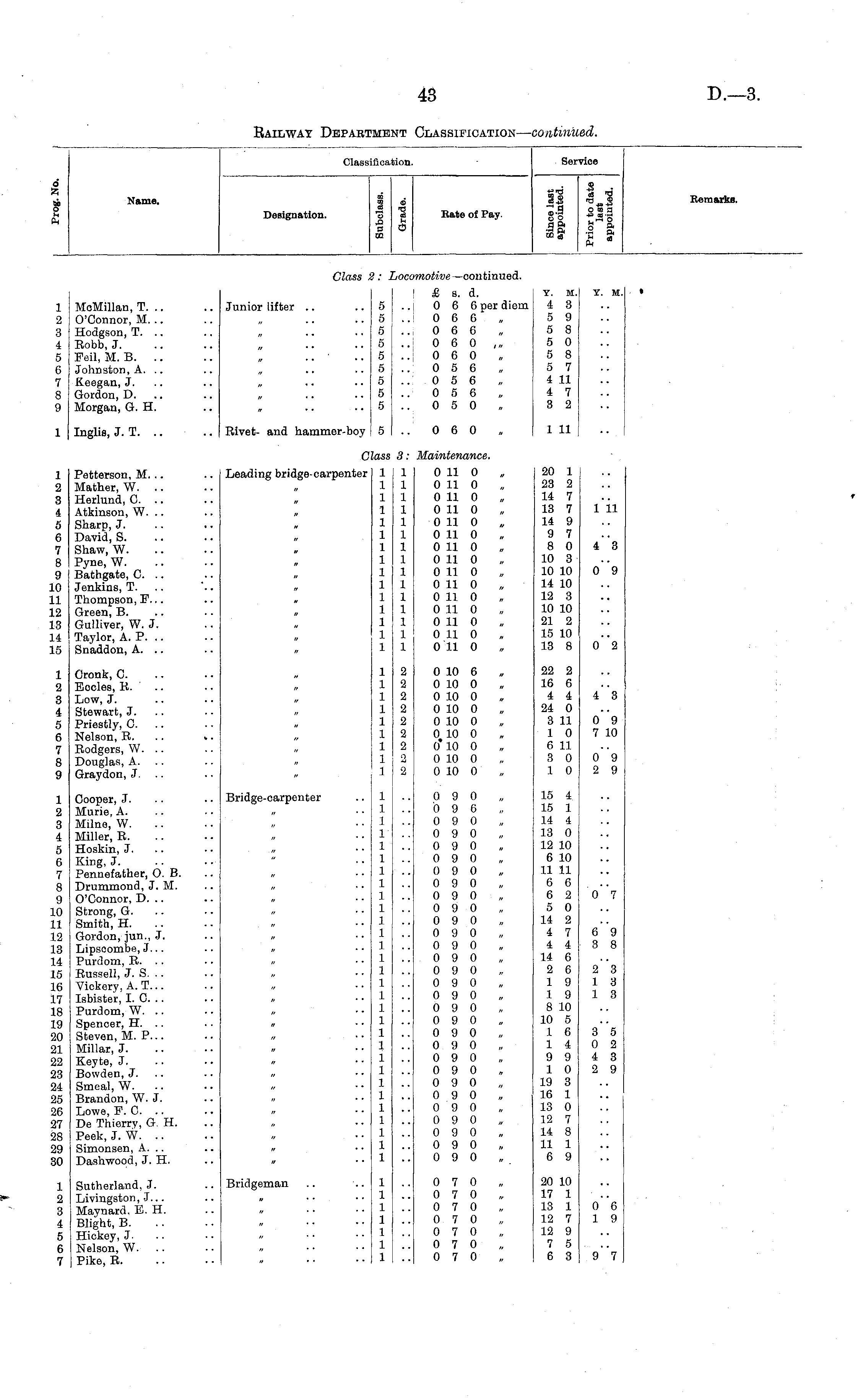 I:'.:;: ca1 jki! Service 6 g Name. ! in 1 n 1 % « is Remarks. Designation. Bate ol Pay. Class I ',: Locomotive —continued. 1 2 3 4 5 e 7 8 9 McMillan, T. .. O'Connor, M. .. Hodgson, T. .. Robb, J. Feil, M. B. .. Johnston, A. .. Keegan, J. Gordon, D. Morgan, G. H. Junior lifter ! & s. d. 5 .. 0 6 6 per diem 5 .. 0 6 6 5 ... 0 6 6 5 .. 0 6 0 ,„ 5 ..! 0 6 0 5 .. 0 5 6 5 .. 0 5 6 5 .. 0 5 6 5 .. 0 5 0 5 5 5 5 5 5 5 5 5 Y. M. 4 3 5 9 5 8 5 0 5 8 5 7 4 11 4 7 3 2 Y. M. • Inglis, J. T. Eivet- and hammer-boy I 5 .. 0 6 0 1 11 a lass 3: Maintenance. 20 1 23 2 14 7 13 7 14 9 9 7 8 0 10 3 10 10 14 10 12 3 10 10 21 2 15 10 13 8 1 2 3 i 5 6 7 8 9 1.0 11 12 13 14 15 Petterson, M. .. Mather, W. .. Herlund, G. Atkinson, W. .. Sharp, J. David, S. Shaw, W. Pyne, W. Bathgate, C. .. Jenkins, T. Thompson, F... Green, B. Gulliver, W. J. Taylor, A. P. Snaddon, A. .. Leading bridge-carpenter w 11 0 11 0 11 0 11 0 11 0 11 0 11 0 11 0 11 0 11 0 11 0 11 0 11 0 11 0 11 0 11 0 11 0 11 0 11 0 11 0 11 0 11 0 11 0 11 0 11 0 11 0 11 0 11 0 11 0 11 0 l'ii 4 3 0 9 0 2 1 2 3 4 5 6 7 8 9 Oronk, C. Bocles, K. Low, J. Stewart, J. Priestly, C. Nelson, R. Rodgers, W. .. Douglas, A. Graydon, J. 12 0 10 6 12 0 10 0 12 0 10 0 12 0 10 0 12 0 10 0 12 0 10 0 12 0*10 0 12 0 10 0 12 0 10 0 „ 22 2 16 6 4 4 24 0 3 11 1 0 6 11 3 0 1 0 4 3 0 - 9 7 10 0 9 2 9 1 2 3 4 5 6 7 8 9 10 11 12 13 14 15 16 17 18 19 20 21 22 23 24 25 26 27 28 29 30 Cooper, J. Murie, A. Milne, W. Miller, R. Hoskin, J. King, J. Pennefather, O. B. Drummond, J. M. O'Connor, D. .. Strong, G. Smith, H. Gordon, jun., J. Lipscomba, J. .. Purdom, R. .. Russell, J. S. .. Vickery, A.T... Isbister, I. C. .. Purdom, W. .. Spencer, H. .. Steven, M. P... Millar, J. Keyte, J. Bowden, J. Smeal, W. Brandon, W. J. Lowe, F. C. De Thierry, G. H. Peek, J. W. Simonsen, A. .. Dashwood, J. H. Bridge-carpenter 1 .. 0 9 0 1 .. 0 9 6 1 .. 0 9 0 1 .. 0 9 0 1 .. 0 9 0 1 .. 0 9 0 1 .. 0 9 0 1 .. 0 9 0 1 .. 0 9 0 1 .. 0 9 0 1 .. 0 9 0 1 .. 0 9 0 1 .. 0 9 0 1 .. 0 9 0 1 .. 0 9 0 1 .. 0 9 0 1 .. 0 9 0 1 .. 0 9 0 1 .. 0 9 0 1 .. 0 9 0 1 .. 0 9 0 1 .. 0 9 0 1 .. 0 9 0 1 .. 0 9 0 1 .. 0 9 0 1 .. 0 9 0 1 .. 0 9 0 1 .. 0 9 0 1 .. 0 9 0 1 .. 0 9 0 15 4 15 1 14 4 13 0 12 10 6 10 11 11 6 6 6 2 5 0 14 2 4 7 4 4 14 6 2 6 1 9 1 9 8 10 10 5 1 6 1 4 9 9 1 0 19 3 16 1 13 0 12 7 14 8 11 1 6 9 o"? 6 9 3 8 2 3 1 3 1 3 3 5 0 2 4 3 2 9 1 2 3 4 5 6 7 Sutherland, J. Livingston, J.. . Maynard. E. H. Blight, B. Hickey, J. Nelson, W. .. Pike, R. Bridgeman 1 .. 0 7 0 1 .. 0 7 0 1 .. 0 7 0 1 .. 0 7 0 1 .. 0 7 0 1 .. 0 7 0 1 .. 0 7 0 20 10 17 1 13 1 12 7 12 9 7 5 6 3 o"6 1 9 9 7