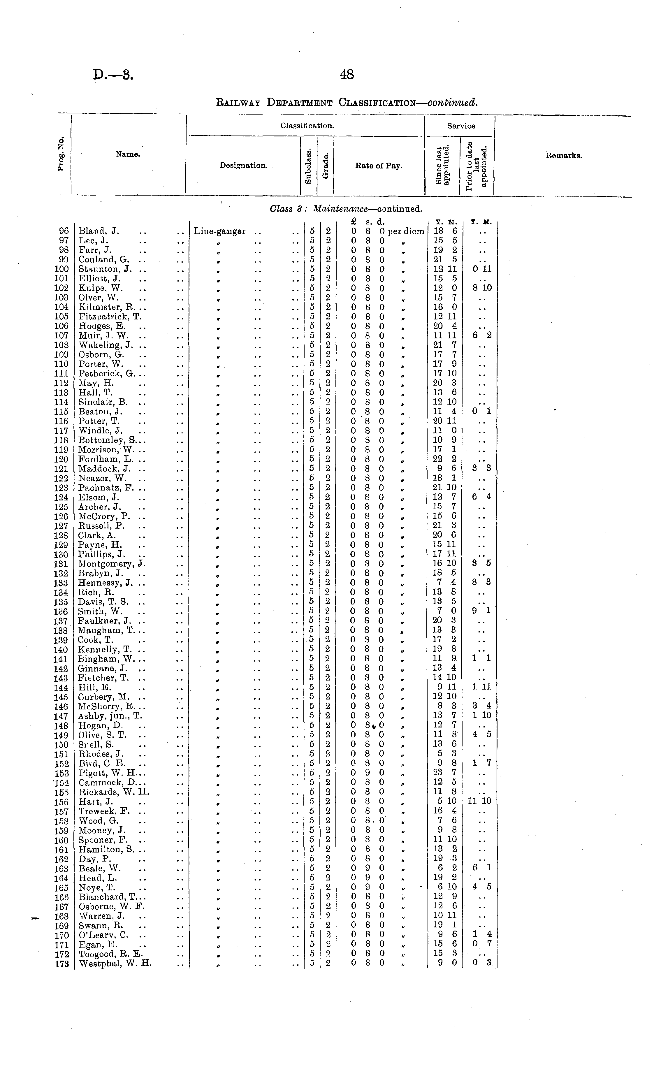 d s Name. Classj iflcation. 6 1 Bate of Pay. ll i I Service Designation. DO Remarki Class i fain, ienance —continued. 96 97 98 99 100 101 102 103 104 105 106 107 108 109 110 111 112 113 114 115 116 117 118 119 120 121 122 123 124 125 120 127 128 129 130 131 132 133 134 135 186 137 138 139 140 141 142 143 144 145 146 147 148 149 150 151 152 153 154 155 156 157 158 159 160 161 162 163 164 165 166 167 168 169 170 171 172 173 Bland, J. Lee, J. Parr, J. Conland,G. .. Staunton, J. .. Elliott, J. Knipe, W. Olver, W. Kilmister, R. .. Pitzpatrick, T. Hodges, B. Muir, J. W. .. Wakeling, J. .. Osborn, G. Porter, W. Petheriok, G. .. May, H. Hall,T. Sinclair, B. Beaton, J. Potter, T. Windle, J. Bottomley, S... Morrison, W. .. Pordham, L. .. Maddock, J. .. Neazor, W. Pachnatz, F. .. Elsom, J. Archer, J. McCrory, P. .. Russell, P. .. Clark,A. Payne, H. Phillips, J. .. Montgomery, J. Brabyn, J. Hennessy, J. .. itich.R. Davis, T. S. Smith, W. .. Faulkner, J. .. Maugham, T. .. Cook, T. Kennelly, T. .. Bingham, W. .. Ginnane, J. Fletcher, T. .. Hill.E. Ourbery, M. McSherry, E. .. Ashby, jun., T. Hogan, D. Olive, S. T. .. Snell, S. Rhodes, J. Bird, C. E. .. Pigott, W. H... Cammock, D... Rickards, W. H. Hart, J. Treweek, F. .. Wood, G. Mooney, J. Spooner, F. .. Hamilton, S. .. Day, P. Beale, W. Head, L. Noye, T. Blanohard.T... Osborne, W. F. Warren, J. Swann, R. O'Leary, 0. .. Egan, E. Toogood, R. E. Westphal, W. H. Line-ganger .. if • • IT ■> ■ « » • • r • ' r • • » • • 5 5 5 5 5 5 5 5 5 5 5 5 5 5 5 5 5 5 5 5 r> 5 5 5 5 5 5 5 5 5 5 5 5 5 5 5 5 5 5 5 5 5 5 5 5 5 5 5 5 5 5 5 5 5 5 5 5 5 5 5 5 5 5 5 5 5 5 5 5 5 5 5 5 5 5 5 5 5 2 2 2 2 2 2 2 2 2 2 2 2 2 2 2 2 2 2 2 2 2 2 2 2 2 2 2 2 2 2 2 2 2 2 2 2 2 2 2 2 2 2 2 2 2 2 2 2 2 2 2 2 2 2 2 2 2 2 2 2 2 2 2 2 2 2 2 2 2 2 2 2 2 2 2 2 2 2 £ s. d. 0 8 0 per diem 0 8 0 0 8 0 0 8 0 0 8 0 0 8 0 0 8 0 0 8 0 0 8 0 0 8 0 0 8 0 0 8 0 0 8 0 0 8 0 0 8 0 0 8 0 0 8 0 0 8 0 0 8 0 0 8 0 0 8 0 0 8 0 0 8 0 0 8 0 0 8 0 0 8 0 0 8 0 0 8 0 0 8 0 0 8 0 0 8 0 0 8 0 0 8 0 0 8 0 0 8 0 0 8 0 0 8 0 0 8 0 0 8 0 0 8 0 0 8 0 0 8 0 0 8 0 0 8 0 0 8 0 0 8 0 0 8 0 0 8 0 0 8 0 0 8 0 0 8 0 0 8 0 0 8*0 . 0 8 0 0 8 0 0 8 0 0 8 0 0 9 0 0 8 0 0 8 0 0 8 0 0 8 0 0 8 0 0 8 0 0 8 0 0 8 0 0 8 0 0 9 0 0 9 0 0 9 0 0 8 0 0 8 0 0 8 0 0 8 0 0 8 0 0 8 0 0 8 0 0 8 0 Y. M. 18 6 15 5 19 2 21 5 12 11 15 5 12 0 15 7 16 0 12 11 20 4 11 11 21 7 17 7 17 9 17 10 20 3 13 6 12 10 11 4 20 11 11 0 10 9 17 1 22 2 9 6 18 1 21 10 12 7 15 7 15 6 21 3 20 6 15 11 17 11 16 10 18 S 7 4 13 8 13 5 7 0 20 3 13 3 17 2 19 8 11 9. 13 4 14 10 9 11 12 10 8 3 13 7 12 7 11 813 6 5 3 9 8 23 7 12 5 11 8 5 10 16 4 7 6 9 8 11 10 13 2 19 3 6 2 19 2 6 10 12 9 12 6 10 11 19 1 9 6 15 6 15 3 9 0 y. m. oil 8 10 62 o"i 3"3 e"'4 S 5 8"3 9 1 « ■ ■ » • * • • ■ l"l a • • # l'il 3 4 1 10 4 5 l"7 » ■ ■ 11 10 a> • ■ g"i » w • • i"5 1 4 0 7 03 n • •