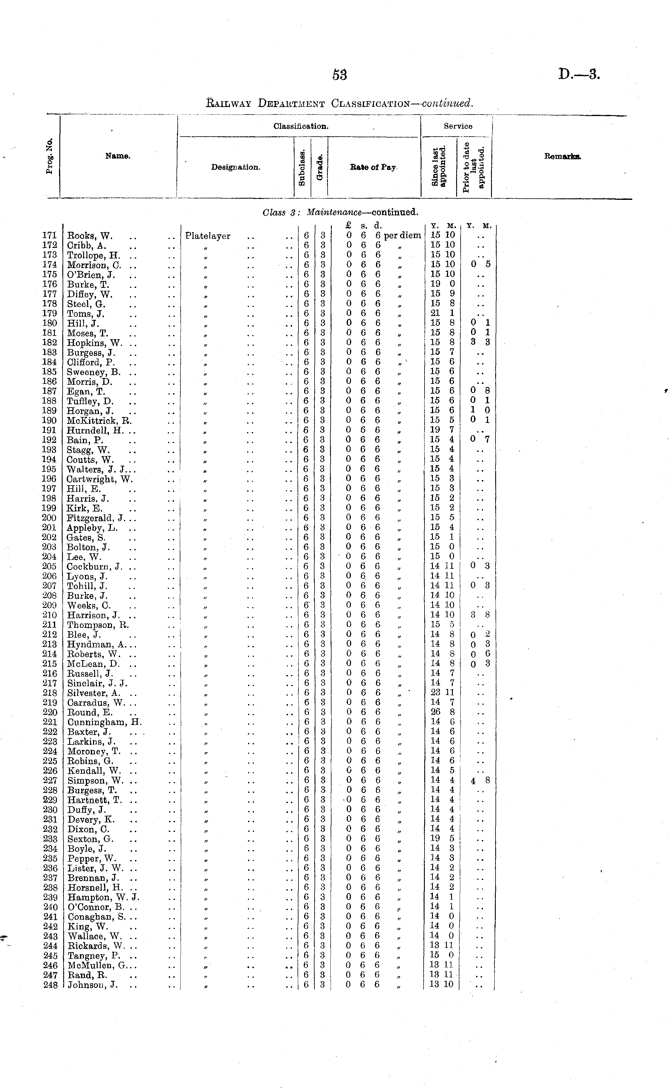 Classic cation. Service Name. Designation. Bate of Pay II l| Remarks. Class 3 \i< ;i)i,i lenance— continued. 171 172 173 174 175 176 177 178 179 180 181 182 183 184 185 186 187 188 189 190 191 192 193 194 195 196 197 198 199 200 201 202 203 204 205 206 207 208 209 210 211 212 213 214 215 216 217 218 219 220 221 222 223 224 225 226 227 228 229 230 231 232 233 234 235 236 237 238 239 240 241 242 243 244 245 246 247 248 Books, W. Cribb, A. Trollope, H. .. Morrison, 0. .. O'Brien, J. .. Burke, T. Diffey, W. Steel, G. Toms, J. Hill, J. Moses, T. Hopkins, W. .. Burgess, J. Clifford, P. .. Sweeney, B. .. Morris, D. Egan, T. Tuffley, D. Horgan, J. McKittrick, R. Hurndell, H. .. Bain, P. Stagg, W. Coutts, W. Walters, J. J... Oartwright, W. Hill, E. Harris, J. Kirk, E. Fitzgerald, J. .. Appleby, L. .. Gates, S. Bolton, J. Lee, W. Coekburri, J. .. Lyons, 3. Tohill, J. Burke, J. Weeks, C. Harrison, J. .. Thompson, R. Blee, J. Hyndman, A. .. Roberts, W. .. McLean, D. .. Russell, J. Sinclair, J. J. Silvester, A. .. Carradus, W. .. Round, E. Cunningham, H. Baxter, J. ... Larkins, J. Moroney, T. .. Robins, G. Kendall, W. .. Simpson, W. .. Burgess, T. Hartnett, T. .. Dufiy, J. Devery, K. Dixon, G. Sexton, G. Boyle, J. Pepper, W. Lister, J. W. .. Brennan, J. Horsnell, H. .. Hampton, W. J. O'Connor, B. .. Conaghan, S. .. King, W. Wallace, W. .. Rickards, W. .. Tangney, P. .. McMullen, G... Rand, R. Johnson, 3. Platelayer 6 6 G 6 6 6 G 6 6 6 6 6 G 6 6 (i 6 6 6 6 6 6 6 C 6 6 6 6 6 6 6 6 6 6 6 6 6 6 6' 6 6 6 6 6 6 6 6 6 6 6 6 6 6 6 6 6 6 6 (i 6 6 6 6 6 6 6 6 6 6 6 6 6 6 6 6 6 6 6 3 3 8 3 3 8 8 3 3 3 3 8 3 3 3 3 3 3 3 3 3 3 8 3 3 3 3 3 3 3 3 3 3 3 3 3 3 3 3 3 3 8 3 3 3 3 3 3 3 3 3 3 3 3 3 3 3 3 3 3 3 8 3 3 3 3 8 3 3 3 3 3 3 3 3 3 3 3 £ s. A. 0 6 6 per diem 0 6 6 0 6 6 0 6 6 0 6 6 0 6 6 0 6 6 0 6 6 0 6 6 0 6 6 0 6 6 0 6 6 0 6 6 0 6 6 0 6 6 0 6 6 0 6 6 0 6 6 0 6 6 „ 0 6 6 0 6 6 0 6 6 0 6 6 0 6 6 0 6 6 0 6 6 0 6 6 0 6 6 0 6 6 0 6 6 0 6 6 0 6 6 0 6 6 0 6 6 0 6 6 0 6 6 0 6 6 0 6 6 0 6 6 0 6 6 0 6 6 0 6 6 0 6 6 0 6 6 0 6 6 0 6 6 0 6 6 0 6 6 0 6 6 0 6 6 0 6 6 0 6 6 0 6 6 0 6 6 0 6 6 0 6 6 0 6 6 0 6 6 0 6 6 0 6 6 „ 0 6 6 0 6 6 0 6 6 0 6 6 0 6 6 0 6 6 0 6 6 0 6 6 0 6 6 0 6 6 0 6 6 0 6 6 0 6 6 0 6 6 0 6 6 0 6 6 0 6 6 0 6 6 Y. M. 15 10 15 10 15 10 15 10 15 10 19 0 15 9 15 8 21 1 15 8 15 8 15 8 15 7 15 6 15 6 15 6 15 6 15 6 15 6 15 5 19 7 15 4 15 4 15 4 15 4 15 3 15 3 15 2 15 2 15 5 15 4 15 1 15 0 15 0 14 11 14 11 14 11 14 10 14 10 14 10 15 5 14 8 14 8 14 8 14 8 14 7 14 7 23 11 14 7 26 8 14 6 14 6 14 6 14 6 14 6 14 5 14 4 14 i 14 4 14 4 14 4 14 4 19 5 14 3 14 3 14 2 14 2 14 2 14 1 14 1 14 0 14 0 14 0 13 11 15 O 13 11 18 U 13 10 Y. M. o"5 0 1 0 1 3 3 0 8 0 1 1 0 0 1 0 1 0"3 o"3 3 8 0 2 0 3 0 6 0 3 4 8