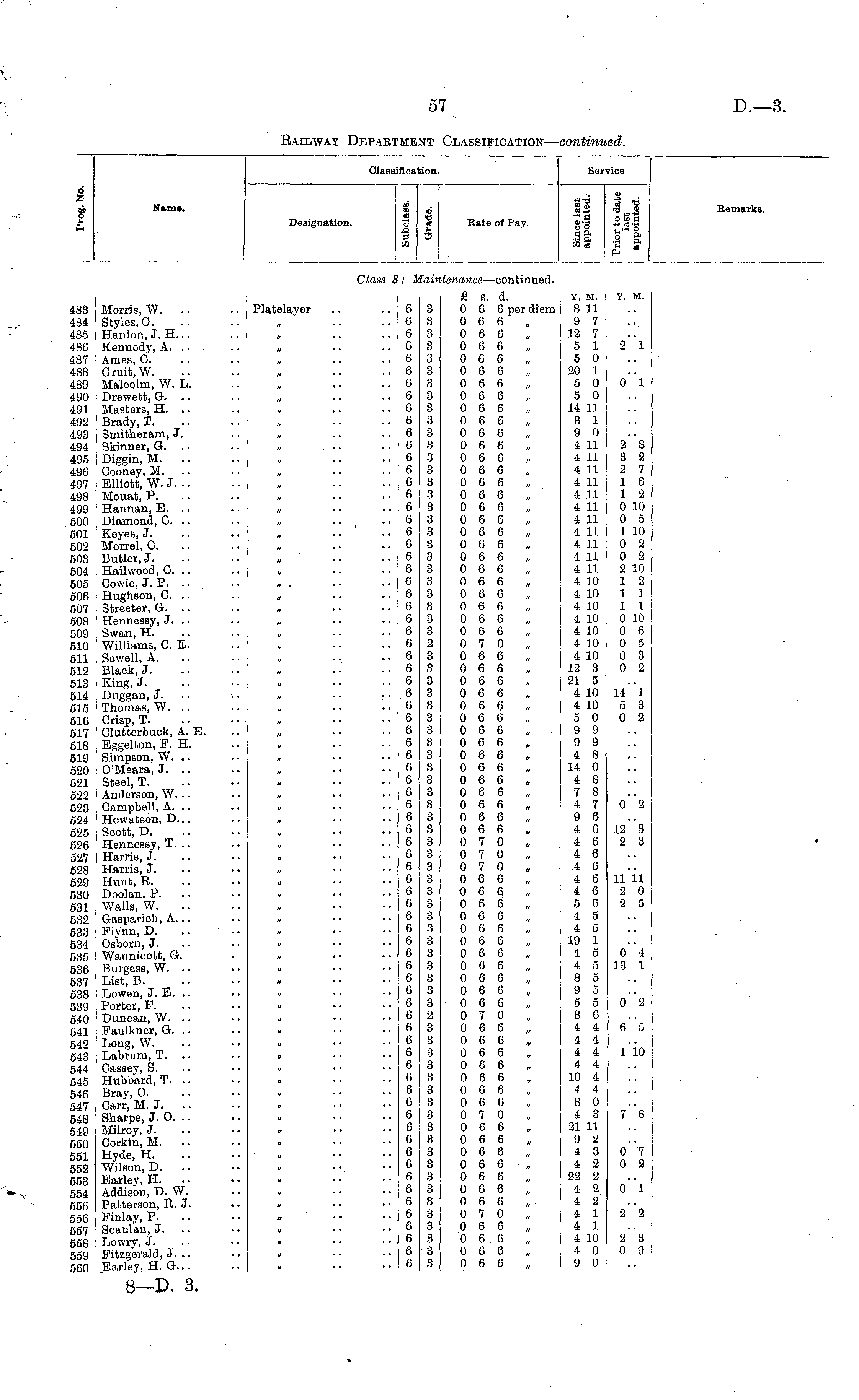 ut Name. o Designation. Classiflca! I 0Q Hon. I Rate of Pay Service Bemarke, Class , r ai. 'ai«i itenance —continued. : 83 ,84 =8.") .80 ,87 ,88 ,89 ,90 191 i92 L98 m [95 t9C [97 198 ,99 500 501 503 503 504 505 50G 507 i()S 509 510 ill 512 .18 >14 >1S ilC il7 il8 519 520 521 522 523 524 525 )26 >27 528 529 580 i31 >82 533 534 i3S 536 587 538 539 540 541 i42 543 i44 54.5 i<1 G i47 >4S i49 i50 551 152 i53 S54 555 556 557 >68 559 SCO :83 Morris, W. .. ,84 Styles, G. L85 Hanlon, J. H... ,86 Kennedy, A. .. ,87 Ames, C. tS8 Gruit, W. 189 Malcolm, W. L. 190 Drewett, G. .. L91 Masters, H. .. 192 Brady, T. 193 Smitheram, J. 194 Skinner, G. .. 195 Diggin, M. 196 Oooney, M. .. 197 Elliott, W. J. .. 198 Mouat, P. 199 Hannan, B. .. 100 Diamond, 0. .. 101 Keyes, J. 102 Morrel, O. iO8 Butler, J. >04 Hailwood, 0. .. iO5 Cowie, J. P. 506 Hughson, 0. .. i07 Streeter, G. .. 508 Hennessy, J. .. 509 Swan, H. 110 Williams, O. B. 111 Sewell, A. 112 Black, J. 513 King, J. 514 Duggan, J. >15 Thomas, W. .. 116 Crisp, T. 117 Glutterbuck, A. B. 518 Eggelton, F. H. 519 Simpson, W. .. 520 O'Meara, J. .. 521 Steel, T. 522 Anderson, W. .. 523 Campbell, A. .. 524 Howatson, D... 525 Soott, D. 526 Hennessy, T. .. i27 Harris, J. 528 Harris, 3. 529 Hunt, E. 530 Doolan, P. 531 Walls, W. 532 Gasparich, A... 533 Flynn, D. 534 Osborn, J. 535 Wannicott, G. 536 Burgess, W. .. 537 List, B. 538 Lowen, J. E. 539 Porter, F. 540 Duncan, W. .. 541 Faulkner, G. .. 542 Long, W. 543 Labrum, T. .. 544 Cassey, S. 545 Hubbard, T. .. 546 Bray, 0. 547 Carr, M. J. 548 Sharpe, J. O. 549 Milroy, J. 550 Corkin, M. 151 Hyde, H. 152 Wilson, D. 553 Earley, H. 154 Addison, D. W. 155 Patterson, B. J. 556 Finlay, P. 557 Scanlan, J. 558 Lowry, J. 559 Fitzgerald, J. .. 560 Earley, H. G... 8—D. 3. Platelayer it » 6 c> 6 6 6 6 6 6 6 G 6 6 6 6 6 0 6 G 6 6 6 6 6 6 6 6 6 6 6 6 6 6 G 6 6 6 G 6 6 C 6 6 6 6 6 6 6 6 6 6 6 6 G 6 6 6 6 G G C G 6 6 6 6 6 6 G 6 6 6 6 6 G 6 6 G 6 3 S 8 8 3 3 3 3 3 8 3 3 3 3 3 3 3 3 3 8 3 3 3 3 3 3 3 2 3 3 3 3 3 3 8 3 3 3 3 3 3 3 3 3 3 3 3 3 3 3 3 3 3 8 3 3 3 2 3 3 3 3 3 3 3 3 3 3 3 3 3 3 3 3 3 3 3 3 3 3 3 3 3 3 3 3 3 3 3 3 3 3 3 3 3 3 3 3 3 3 3 3 3 3 3 2 3 3 3 3 3 3 3 3 3 3 3 3 3 3 3 3 3 3 3 3 3 3 3 3 3 3 3 3 3 2 3 3 3 3 3 3 3 3 3 3 3 3 3 3 3 3 3 3 3 3 £ s. a. 0 6 6 pet diem 0 6 6 0 6 6 0 6 6 0 6 6 0 6 6 0 6 6 0 6 6 0 6 6 0 6 6 0 6 6 0 6 6 0 6 6 0 6 6 0 6 6 0 6 6 0 6 6 0 6 6 0 6 6 0 6 6 0 6 6 0 6 6 0 6 6 0 6 6 0 6 6 0 6 6 0 6 6 0 7 0 0 6 6 0 6 6 0 6 6 0 6 6 0 6 6 0 6 6 0 6 6 0 6 6 0 6 6 0 6 6 0 6 6 „ 0 6 6 0 6 6 0 6 6 0 6 6 0 7 0 0 7 0 0 7 0 0 6 6 0 6 6 0 6 6 0 6 6 0 6 6 0 6 6 0 6 6 0 6 6 0 6 6 0 6 6 0 6 6 0 7 0 0 6 6 0 6 6 0 6 6 0 6 6 0 6 6 0 6 6 0 6 6 0 7 0 0 6 6 0 6 6 0 6 6 0 6 6 0 6 6 0 6 6 0 6 6 0 7 0 0 6 6 0 6 6 0 6 6 0 6 6 Y. M. 8 11 9 7 12 7 5 1 5 0 20 1 5 0 5 0 14 11 8 1 9 0 4 11 4 11 4 11 4 11 i 11 4 11 4 11 4 11 4 11 4 11 4 11 4 10 4 10 4 10 4 10 4 10 4 10 4 10 12 3 21 5 4 10 4 10 5 0 9 9 9 9 4 8 14 0 4 8 7 8 4 7 9 6 4 6 4 6 4 6 .4 6 4 6 4 6 5 6 4 5 4 5 19 1 4 5 4 5 8 5 9 5 5 5 8 6 4 4 4 4 4 4 4 4 10 4 4 4 8 0 4 3 21 11 9 2 4 3 4 2 22 2 4 2 4 2 4 1 4 1 4 10 4 0 9 0 Y. M. 2 1 0 1 2 8 3 2 2 7 1 6 1 2 0 10 0 5 1 10 0 2 0 2 2 10 1 2 1 1 1 1 0 10 0 6 0 5 0 3 0 2 14 1 5 3 0 2 o'"2 12"8 2 3 11 11 2 0 2 5 0 4 13 1 0*2 6"5 l'io II 7 8 o'*7 0 2 II 0 1 it 2~2 2 3 0 9 II