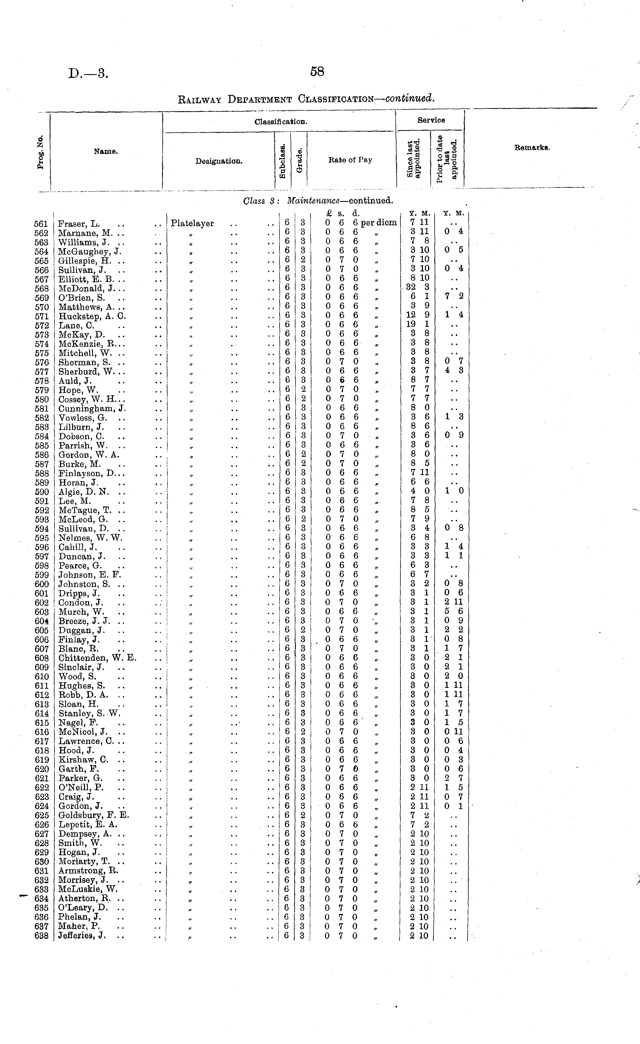 Classification. Service d t Name. Designation. J *S DO Rate of Pay ti It ■"■ fl o to q 39 I S Remarks. CZass 3; Maint tenance —continued. 561 562 563 564 565 566 567 568 569 570 571 572 573 574 575 576 577 578 579 580 581 582 583 584 585 586 587 588 589 590 591 592 593 594 595 596 597 598 599 600 601 602 603 604 605 606 607 608 609 610 611 612 613 614 615 616 617 618 619 620 621 622 623 624 625 626 627 628 629 630 631 632 633 634 635 636 637 638 I Fraser, L. Marnane, M. .. Williams, J. .. McGaughey, J. Gillespie, H. .. ■ Sullivan, J. Elliott, E. B. .. McDonald, J. .. O'Brien, S. ] Matthews, A. .. : Huckstep, A. 0. Lane, C. McKay, D. .. ; McKenzie, E... I Mitchell, W. .. Sherman, S. .. Sherburd, W. .. Auld, J. Hope, W. Cossey, W. H... Cunningham, J. Vowless, G. Lilburn, J. Dobson, C. Parrish, W. .. Gordon, W. A. Burke, M. Finlayson, D... Horan, J. Algie, D. N, .. Lee, M. i McTague, T. .. McLeod, G. .. Sullivan, D. .. Nelmes, W. W. Cahill, J. Duncan, J. Pearce, G. Johnson, E. F. Johnston, S. .. j Dripps, J. i Condon, J. Murch, W. .. Breeze, J. J. Duggan, J. Finlay, J. Blanc, E. Chittenden, W. E. Sinclair, J. Wood, S. Hughes, S. .. Eobb, D. A. Sloan, H. Stanley, S. W. Nagel, F. McNicol, J. .. Lawrence, C. .. Hood, J. Kirshaw, C. .. Garth, P. Parker, G. O'Neill, P. .. Craig, J. Gordon, J. Goldsbury, P. E. Lepetit, E. A. Dempsey, A. .. Smith, W. Hogan, J. Moriarty, T. .. Armstrong, E. Morrisey, J. .. McLuskie, W. Atherton, E. .. O'Leary, D. .. Phelan, J. Maher, P. Jefferies, J. Platelayer .. .. 6 ! 3 ..6 3 ..6 3 ..6 3 ..6 2 ..63 ..6 3 ..6 3 ..6 3 ..6 3 ..6 3 ..6 3 ..6 3 ..6 3 ..6 3 ..6 3 ..6 3 ..6 3 ..6 2 ..6 2 ..6 3 ..6 3 ..6 3 ..6 3 ..6 3 ..6 2 ..6 2 ..6 3 ..6 3 ..6 3 ..6 3 ■ ■6 3 ..6 2 • •6 3 ..6 3 ..6 3 ..6 3 ..6 3 ..6 3 ..6 3 ..6 3 ..6 3 ..6 3 ..6 8 ■•6 2 ..6 3 ..6 3 ..6 3 ..6 3 ■•6 3 , . .. ..6 3 ..6 3 ..6 3 ...6 3 ..6 3 ..6 2 ..6 3 ..6 3 ..6 3 ..6 3 ..6 3 ..6 3 ..6 3 ..6 3 ..6 2 ..6 3 ..6 3 ..6 3 ..6 3 ..6 3 ..6 3 ..6 3 ..6 3 ..63 ..6 3 ..63 ..63 ..6 3 6 6 6 6 G (1 6 6 0 6 6 6 6 6 G 6 6 a 6 (i 6 G 6 6 6 6 6 (i 6 6 6 6 6 6 6 6 6 6 (i 6 6 6 6 6 6 6 6 6 6 6 6 6 6 6 6 6 0 6 6 G 6 6 6 6 6 6 6 6 6 6 6 6 6 G 6 6 6 C 3 3 3 3 2 3 3 3 3 3 3 3 8 3 3 3 3 3 2 2 3 3 3 3 3 2 2 8 3 3 3 3 2 3 3 3 3 3 S 3 3 3 8 3 2 3 3 3 3 3 3 3 8 S 8 2 3 8 3 3 3 3 3 3 2 3 3 3 3 3 3 3 3 3 3 3 3 3 £ s. a. 0 6 6 per diem 0 6 6 0 6 6 0 6 6 0 7 0 0 7 0 0 6 6 0 6 6 0 6 6 0 6 6 0 6 6 0 6 6 0 6 6 0 6 6 0 6 6 0 7 0 0 6 6 0 6 6 0 7 0 0 7 0 0 6 6 0 6 6 0 6 6 0 7 0 0 6 6 0 7 0 0 7 0 0 6 6 0 6 6 0 6 6 0 6 6 0 6 6 0 7 0 0 6 6 0 6 6 0 6 6 0 6 6 0 6 6 0 6 6 0 7 0 0 6 6 0 7 0 0 6 6 0 7 0 ■„ 0 7 0 0 6 6 0 7 0 0 6 6 0 6 6 0 6 6 0 6 6 0 6 6 0 6 6 0 6 6 0 6 6' „ 0 7 0 0 6 6 0 6 6 0 6 6 0 7 0 0 6 6 0 6 6 0 6 6 0 6 6 0 7 0 0 6 6 0 7 0 0 7 0 0 7 0 0 7 0 0 7 0 0 7 0 0 7 0 0 7 0 0 7 0 0 7 0 0 7 0 0 7 0 Y. M. Y. M. 7 11 3 11 0 4 7 8 3 10 0 5 7 10 3 10 0 4 8 10 32 3 6 1 7 2 3 9 12 9 14 19 1 3 8 3 8 3 8 3 8 0 7 3 7 4 3 8 7 7 7 7 7 8 0 3 6 13 8 6 3 6 0 9 3 6 8 0 8 5 7 11 6 6 4 0 10 7 8 8 5 7 9 3 4 0 8 6 8 3 3 14 3 3 11 6 3 6 7 3 2 0 8 3 1 0 6 3 1 2 11 3 1 5 6 3 1 0 9 3 1 2 2 3 10 8 3 1 17 3 0 2 1 3 0 2 1 3 0 2 0 3 0 1 11 3 0 1 11 3 0 17 3 0 17 3 0 15 3 0 0 11 3 0 0 6 3 0 0 4 3 0 0 3 3 0 0 6 3 0 2 7 2 11 15 2 11 0 7 2 11 0 1 7 2 7 2 2 10 2 10 2 10 2 10 2 10 2 10 2 10 2 10 2 10 2 10 2 10 I 2 10