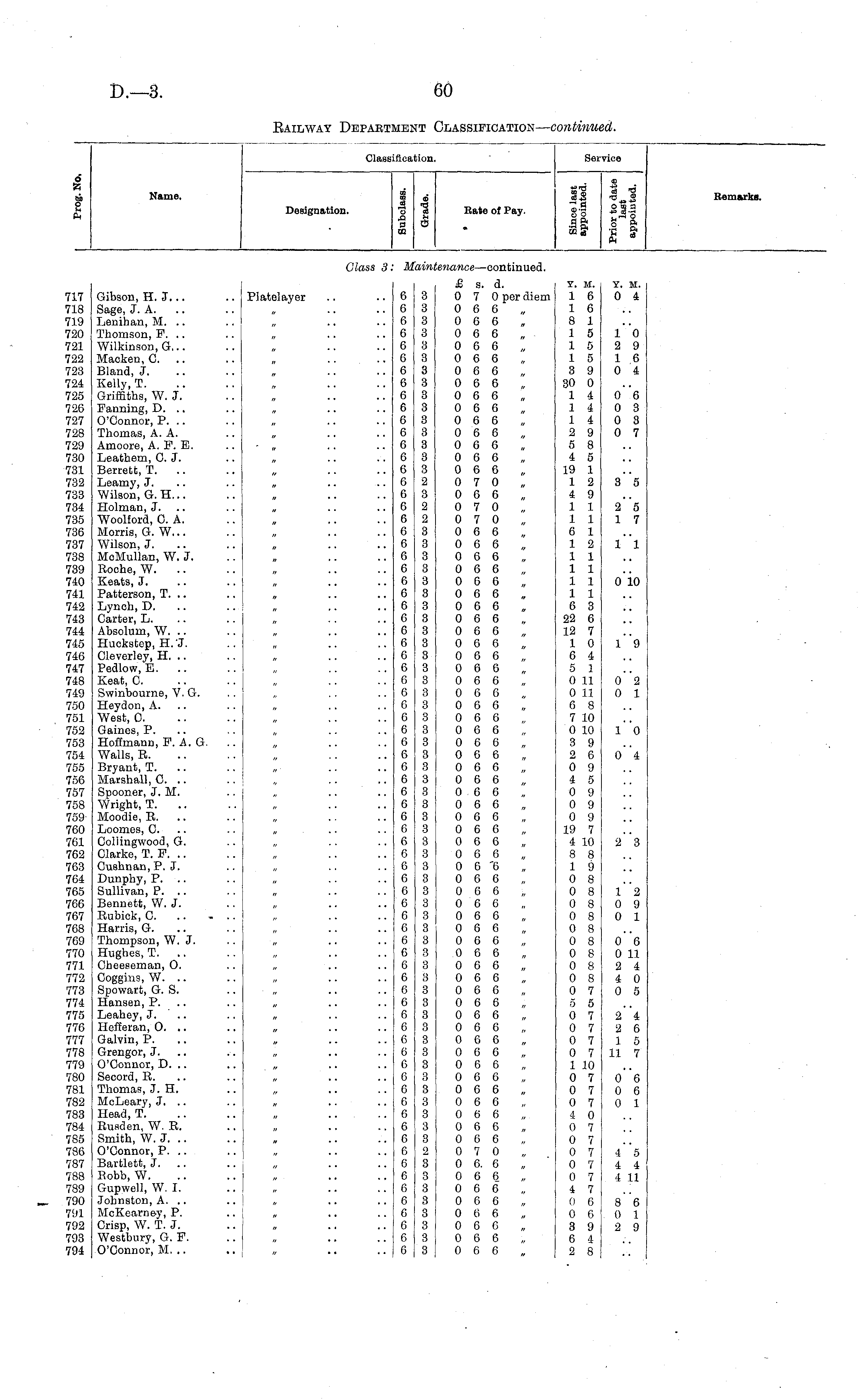 Clas: iflcal lion. Service d Name. I to 1° g ft ■Is , I" I Remarks. Designation. Rate of Pay. Glass 3 r .aim ienance —continued. 717 718 719 720 721 722 723 724 725 726 727 728 729 730 731 732 733 734 735 736 737 738 739 740 741 742 743 744 745 746 747 748 749 750 751 752 753 754 755 756 757 758 759 760 761 762 763 764 765 766 767 768 769 770 771 772 773 774 775 776 777 778 779 780 781 782 783 784 785 786 787 788 789 790 7'Jl 792 793 794 Gibson, H. J. .. Sage, J. A. Lenihan, M. .. Thomson, P. .. Wilkinson, G... Macken, 0. Bland, 3. Kelly, T. Griffiths, W. J. Fanning, D. .. O'Connor, P. .. Thomas, A. A. Amoore, A. F. E. Leathern, 0. J. Berrett, T. Leamy, J. Wilson, G. H... Holman, J. Woolford, C. A. Morris, G. W... Wilson, J. McMullan, W. J. Roche, W. Keats, J. Patterson, T. .. Lynch, D. Carter, L. Absolum, W. .. Huokstep, H. J. Cleverley, H. .. Pedlow, E. Keat, C. Swinbourne, V. G. Heydon, A. West, C. Games, P. Hoffmann, P. A. G. Walls, E. Bryant, T. Marshall, C. .. Spooner, J. M. Wright, T. Moodie, R. Loonies, C. Collingwood, G. Clarke, T. F. Cushnan, P. J. Dunphy, P. Sullivan, P. .. Bennett, W. J. Rubick, C. Harris, G. Thompson, W. J. Hughes, T. .. Cheeseman, 0. Coggins, W. .. Spowart, G. S. Hansen, P. Leahey, J. .. Hefferan, 0. .. Galvin, P. Grengor, J. O'Connor, D. .. Secord, R. Thomas, J. H. McLeary, J. .. Head, T. Rusden, W. R. Smith, W. J". .. O'Connor, P. .. Bartlett, J. .. Robb, W. Gupwell, W. I. Johnston, A. .. McKearney, P. Crisp, W. T. J. Westbury, G. F. O'Connor, M. .. Platelayer e G 6 6 G 6 G 6 G C 6 G G G 6 G G G 6 6 G 6 G G 6 G G 6 6 G 6 G 6 6 6 6 G 6 6 G 6 6 6 6 G 6 6 6 6 6 G 6 6 6 6 6 6 6 G 6 6 6 6 6 6 6 6 6 G 6 6 0 G 6 6 6 6 6 3 3 3 3 3 3 3 3 3 3 3 3 3 3 3 2 3 2 2 3 8 3 3 3 3 3 3 3 3 3 3 3 3 3 3 3 3 3 3 3 3 3 3 3 3 3 3 3 3 3 ■■', 3 3 3 3 3 3 3 3 3 3 3 3 3 3 3 3 3 3 .; 3 3 3 3 3 3 3 3 £ a. d. 0 7 0 per diem 0 6 6 0 6 6 0 6 6 0 6 6 0 6 6 0 6 6 0 6 6 0 6 6 0 6 6 0 6 6 0 6 6 0 6 6 0 6 6 0 6 6 0 7 0 0 6 6 0 7 0 0 7 0 0 6 6 0 6 6 0 6 6 0 6 6 0 6 6 0 6 6 0 6 6 0 6 6 0 6 6 0 6 6 0 6 6 0 6 6 0 6 6 0 6 6 0 6 6 0 6 6 0 6 6 0 6 6 0 6 6 0 6 6 0 6 6 0 6 6 0 6 6 0 6 6 0 6 6 0 6 6 0 6 6 0 6 "6 0 6 6 0 6 6 0 6 6 0 6 6 0 6 6 0 6 6 0 6 6 0 6 6 0 6 6 0 6 6 0 6 6 0 6 6 0 6 6 0 6 6 0 6 6 0 6 6 0 6 6 0 6 6 0 6 6 0 6 6 0 6 6 0 6 6 0 7 0 0 6. 6 0 6 6 0 6 6 0 6 6 0 6 6 0 6 0 0 6 6 0 6 6 Y. M. 1 6 1 6 8 1 1 5 1 5 1 5 3 9 30 0 1 4 1 4 1 4 2 9 5 8 4 5 19 1 1 2 4 9 1 1 1 1 6 1 1 2 1 1 1 1 1 1 1 1 6 3 22 6 12 7 1 0 6 4 5 1 0 11 0 11 G 8 7 10 0 10 3 9 2 6 0 9 4 5 0 9 0 9 0 9 19 7 4 10 8 8 1 9 0 8 0 8 0 8 0 8 0 8 0 8 0 8 0 8 0 8 0 7 5 5 0 7 0 7 0 7 0 7 1 10 0 7 0 7 0 7 4 0 0 7 0 7 0 7 0 7 0 7 4 7 0 6 0 6 3 9 6 4 2 8 Y. M. 0 4 1 0 2 9 1 6 0 4 0 6 0 3 0 3 0 7 3"5 2"5 1 7 1 1 0 10 1 9 o"2 0 1 10 0 4 2"3 1 2 0 9 0 1 0 6 0 11 2 4 4 0 0 5 2 4 2 6 1 5 11 7 0 6 0 6 0 1 4 5 4 4 4 11 8 6 0 1 2 9