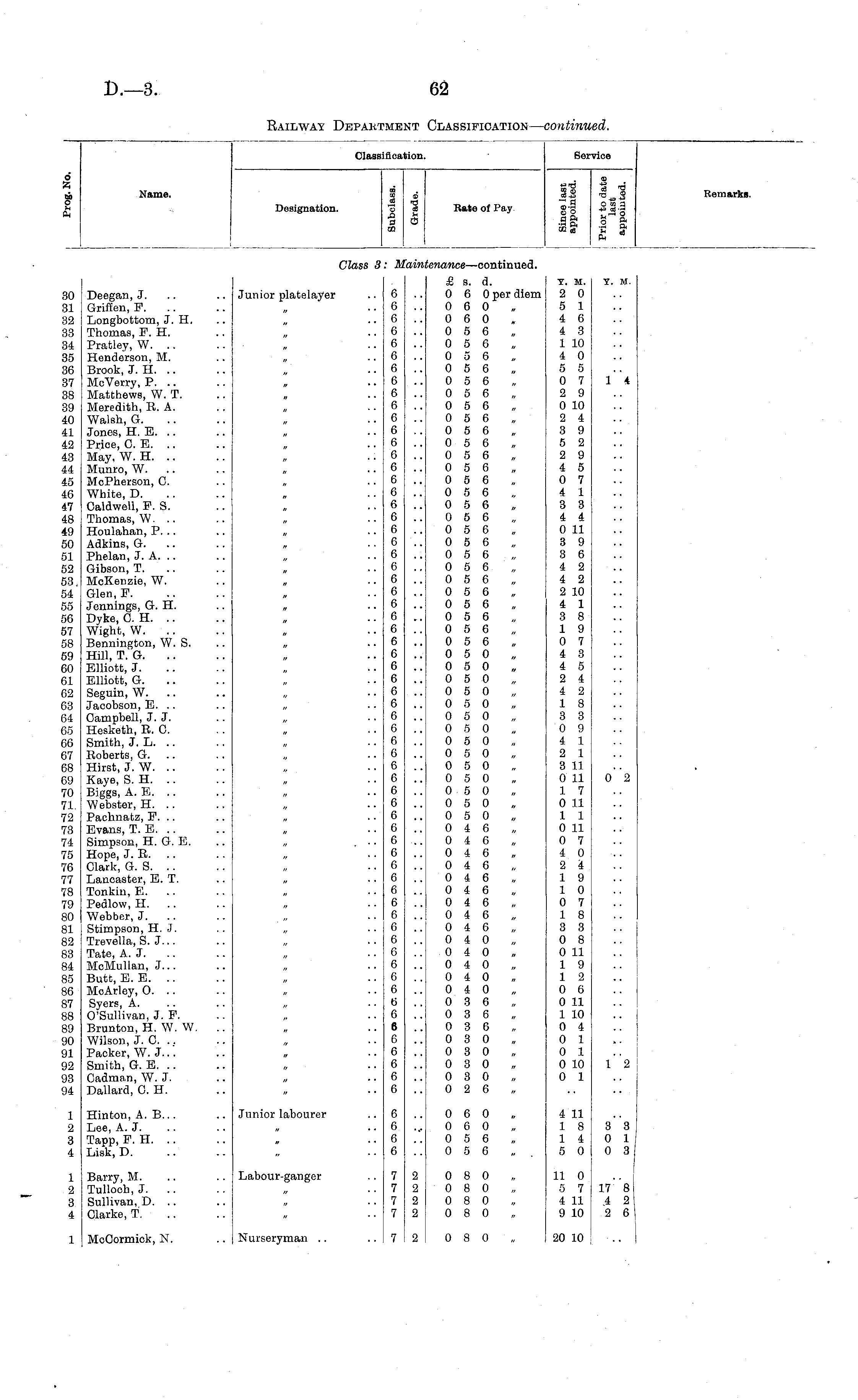 Classification. Sβ] :vioe 6 i Name. Designation. ■° & no Rale of Pay "•a 3-g ii 5 a 33 S , 1 J £3-3 n Remarks. Class 3 r aini ienance —oontinued. 30 81 82 83 34 35 36 37 38 39 40 41. 42 43 44 45 46 47 48 49 50 51 52 53 54 55 56 57 58 59 60 6J 62 63 64 65 GG 67 68 69 70 71 72 73 74 75 7G 77 78 79 SO 81 82 83 84 85 86 87 8S 89 90 91 92 93 94 Deegan, J. Griffen, F. Longbottom, J. H. Thomas, P. H. Pratley, W. .. Henderson, M. Brook, J. H. MoVerry, P. .. Matthews, W. T. Meredith, R. A. Walsh, G. Jones, H. E. Price, O. B. May, W. H. Munro, W. McPherson, C. White, D. Caldwell, P. S. Thomas, W. Houlahan, P. .. Adkins, G. Phelan, J. A. Gibson, T. McKenzie, W. Glen, P. Jennings, G. H. Dyke, O. H. Wight, W. .. Bennington, W. S. Hill, T. G. Elliott, J. Elliott, G. Seguin, W. Jaoobson,E. .. Campbell, J. J. Hesketh, R. C. Smith, J. L. Roberts, G. .. Hirst, J. W. .. Kaye, S. H. Biggs, A. E. .. Webster, H. .. Pachnatz, P. .. Evans, T. E. Simpson, H. G. E. Hope, J. R. Clark, G. S. Lancaster, E. T. Tonkin, E. .. Pedlow, H. .. Webber, J. Stimpson, H. J. Trevella, S. J... Tate, A. J. McMullan, J... Butt, E. E. .. MoArley, O. .. Syers, A. O'Sullivan, J. P. Brunton, H. W. W. Wilson, J. C. Packer, W. J... Smith, G. E. Cadman, W. J. Dallard, C. H. Junior platelayer n 6 (i 6 6 6 6 6 6 6 6 6 (5 6 6 6 G 6 G 6 c 6 G 6 G 6 6 6 6 6 6 6 6 6 6 6 6 6 6 6 6 6 C 6 (i 6 6 6 6 6 6 6 6 6 6 6 6 G i; 6 6 6 6 0 G 6 £ s. d. 0 6 0 per diem 0 6 0 0 6 0 0 5 6 0 5 6 0 5 6 0 5 6 0 5 6 0 5 6 0 5 6 0 5 6 0 5 6 0 5 6 0 5 6 0 5 6 0 5 6 0 5 6 0 5 6 0 5 6 0 5 6 0 5 6 0 5 6 0 5 6 0 5 6 0 5 6 0 5 6 0 5 6 0 5 6 0 5 6 0 5 0 0 5 0 0 5 0 0 5 0 0 5 0 0 5 0 0 5 0 0 5 0 0 5 0 0 5 0 0 5 0 0 5 0 0 5 0 0 5 0 0 4 6 0 4 6 0 4 6 0 4 6 0 4 6 0 4 6 0 4 6 0 4 6 0 4 6 0 4 0 0 4 0 0 4 0 0 4 0 0 4 0 0 3 6 0 3 6 0 3 6 0 3 0 0 3 0 0 3 0 0 3 0 0 2 6 T. M. 2 0 5 1 4 6 4 3 1 10 4 0 5 5 0 7 2 9 0 10 2 4 3 9 5 2 2 9 4 5 0 7 4 1 3 3 4 4 0 11 3 9 3 6 4 2 4 2 2 10 4 1 3 8 1 9 0 7 4 3 4 5 2 4 4 2 1 8 3 3 0 9 4 1 2 1 3 11 0 11 1 7 0 11 1 1 0 11 0 7 4 0 2 4 1 9 1 0 0 7 1 8 3 3 0 8 0 11 1 9 1 2 0 6 0 11 1 10 0 4 0 1 0 1 0 10 0 1 T. M. 1 4 0 2 1 2 1 2 3 4 Hinton, A. B... Lee, A. J. Tapp, P. H. Lisk, D. Junior labourer r> 6 6 6 • •• 0 6 0 0 6 0 0 5 6 0 5 6 4 11 1 8 1 4 5 0 3 3 0 1 0 3 1 2 3 4 Barry, M. Tullooh, J. Sullivan, D. .. Clarke, T. Labour-ganger 7 7 7 7 2 2 2 2 0 8 0 0 8 0 0 8 0 0 8 0 11 0 5 7 4 11 9 10 17 8 4 2 2 6 1 McCormick, N. Nurseryman .. 7 2 0 8 0 20 10