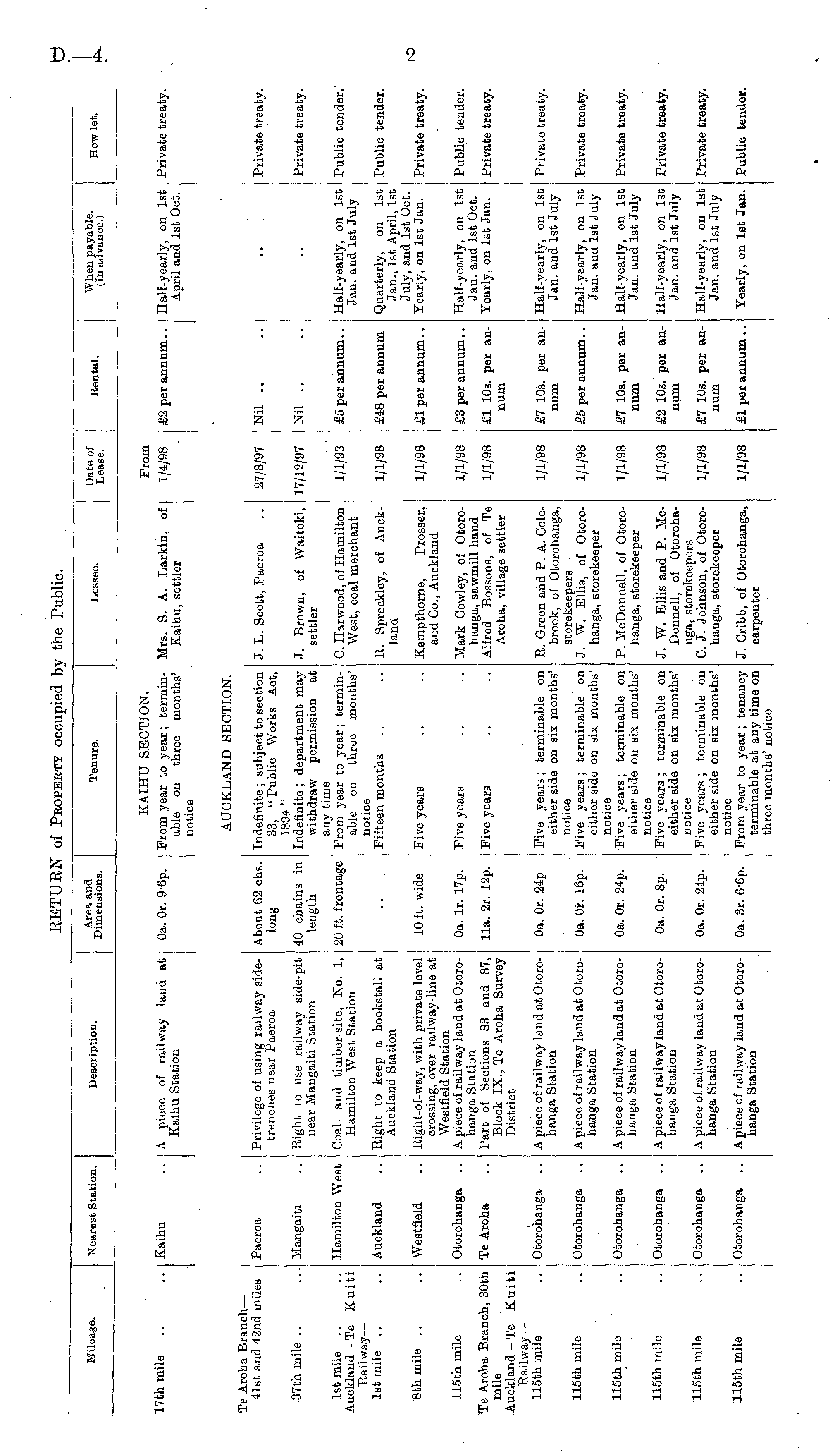 Mileage. Nearest Station. Description. Area and Dimensions. Tenure. Lessee. Date of Lease. Rental. When payable. (In advance.) How let. KAIHU SECTION. From 17th mile .. .. Kaihu .. A piece of railway land at Kaihu Station 0a. Or. 96p. Prom year to year; terminable on three months' notice Mrs. S. A. Larkin, of Kaihu, settler 1/4/98 £2 per annum.. Half-yearly, on 1st April and 1st Oct. Private treaty. Tβ Aroha Branch — 41st and 42nd miles Paeroa .. Privilege of using railway sidetrenehes near Paeroa About 62 chs. long AUCKLAND SECTION. J. L. Scott, Paeroa Private treaty. Indefinite ; subject to section 33, "Public Works Act, 1894 " Indefinite ; department may withdraw permission at any time Prom year to year ; terminable on three months' notice Fifteen months 27/8/97 Nil .. 37th mile .. ... Mangaiti .. Right to use railway side-pit near Mangaiti Station 40 chains in length J. Brown, of Waitoki, settler 17/12/97 Nil .. Private treaty. 1st mile .. .. Hamilton West Coal- and timber-site, No. 1, Auckland -Te Kuiti Hamilton West Station Railway — 1st mile .. .. Auckland .. Eight to keep a bookstall at Auckland Station 20 ft. frontage C. Harwood, of Hamilton West, coal merchant 1/1/93 £5 per annum.. Half-yearly, on 1st Jan. and 1st July Public tender. R. Spreckley, of Auckland 1/1/98 £48 per annum Quarterly, on 1st Jan., 1st April, 1st July, and 1st Oct. £1 per annum.. Yearly, on 1st Jan. Public tender. 8th mile .. .. Westfield .. Right-of-way, with private level crossing, over railway-line at Westfleld Station 115th mile .. Otorohanga .. A piece of railway land at Otorohanga Station Te Aroha Branch, 30th Te Aroha .. Part of Sections 83 and 87, mile Block IX., Te Aroha Survey Auckland - Te Kuiti District Railway — 115th mile .. Otorohanga .. Apiece of railway land at Otorohanga Station 10 ft. wide Five years Kempthorne, Prosser, and Co., Auckland 1/1/98 Private treaty. 0a. lr. 17p. Five years Mark Cowley, of Otorohanga, sawmill hand Alfred Bossons, of Te Aroha, village settler 1/1/98 £3 per annum.. Half-yearly, on 1st Jan. and 1st Oct. £1 10s. per an- Yearly, on 1st Jan. num Public tender. lla. 2r. 12p. Five years 1/1/98 Private treaty. 0a. Or. 24p Five years; terminable on either side on six months' notice Five years; terminable on either side on six months' notice Five years; terminable on either side on six months' notice Five years ; terminable on either side on six months' notice Five years ; terminable on either side on six months' notice From year to year ; tenancy terminable at any time on three months' notice R. Green and P. A. Colebrook, of Otorohanga, storekeepers J. W. Ellis, of Otorohanga, storekeeper 1/1/98 £7 10s. per an- Half-yearly, on 1st num Jan. and 1st July Private treaty. 115th mile .. Otorohanga .. Apiece of railway land at Otorohanga Station 0a. Or. 16p. 1/1/98 £5 per annum.. Half-yearly, on 1st Jan. aud 1st July Private treaty. 115th mile .. Otorohanga .. A piece of railway landat Otorohanga Station 0a. Or. 24p. P. McDonnell, of Otorohanga, storekeeper 1/1/98 £7 10s. per an- Half-yearly, on 1st num Jan. and 1st July Private treaty. 115th mile .. Otorohanga .. A piece of railway land at Otorohanga Station 0a. Or. 8p. J. W. Ellis and P. McDonnell, of Otorohanga, storekeepers C. J. Johnson, of Otorohanga, storekeeper 1/1/98 £2 10s. per an- Half-yearly, on 1st num Jan. and 1st July Private treaty. 115th mile .. Otorohanga .. A piece of railway land at Otorohanga Station 0a. Or. 24p. 1/1/98 £7 10s. per an- Half-yearly, on 1st num Jan. and 1st July Private treaty. 115th mile .. Otorohanga .. A piece of railway land at Otorohanga Station 0a. 3r. 6-6p. J. Cribb, of Otorohanga, carpenter 1/1/98 £1 per annum .. Yearly, on 1st Jan. Public tender.
