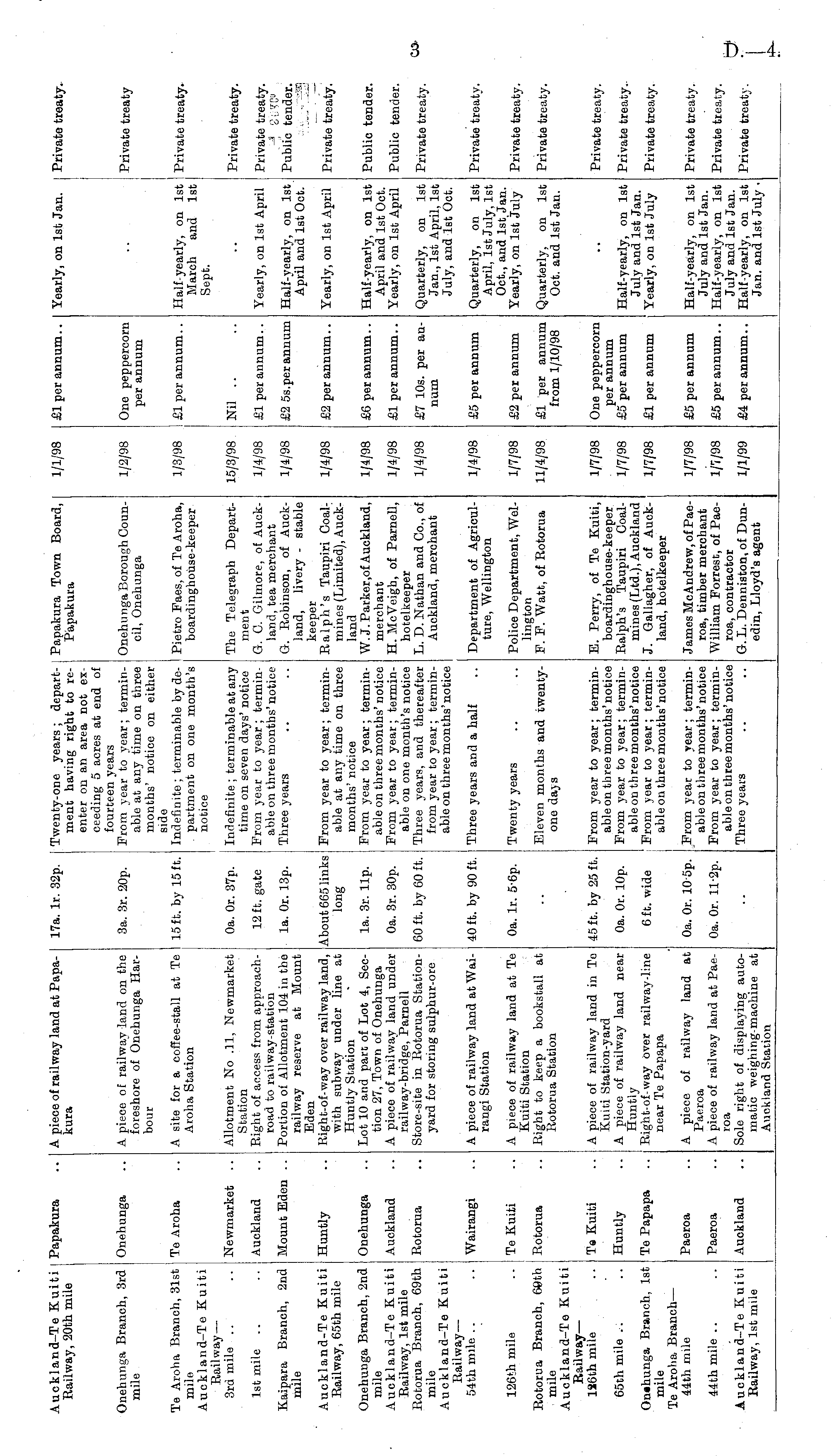 Auckland-Te Kuiti Railway, 20th mile Papakura A piece of railway land at Papakura 17a. lr. 32p. Twenty-one years; department having right to reenter on an area not exceeding 5 acres at end of fourteen years From year to year; terminable at any time on three months' notice on either side Indefinite ; terminable by department on one month's notice Papakura Town Board, Papakura 1/1/98 £1 per annum.. Yearly, on 1st Jan. Private treaty. Onehunga Branch, 3rd mile Onehunga A piece of railway land on the foreshore of Onehunga Harbour 3a. 3r. 20p. Onehunga Borough Council, Onehunga 1/2/98 One peppercorn per annum Private treaty Te Aroha Branch, 31st mile Auckland-Te Kuiti Railway — 3rd mile Tβ Aroha A site for a coffee-stall at Te Aroha Station 15 ft. by 15 ft. Pietro Faes, of Te Aroha, boardinghouse-keeper 1/3/98 £1 per annum.. Half-yearly, on 1st March and 1st Sept. Private treaty. Newmarket Allotment No .11, Newmarket Station Right of access from approachroad to railway-station Portion of Allotment 104 in the railway reserve at Mount Eden Right-of-way over railway land, with subway under line at Huntly Station Lot 10 and pare of Lot 4, Section 27, Town of Onehunga A piece of railway land under railway-bridge, Parnell Store-site in Rotorua Stationyard for storing sulphur-ore 0a. Or. 37p. Indefinite ; terminable at any time on seven days' notice From year to year ; terminable on three months' notice Three years The Telegraph Department G. G. Gilmore, of Auckland, tea merchant G. Robinson, of Auckland, livery - stable keeper Ralph's Taupiri Coalmines (Limited), Auckland W. J. Parker, of Auckland, merchant H. McVeigh, of Parnell, hotelkeeper L. D. Nathan and Co., of Auckland, merchant 15/3/98 Nil .. Private treaty. 1st mile Auckland 12 ft. gate , 1/4/98 £1 per annum.. Yearly, on 1st April Private treaty. Public tender. Private treaty. Kaipara Branch, 2nd mile Mount Eden .. la. Or. 13p. 1/4/98 £2 5s.per annum Half-yearly, on 1st April and 1st Oct. Auckland-Te Kuiti Railway, 65th mile Huntly About 665 links long From year to year; terminable at any time on three months' notice From year to year; terminable on three months' notice From year to year; terminable on one month's notice Three years, and thereafter from year to year; terminable on three months' notice 1/4/98 £2 per annum.. Yearly, on 1st April Onehunga Branch, 2nd mile Auckland-Te Kuiti Railway, 1st mile Rotorua Branch, 69th mile Auckland-Te Kuiti Railway — 54th mile Onehunga la. 3r. lip. 1/4/98 £6 per annum.. Half-yearly, on 1st April and 1st Oct. Yearly, on 1st April Public tender. Auckland 0a. 3r. 30p. 1/4/98 £1 per annum.. Public tender. Rotorua 60 ft. by 60 ft. 1/4/98 £7 10s. per annum Quarterly, on 1st Jan., 1st April, 1st July, and 1st Oct. Private treaty. Wairangi A piece of railway land at Wairangi Station 40 ft. by 90 ft. Three years and a half Department of Agriculture, Wellington 1/4/98 £5 per annum Quarterly, on 1st April, 1st July, 1st Oct., and 1st Jan. Yearly, on 1st July Private treaty. 126th mile Te Kuiti A piece of railway land at Te Kuiti Station Right to keep a bookstall at Rotorua Station 0a. lr. 5-6p. Twenty years Police Department, Wellington F. F. Watt, of Rotorua 1/7/98 £2 per annum Private treaty. Rotorua Branch, 66th mile Auckland-Te Kuiti Railway — 126th mile Rotorua I Eleven months and twentyone days 11/4/98 £1 per annum from 1/10/98 Quarterly, on 1st Oct. and 1st Jan. Private treaty. Tβ Kuiti A piece of railway land in To Kuiti Station-yard A piece of railway land near Huntly Right-of-way over railway-line near Te Papapa 45 ft. by 25 ft. From year to year; terminableon threemonths'notice From year to year; terminable on three months'notice From year to year; terminableon threemonths'notice E. Perry, of Te Kuiti, boardinghouse-keeper Ralph's Taupiri Coalmines (Ltd.), Auckland J. Gallagher, of Auckland, hotelkeeper 1/7/98 One peppercorn per annum £5 per annum Private treaty. 65th mile Huntly 0a. Or. 10p. 1/7/98 Half-yearly, on 1st July and 1st Jan. Yearly, on 1st July Private treaty. Onehunga Branch, 1st mile Te Aroha Branch — 44th mile Te Papapa 6 ft. wide 1/7/98 £1 per annum Private treaty. Paeroa A piece of railway land at Paeroa A piece of railway land at Paeroa Sole right of displaying automatic weighing-machine at Auckland Station 0a. Or. 10-Sp. From year to year ; terminable on three months' notice From year to year; terminable on three months' notice Three yeai'S James McAndrew, of Paeroa, timber merchant William Forrest, of Paeroa, contractor G. L. Denniston, of Dunedin, Lloyd's agent 1/7/98 £5 per annum Half-yearly, on 1st July and 1st Jan. Half-yearly, on 1st July and 1st Jan. Half-yearly, on 1st Jan. and 1st July • Private treaty. 44th mile Paeroa 0a. Or. ll'2p. 1/7/98 £5 per annum.. Private treaty. Auckland-Te Kuiti Railway, 1st mile Auckland 1/1/99 £4 per annum.. Private treaty.