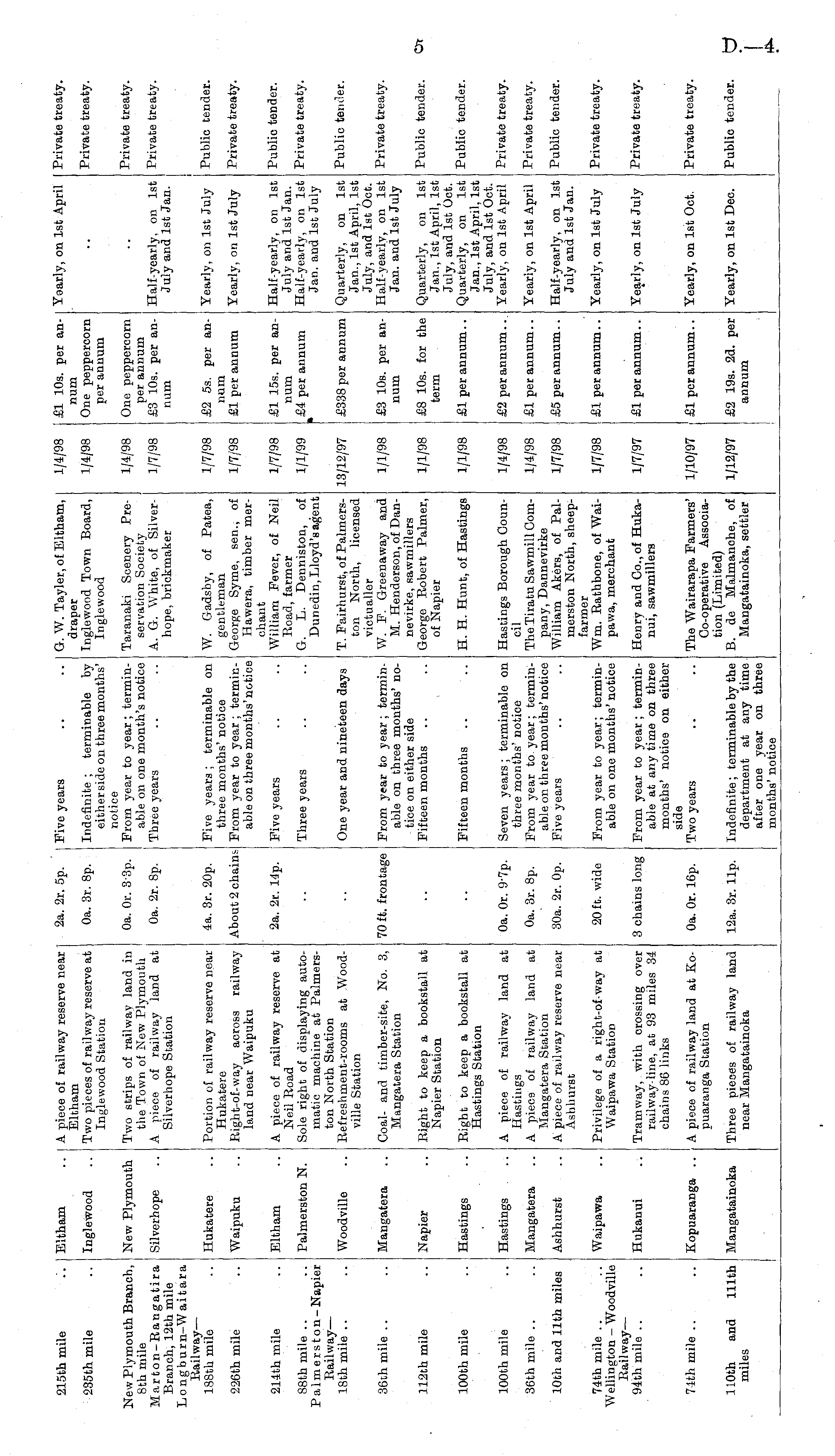 215th mile Eltham A piece of railway reserve near Eltham Two pieces of railway reserve at Inglewood Station 2a. 2r. 5p. Five years G. W. Tayler, of Eltham, draper Inglewood Town Board, Inglewood 1/4/98 £1 10s. per annum Yearly, on 1st April Private treaty. 235th mile Inglewood Oa. 3r. 8p. Indefinite ; terminable by either side on three months' notice From year to year; terminable on one month's notice Three years 1/4/98 One peppercorn per annum Private treaty. New Plymouth Branch, 8 th mile Marton-Rangatira Branch, 12th mile Long burn-Wai tar a Railway — 188th mile New Plymouth Two strips of railwav land in the Town of New Plymouth A pieca of railway land at Silverhope Station Oa. Or. 33p. Taranaki Scenery Preservation Society A. G. White, of Silverhope, bookmaker 1/4/98 One peppercorn per annum £3 10s. per annum Private treaty. Silverhope Oa. 2r. 8p. 1/7/98 Half-yearly, on 1st July and 1st Jan. Private treaty. Hukatere Portion of railway reserve near Hukatere Right-of-way across railway land near Waipuku 4a. 3r. 20p. Five years; terminable on three months' notice From year to year ; terminable on three months' notice W. Gadsby, of Patea, gentleman George Syme, sen., of Hawera, timber merchant William Fever, of Neil Road, farmer G. L. Dennistou, of Dunedin, Lloyd's agent 1/7/98 £2 5s. per annum £1 per annum Yearly, on 1st July Public tender. 226th mile Waipuku About 2 chains 1/7/98 Yearly, on 1st July Private treaty. 214th mile Eltham A piece of railway reserve at Neil Road Sole right of displaying automatic machine at Palmerston North Station Refreshment-rooms at Woodville Station 2a. 2r. 14p. Five years 1/7/98 £1 15s. per an-Half-yearly, on 1st July and 1st Jan. Half-yearly, on 1st Jan. and 1st July Public tender. 88th mile P a 1 m e r s t o n - Napier Railway — 18th mile Palmerston N. Three years 1/1/99 num £4 per annum Private treaty. Woodville One year and nineteen days T. Fairhurst, of Palmerston North, licensed victualler W. F. Greenaway and M. Henderson, of Dannevirke, sawmillers George Robert Palmer, of Napier 13/12/97 £338 per annum Quarterly, on 1st Jan., 1st April, 1st July, and 1st Oct. Half-yearly, on 1st Jan. and 1st July Public tender. 36th mile Mangatera Coal- and timber-site, No. 3, Mangatera Station 70 ft. frontage From year to year ; terminable on three months' notice on either side Fifteen months 1/1/98 £3 10a. per anPrivate treaty. num 112th mile Napier Right to keep a bookstall at Napier Station 1/1/98 £8 10s. for the term Quarterly, on 1st Jan., 1st April, 1st July, and 1st Oct. Quarterly, on 1st Jan., 1st April, 1st July, and 1st Oct. Yearly, on 1st April Public tender. 100th mile Hastings Right to keep a bookstall at Hastings Station Fifteen months H. H. Hunt, of Hastings 1/1/98 £1 per annum.. Public tender. 100th mile Hastings A piece of railway land at Hastings A piece of railway land at Mangatera Station A piece of railway reserve near Ashhurst Oa. Or. 9-7p. Seven years; terminable on three months' notice From year to year; terminable on three months' notice Five years Hastings Borough Council The Tiratu Sawmill Company, Dannevirke William Akers, of Palmerston North, sheepfarmer Wm. Rathbone, of Waipawa, merchant 1/4/98 £2 per annum.. Private treaty. 36th mile Mangatera Oa. 3r. 8p. 1/4/98 £1 per annum.. Yearly, on 1st April Private treaty. 10th and 11th miles Ashhurst 30a. 2r. Op. 1/7/98 £5 per annum.. Half-yearly, on 1st July and 1st Jan. Public tender. 74th mile Wellington - Woodville Railway — 94th mile .. Waipawa Privilege of a right-of-way at Waipawa Station 20 ft. wide From year to year; terminable on one months' notice 1/7/98 £1 per annum.. Yearly, on 1st July Private treaty. Hukanui Tramway, With crossing over railway- line, at 93 miles 34 chains 86 links 3 chains long From year to year ; terminable at any time on three months' notice on either side Two years Henry and Co., of Hukanui, sawmillers 1/7/97 £1 per annum.. Yearly, on 1st July Private treaty. 74th mile Kopuaranga .. A piece of railway land at Kopuaranga Station Oa. Or. 16p. The Wairarapa Farmers' Co-operative Association (Limited) B. de Malmanche, of Mangatainoka, settler 1/10/97 £1 per annum.. Yearly, on 1st Oct. Private treaty. 110th and 111th miles Mangatainoka Three pieces of railway land near Mangatainoka 12a. 3r. lip. Indefinite; terminable by the department at any time after one year on three months' notice 1/12/97 £2 19s. 2d. per annum Yearly, on 1st Dec. Public tender.