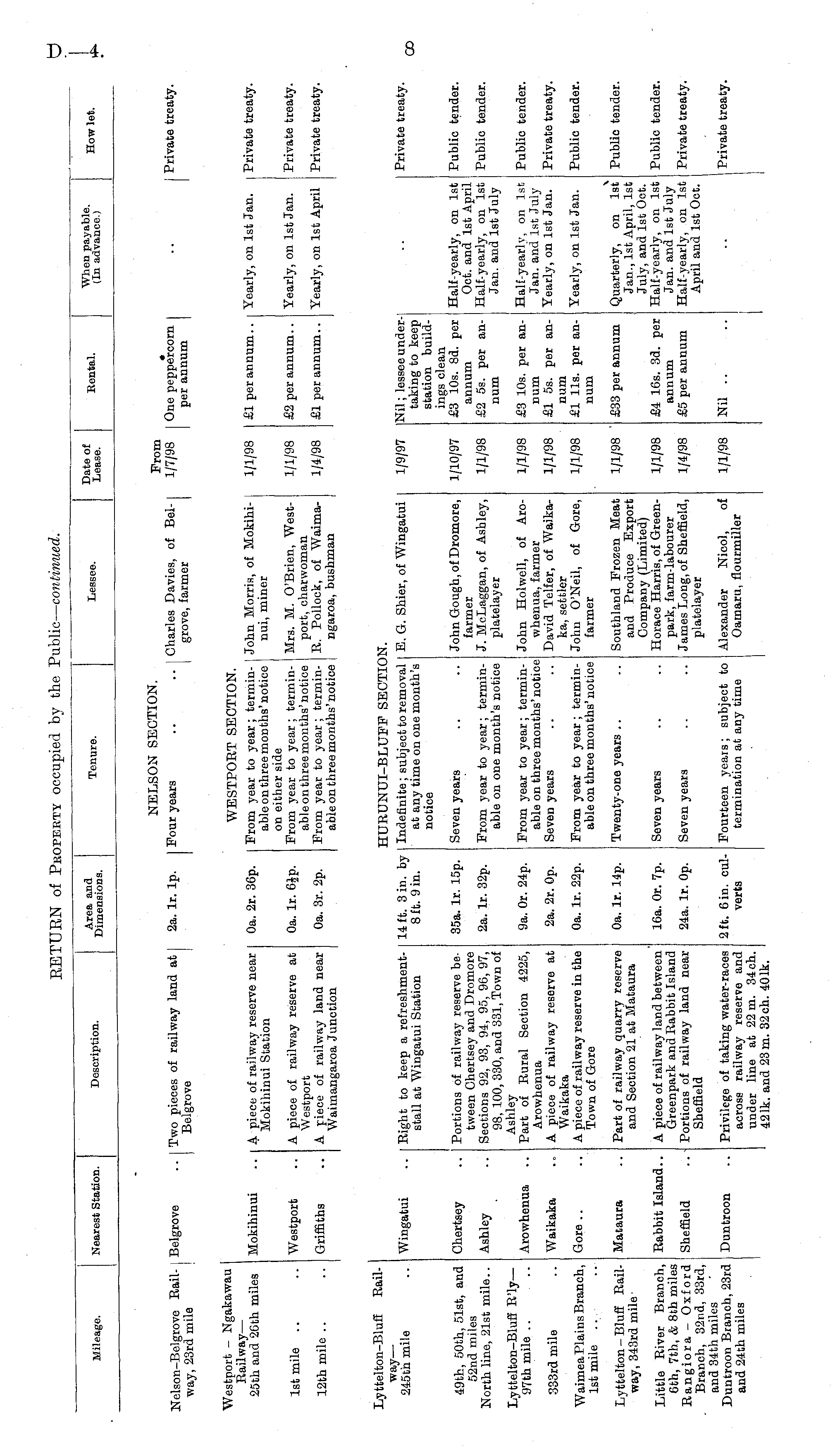 Mileage. Nearest Station. Description. Area and Dimensions. Tenure. Lessee. Date of Lease. Rental. When payable. (In advance.) How let. Belgrove NELSON SECTION. From 1/7/98 Nelson-Belgrove Railway, 23rd mile Two pieces of railway land at Belgrove 2a. lr. lp. Four years Charles Davies, of Belgrove, farmer One peppercorn per annum Private treaty. Westport - Ngakawau Eailway — 25th and 2Gth miles Mokihinui A piece of railway reserve near Mokihinui Station 0a. 2r. 36p. 0a. lr. 6£p. 0a. 3r. 2p. WESTPORT SECTION. From year to year; terminable on three mon ths' notice on either side From year to year; terminable on three months' notice From year to year ; terminable on three months' notice John Morris, of Mokihinui, miner £1 per annum.. Yearly, on 1st Jan. Private treaty. 1/1/98 1st mile Westport A piece of railway reserve at Westport A piece of railway land near Waimangaroa Junction Mrs. M. O'Brien, Westport, charwoman R. Pollock, of Waimangaroa, bushman 1/1/98 £2 per annum.. Yearly, on 1st Jan. Private treaty. 12th mile .. Griffiths 1/4/98 £1 per annum.. Yearly, on 1st April Private treaty. Lyttelton-Bluff Railway — 245th mile Wingatui Right to keep a refreshmentstall at Wingatui Station HURUNUI-BLUFF SECTIO 'N. 1/9/97 Nil; lessee undertaking to keep station buildings clean £3 10s. 8d. per annum £2 5s. per annum Private treaty. 14 ft. 3 in. by 8 ft. 9 in. Indefinite; subject to removal at any time on one month's notice E. G. Shier, of Wingatui 49th, 50th, 51st, and 52nd miles North line, 21st mile.. Chertsey Portions of railway reserve between Chertsey and Dromore Sections 92, 93, 94, 95, 96, 97, 98, 100, 330, and 331, Town of Ashley Part of Rural Section 4225, Arowhenua A piece of railway reserve at Waikaka A piece of railway reserve in the Town of Gore 35a. lr. 15p. Seven years John Gough, of Dromore, farmer J. McLaggan, of Ashley, platelayer 1/10/97 Half-yearly, on 1st Oct. and 1st April Half-yearly, on 1st Jan. and 1st July Public tender. Ashley 2a. lr. 32p. From year to year; terminable on one month's notice 1/1/98 Public tender. Lyttelton-Blufl R'ly— 97th mile .. Arowhenua 9a. Or. 24p. 2a. 2r. Op. From year to year; terminable on three months' notice Seven years John Holwell, of Arowhenua, farmer David Telfer, of Waikaka, settler John O'Neil, of Gore, farmer 1/1/98 £3 10s. per annum £1 5s. per annum £1 11s. per an-Half-yearly, on 1st Jan. and 1st, July Yearly, on 1st Jan. Public tender. 333rd mile Waikaka 1/1/98 Private treaty. Waimea Plains Branch, 1st mile Gore 0a. lr. 22p. From year to year; terminable on three months' notice 1/1/98 Yearly, on 1st Jan. Public tender. num Quarterly, on 1st Jan., 1st April, 1st July, and 1st Oct. Half-yearly, on 1st Jan. and 1st July Half-yearly, on 1st April and 1st Oct. Lyttelton - Blufi Railway, 343rd mile Mataura Part of railway quarry reserve and Section 21 at Mataura 0a. lr. 14p. Twenty-one years .. Southland Frozen Meat and Produce Export Company (Limited) Horace Harris, of Greenpark, farm-labourer James Long, of Sheffield, platelayer 1/1/98 ' £33 per annum Public tender. Little River Branch, 6th, 7th, & 8th miles Rangiora - Oxford Branch, 32nd, 33rd, and 34th miles Duntroon Branch, 23rd and 24th miles Rabbit Island.. A piece of railway land between Greenpark and Rabbit Island Portions of railway land near Sheffield 16a. Or. 7p. Seven years 1/1/98 £4 16s. 3d. per annum £5 per annum Public tender. Private treaty. Sheffield 24a. lr. Op. Seven years 1/4/98 Duntroon Privilege of taking water-races across railway reserve and under line at 22 m. 34ch. 421k. and 23 m. 32 oh. 401k. 2 ft. 6 in. culverts Fourteen years; subject to termination at any time Alexander Nicol, of Oamaru, flourmiller 1/1/98 Nil .. Private treaty.
